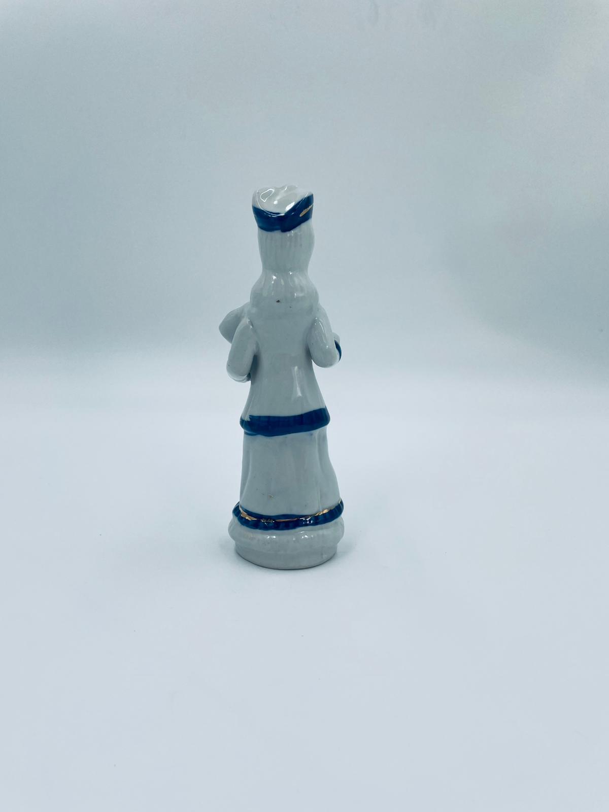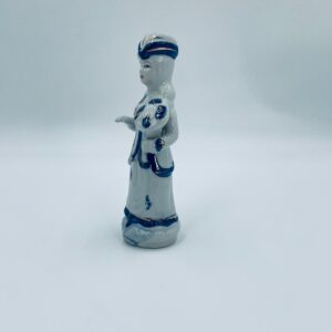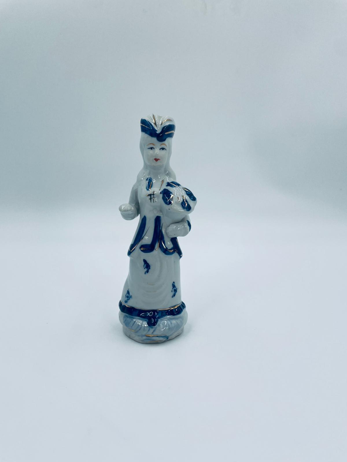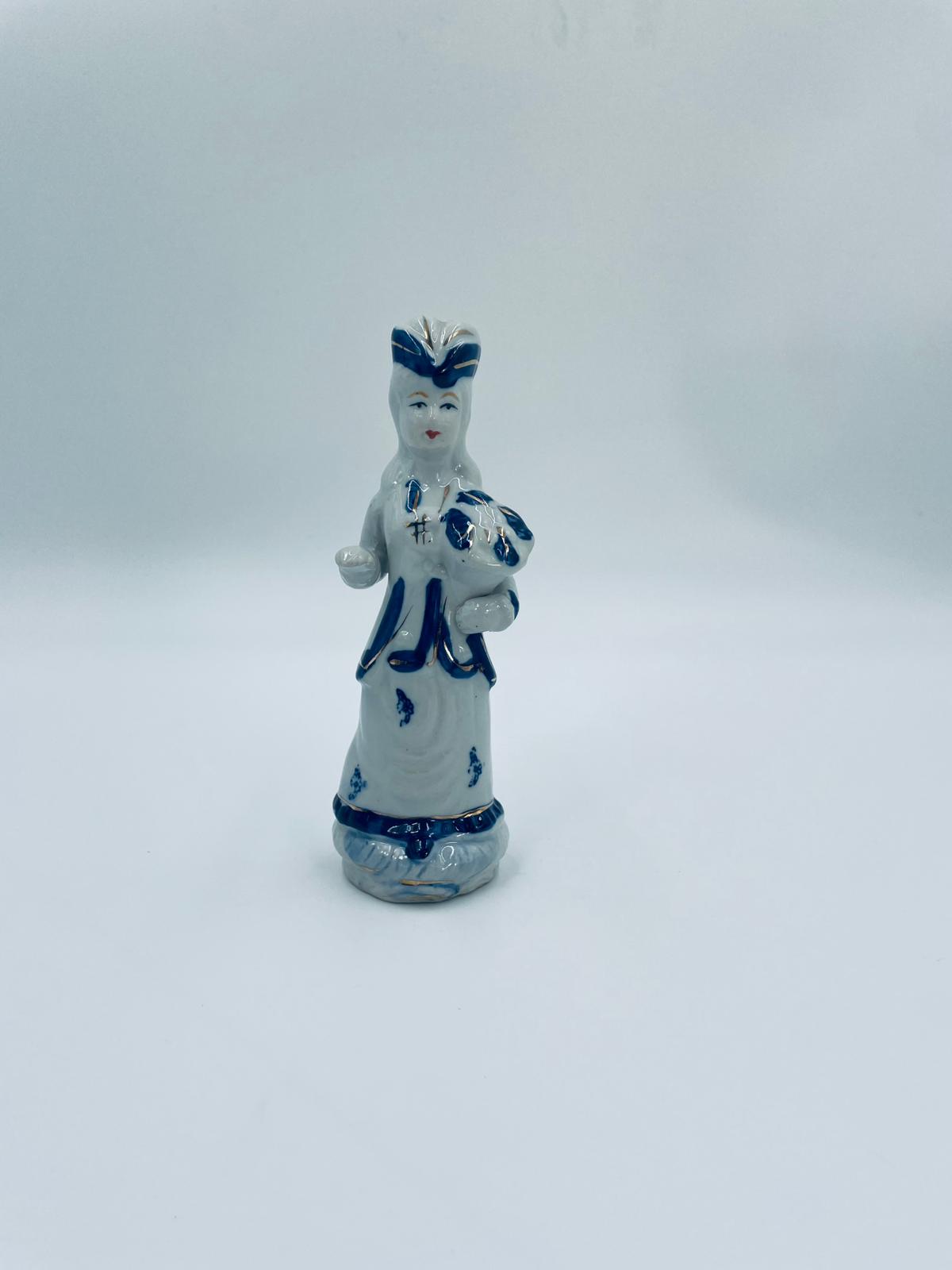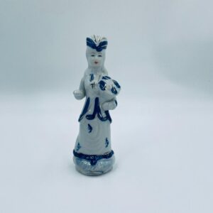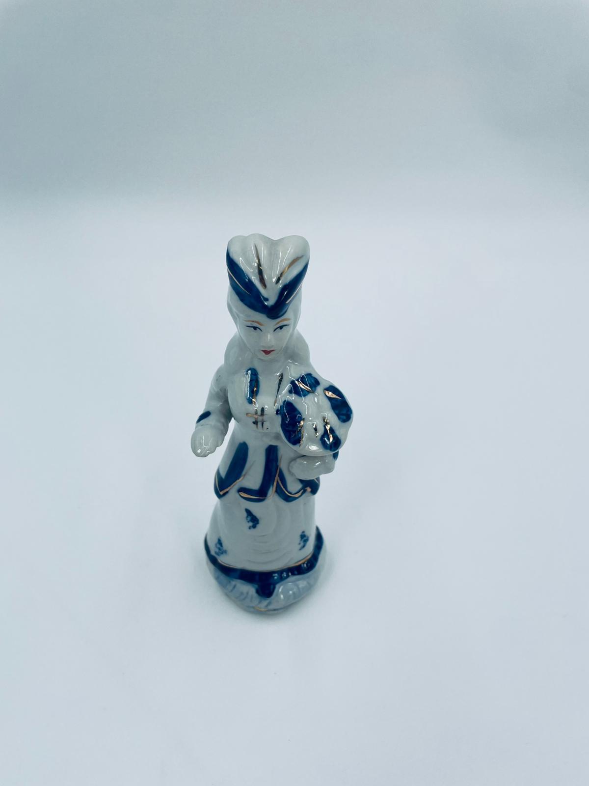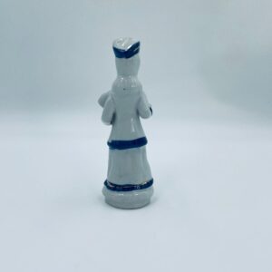 Figurka kolekcjonerska w stylu Vintage, wykonana z wysokiej jakości białej porcelany. Figurka przedstawia damę w kapeluszu, trzymającą bukiet kwiatów, ubrana w suknie z ręcznie malowanymi, niebieskimi wzorami kwiatowymi, granatowymi i złotymi akcentami.
