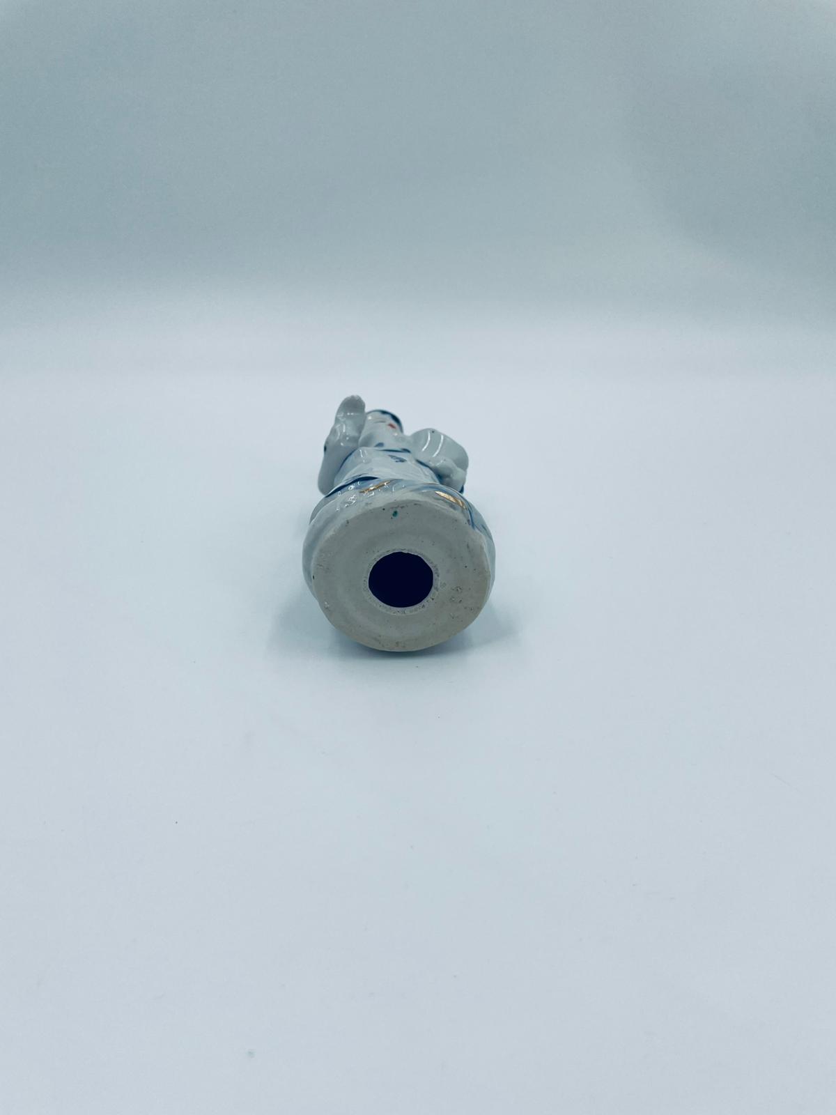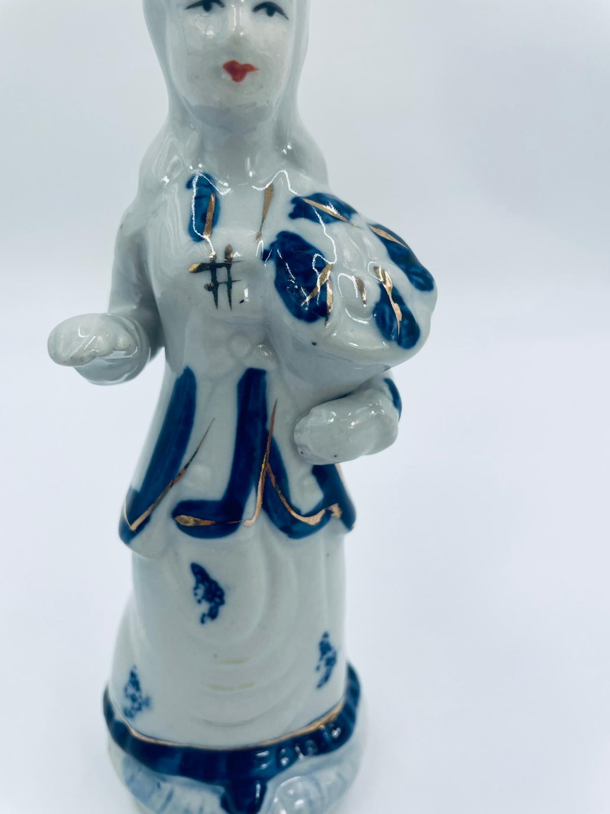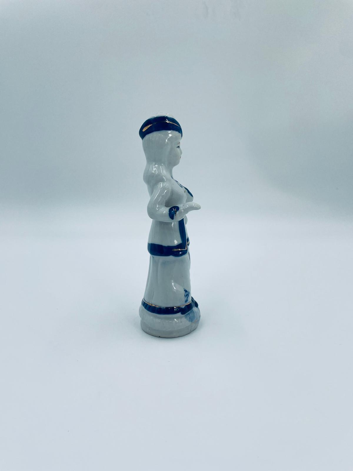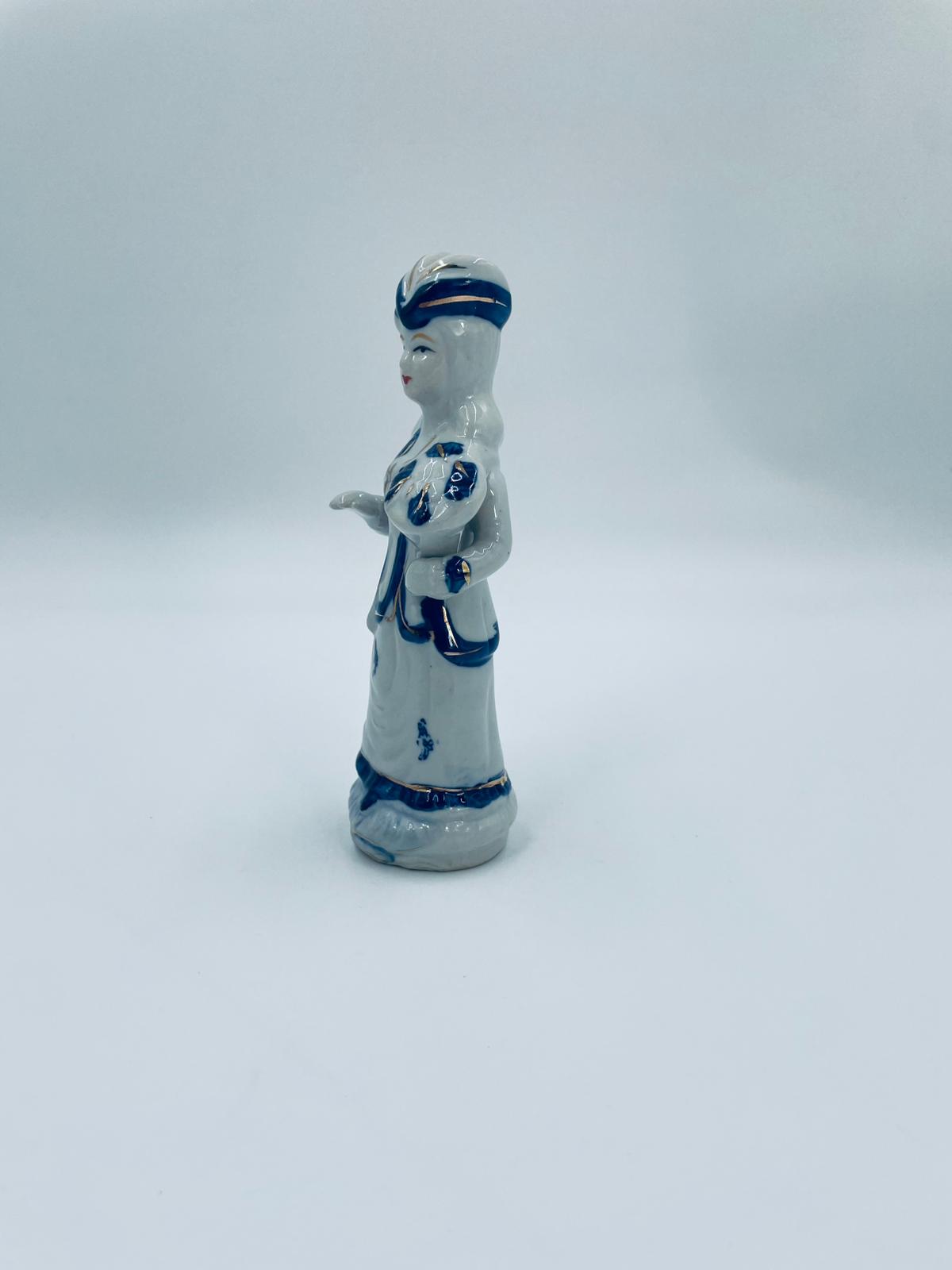 Figurka kolekcjonerska w stylu Vintage, wykonana z wysokiej jakości białej porcelany. Figurka przedstawia damę w kapeluszu, trzymającą bukiet kwiatów, ubrana w suknie z ręcznie malowanymi, niebieskimi wzorami kwiatowymi, granatowymi i złotymi akcentami.