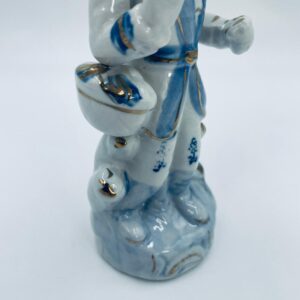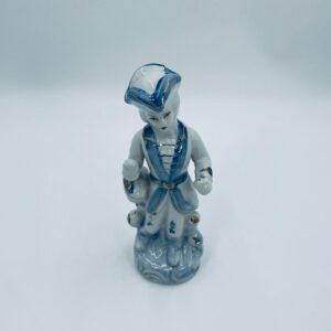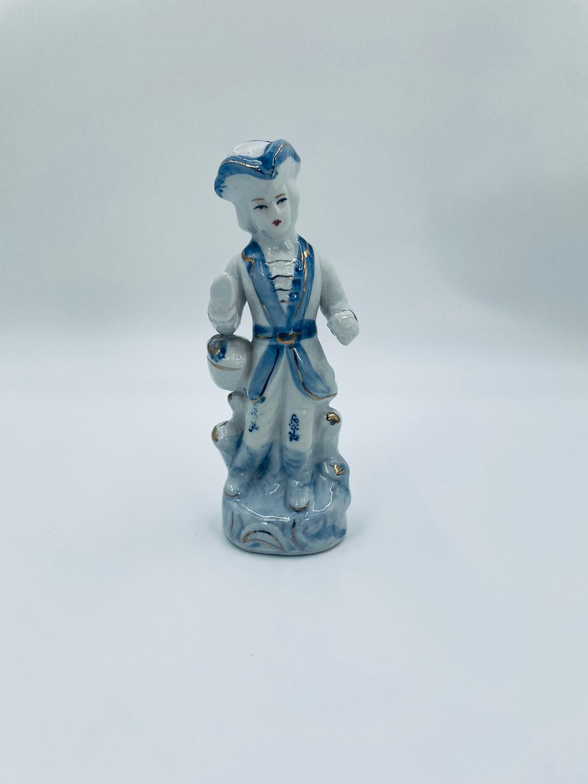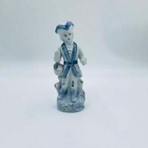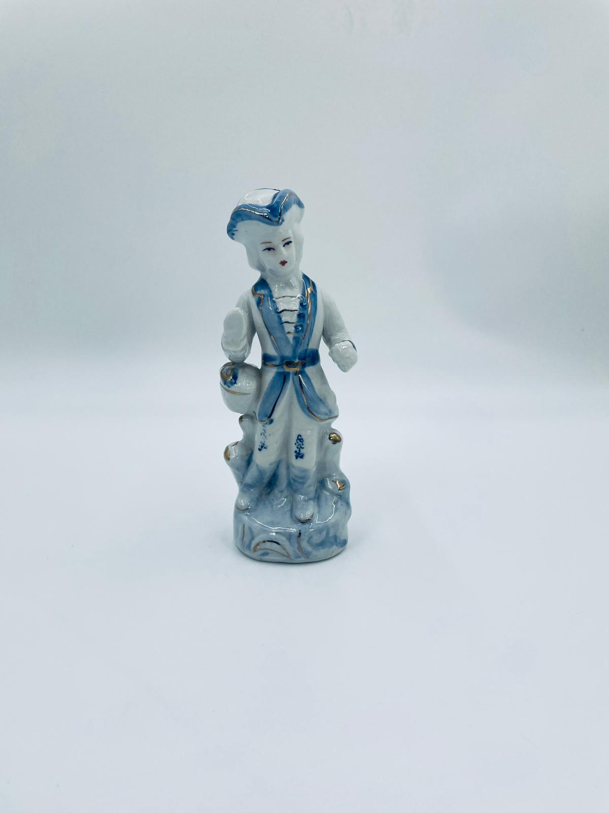 Figurka kolekcjonerska w stylu Vintage, wykonana z wysokiej jakości białej porcelany. Figurka przedstawia postać ubrana w tradycyjny strój z ręcznie malowanymi wzorami kwiatowymi oraz złotymi akcentami. Posiada przetarcie.