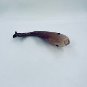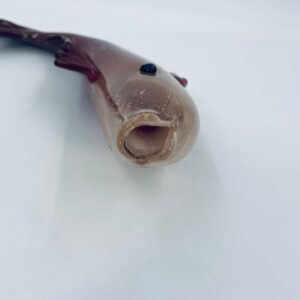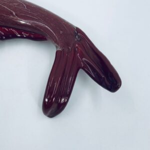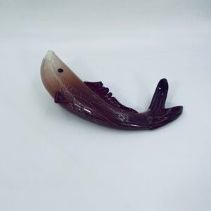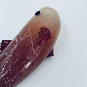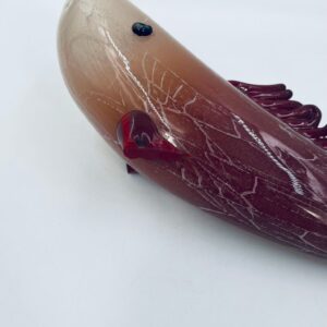 Figurka kolekcjonerska w stylu Vintage, wykonana z wysokiej jakości artystycznego, dmuchanego szkła. Figurka przedstawia rybę z otwartym pyskiem, barwiona na kolor burgundowy z efektem cieniowania oraz z jasnymi przejściami barwionymi w masie. Posiada uszczerbki na płetwach.