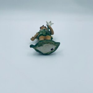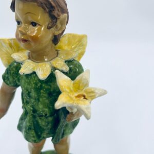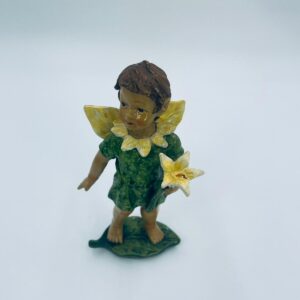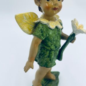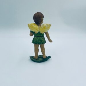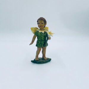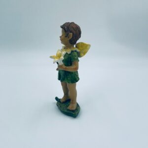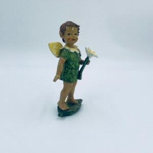 Figurka kolekcjonerska w stylu Vintage, wykonana z ceramiki. Figurka przedstawia chłopca stojącego na zielonym listku, ubranego w zielony strój z żółtym kołnierzem, mającego żółte skrzydła przypominające liście, trzymającego żółtego kwiata.