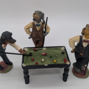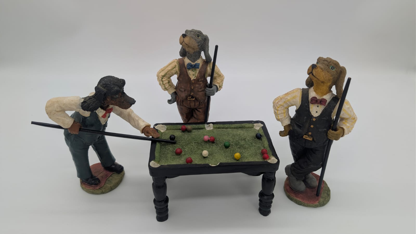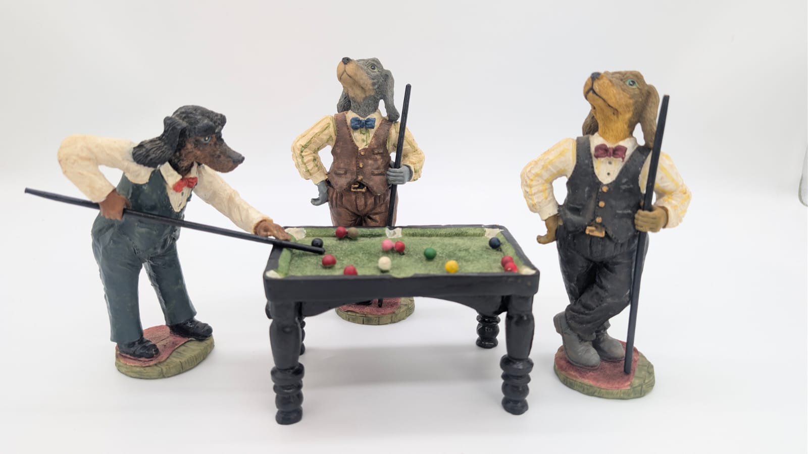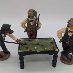Figurki przedstawiają trzy antropomorficzne psy przy miniaturowym stole bilardowym.