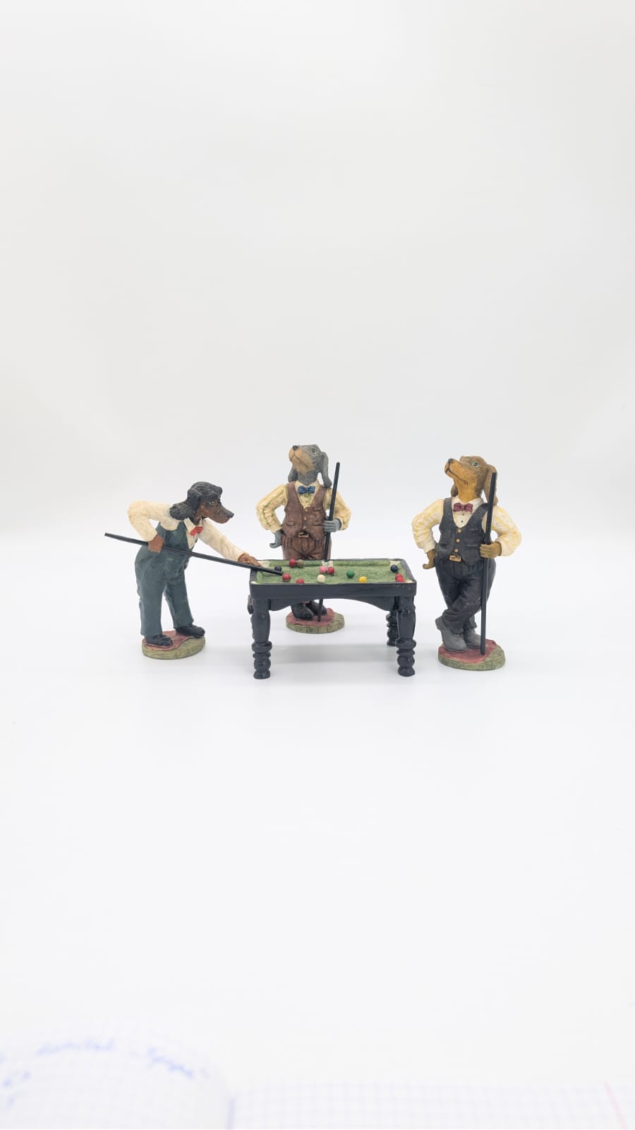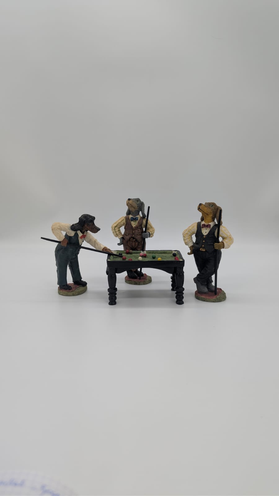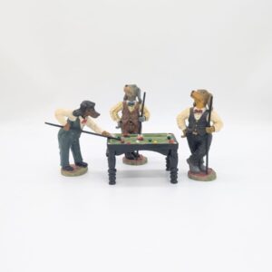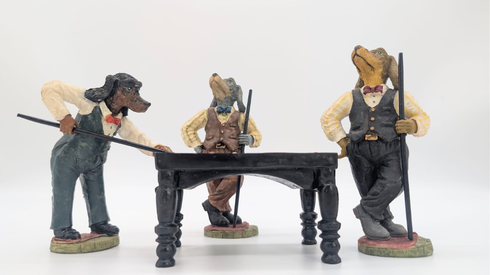Figurki przedstawiają trzy antropomorficzne psy przy miniaturowym stole bilardowym.