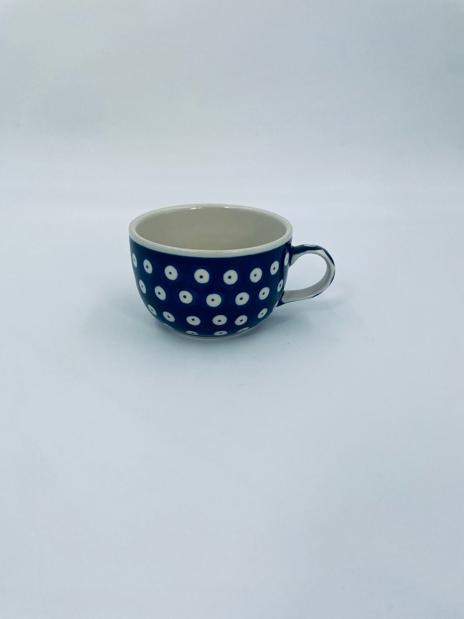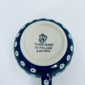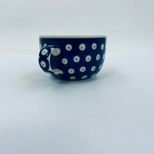Filiżanka kolekcjonerska Polskiej wytwórni Bolesławiec, wykonana z najwyższej jakości ceramiki. Filiżanka ręcznie robiona w kolorze granatowym, ozdobiona jest ręcznie malowanym, tradycyjnym wzorem stempelkowym w kropki. Wzory na Bolesławieckiej ceramice naniesione są metodą stempelkową oraz pędzlem.