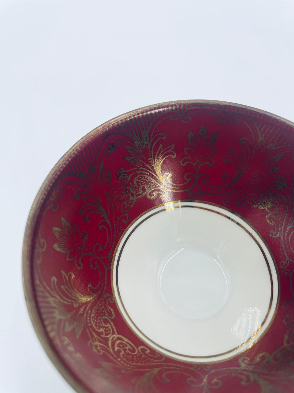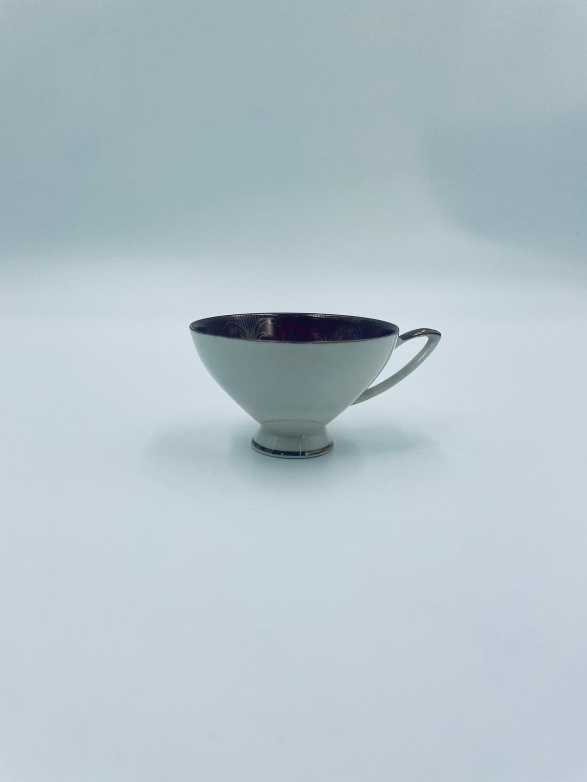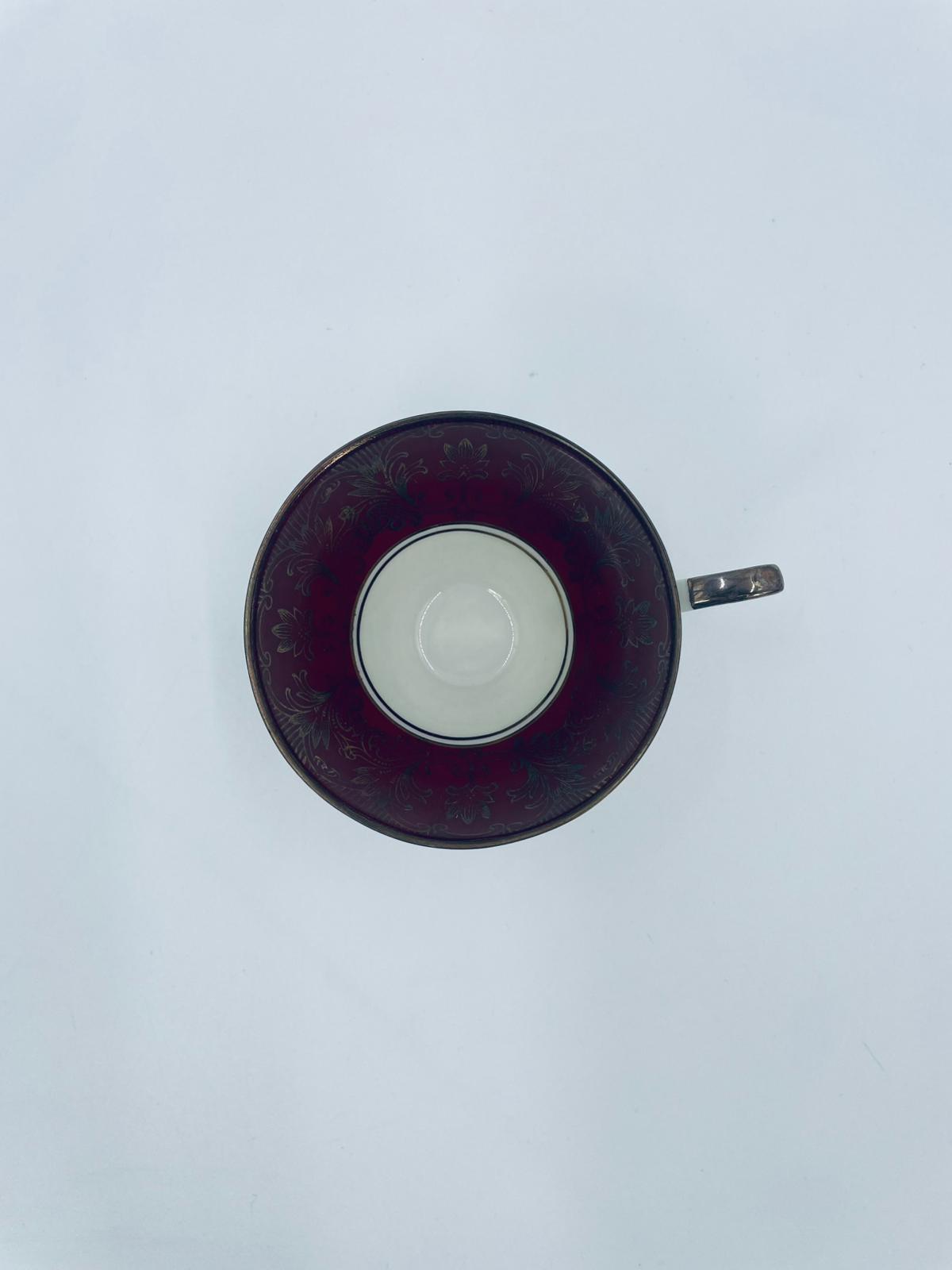 Filiżanka kolekcjonerska wytwórni Alka Bavaria, wykonana z wysokiej jakości białej porcelany. Filiżanka wewnątrz bogato zdobiona złotymi motywami roślinnymi na bordowym tle oraz złotymi akcentami na krawędziach.