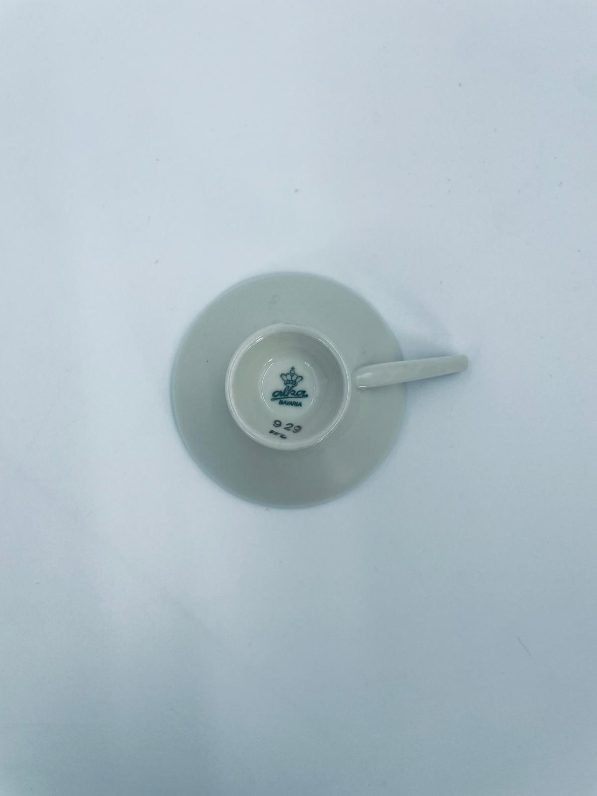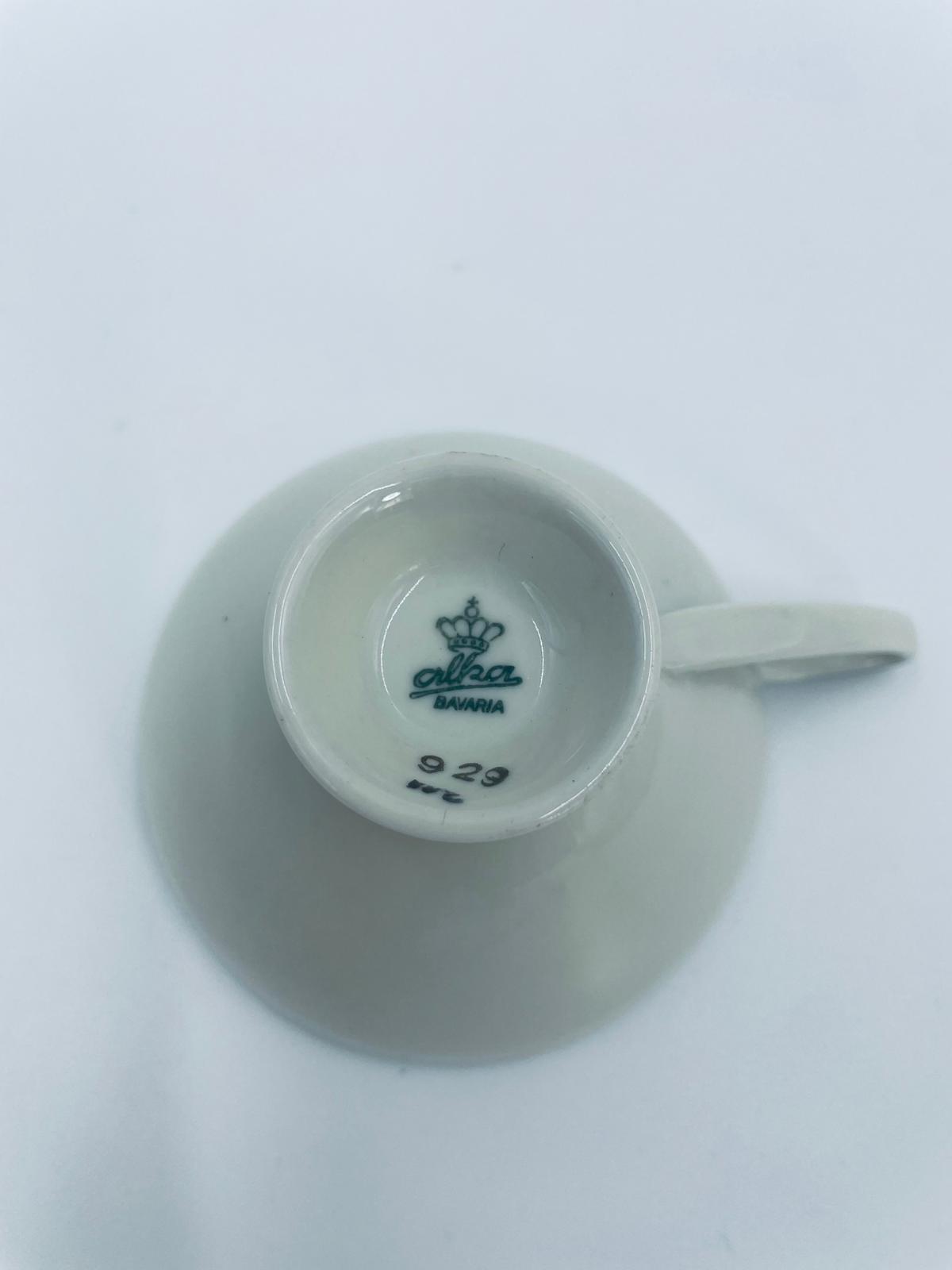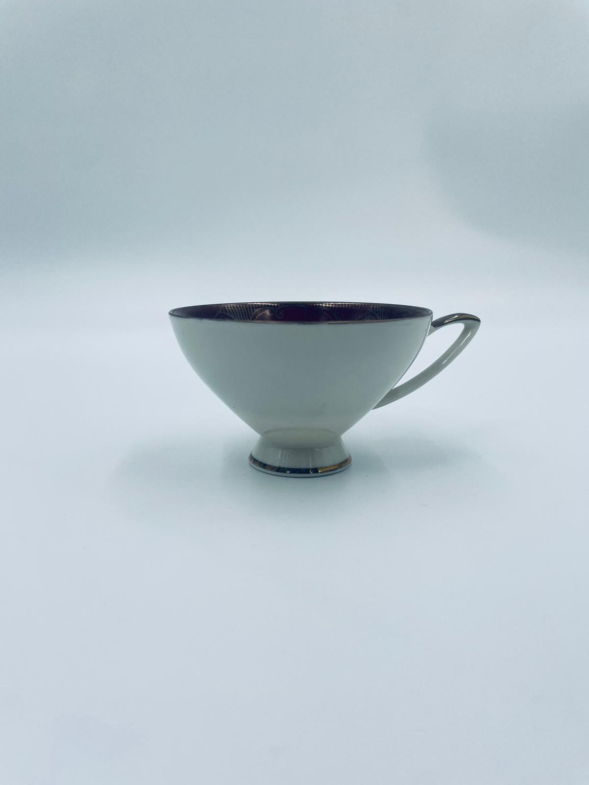 Filiżanka kolekcjonerska wytwórni Alka Bavaria, wykonana z wysokiej jakości białej porcelany. Filiżanka wewnątrz bogato zdobiona złotymi motywami roślinnymi na bordowym tle oraz złotymi akcentami na krawędziach.