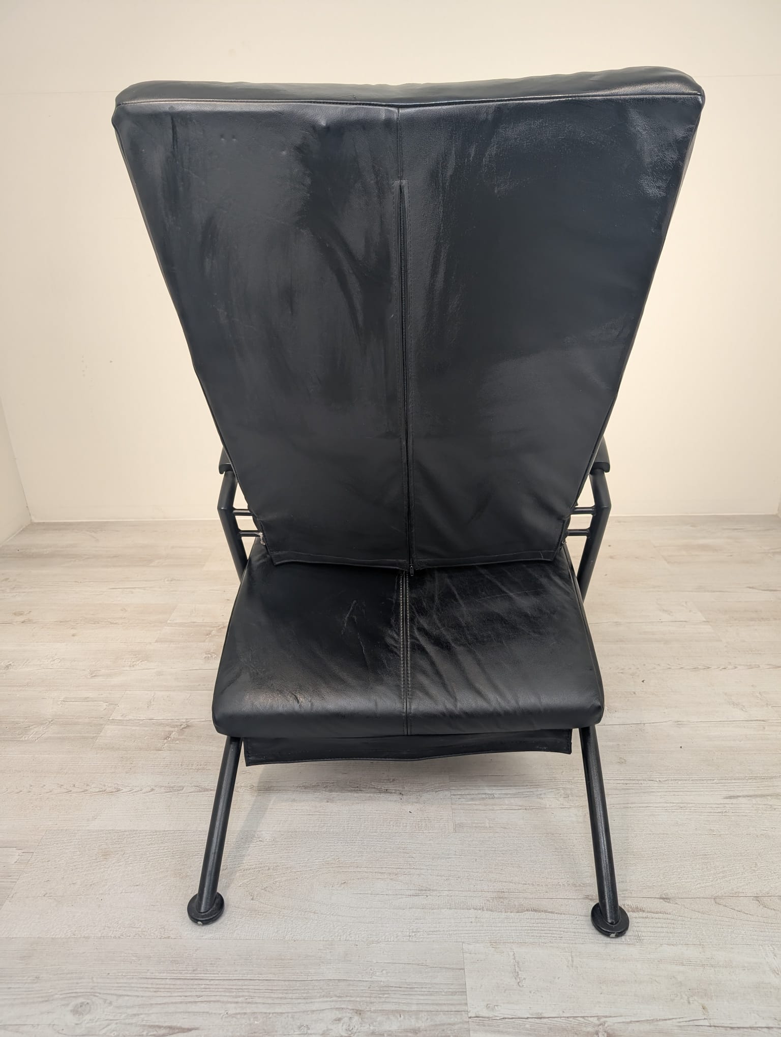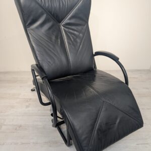 Skórzany fotel wypoczynkowy na masywnym metalowym stelażu obity czarną naturalna skórą.