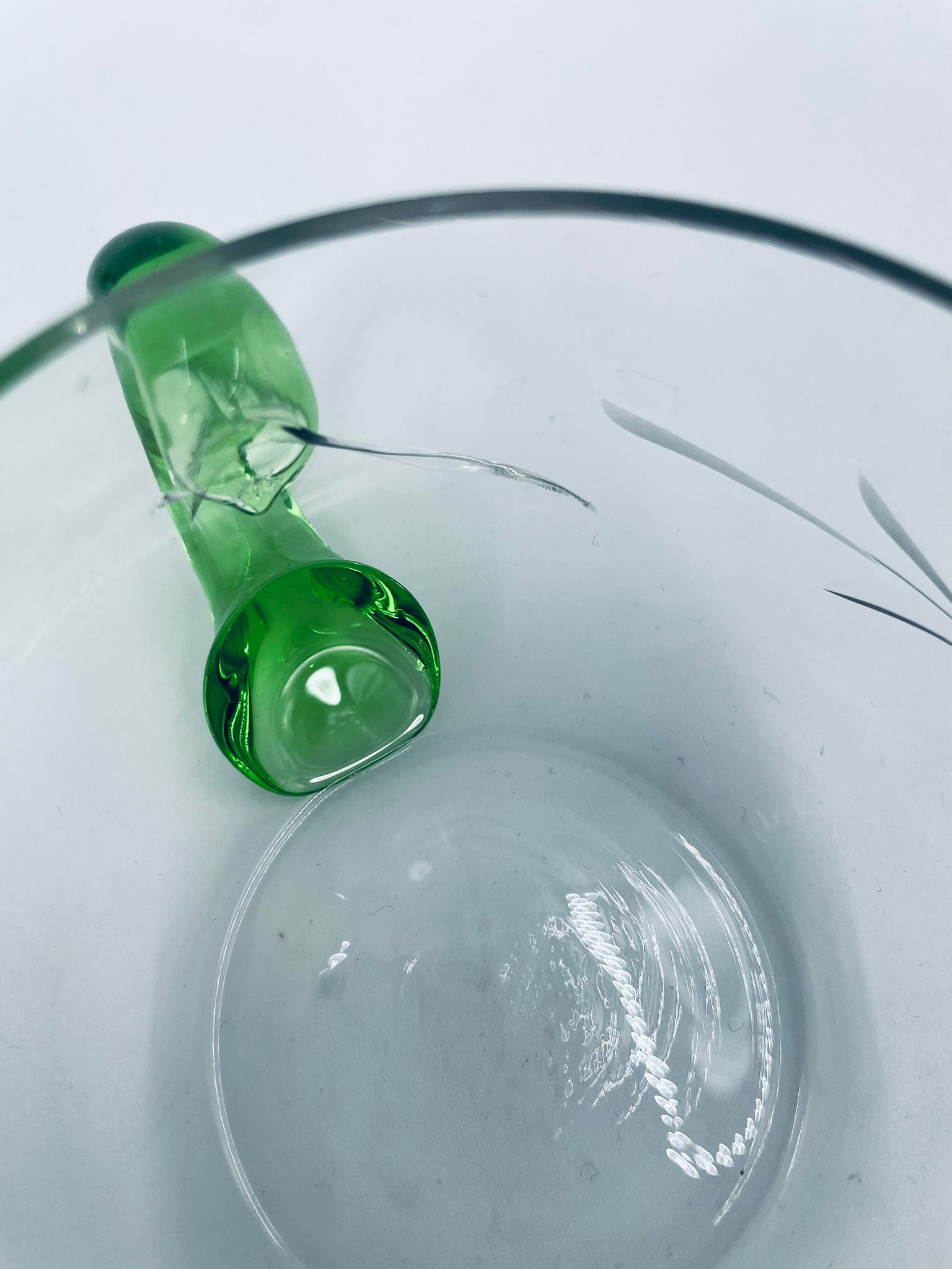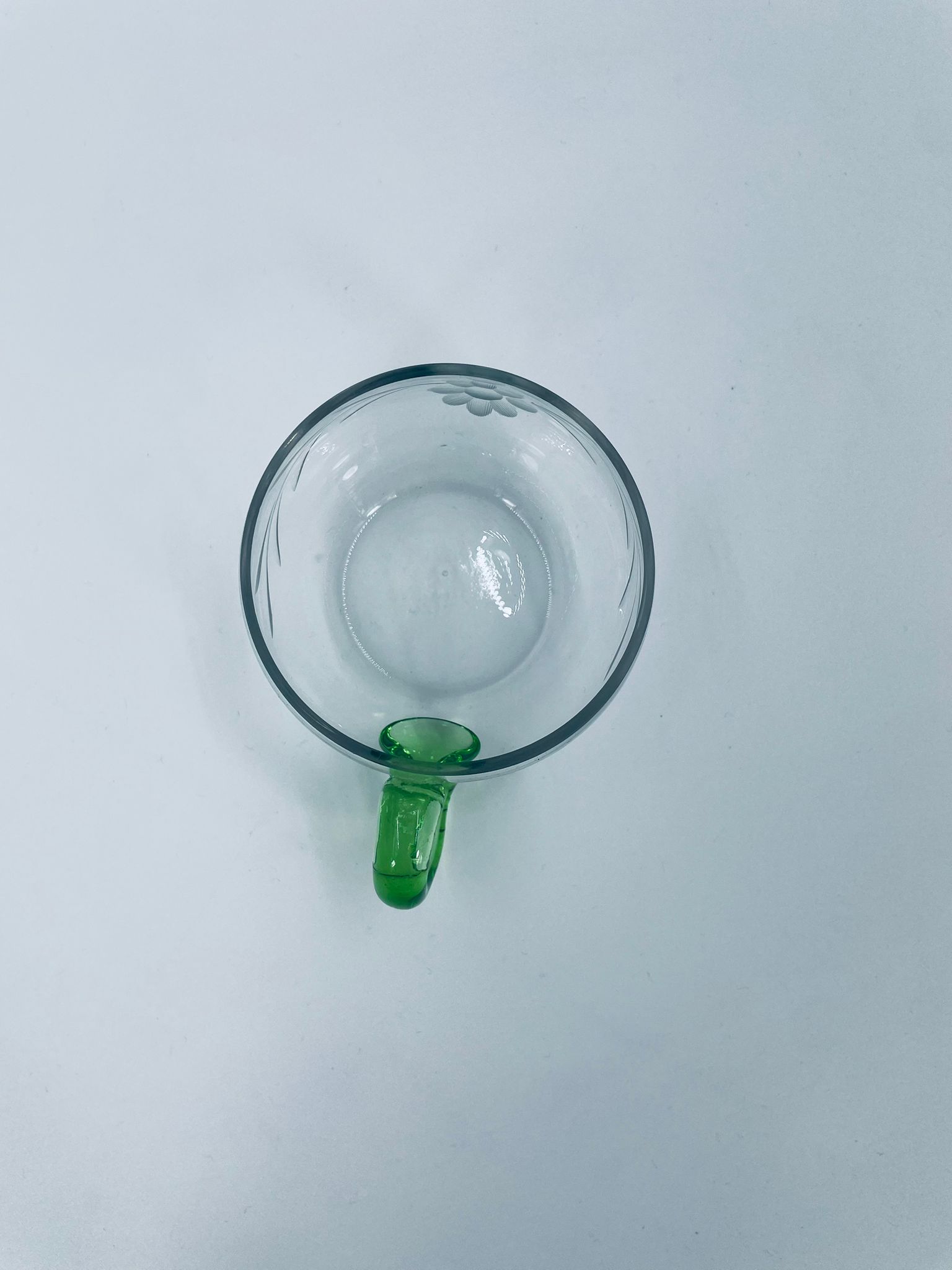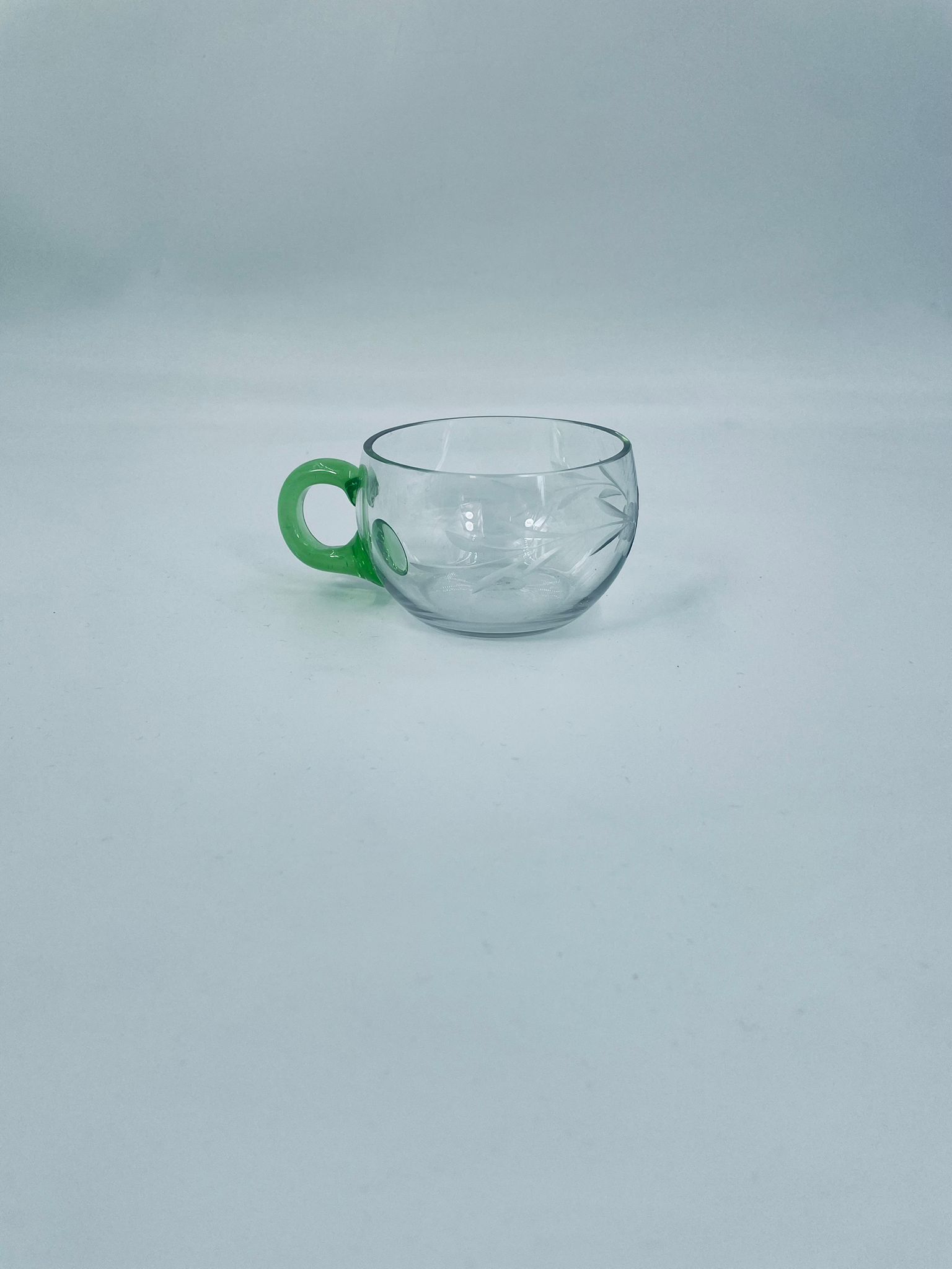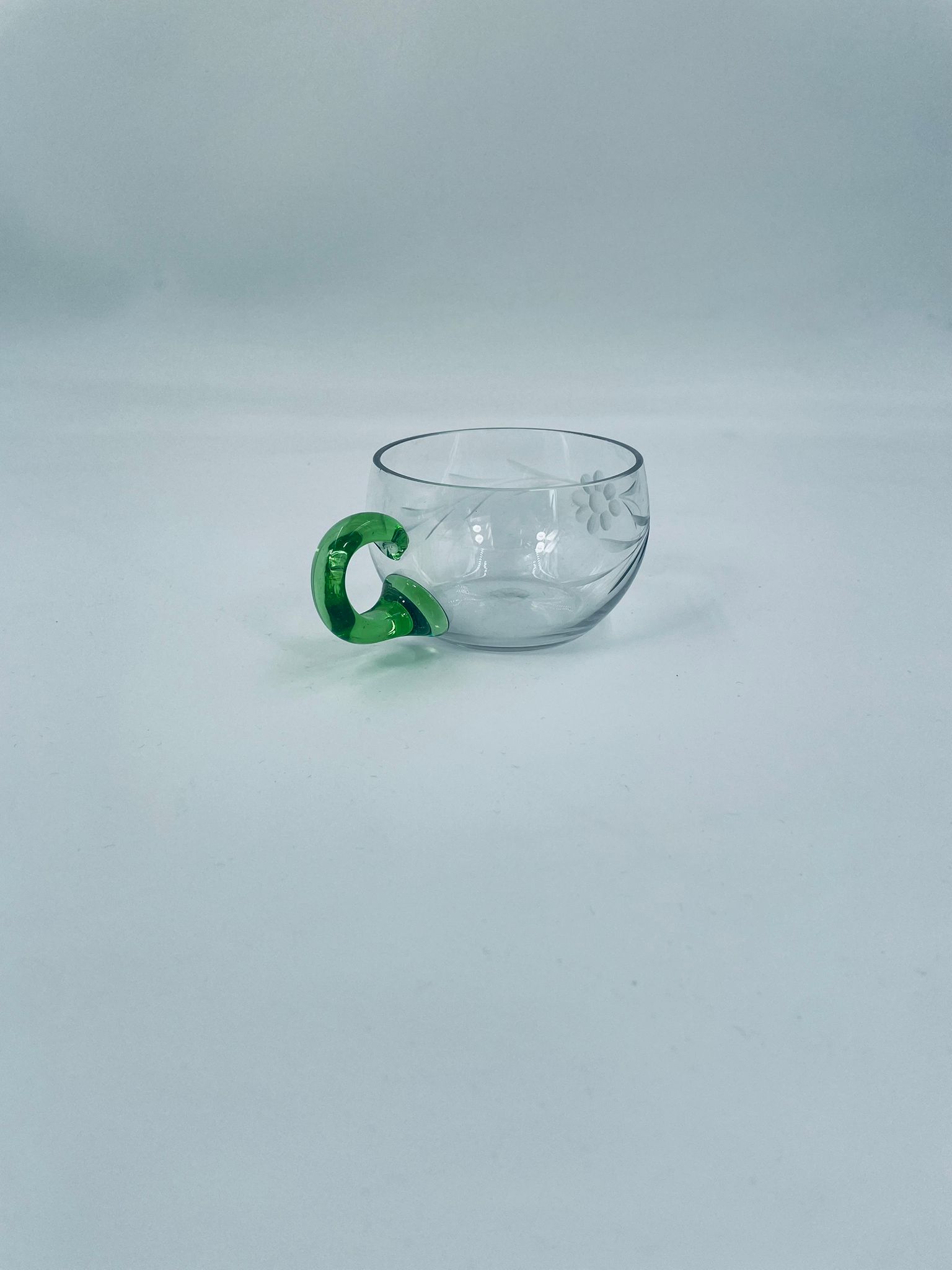 Tea/coffee cup, made of clear glass with an etched floral pattern. The handle of the cup is tinted green. The cup has a chip on the top rim and a crack.