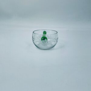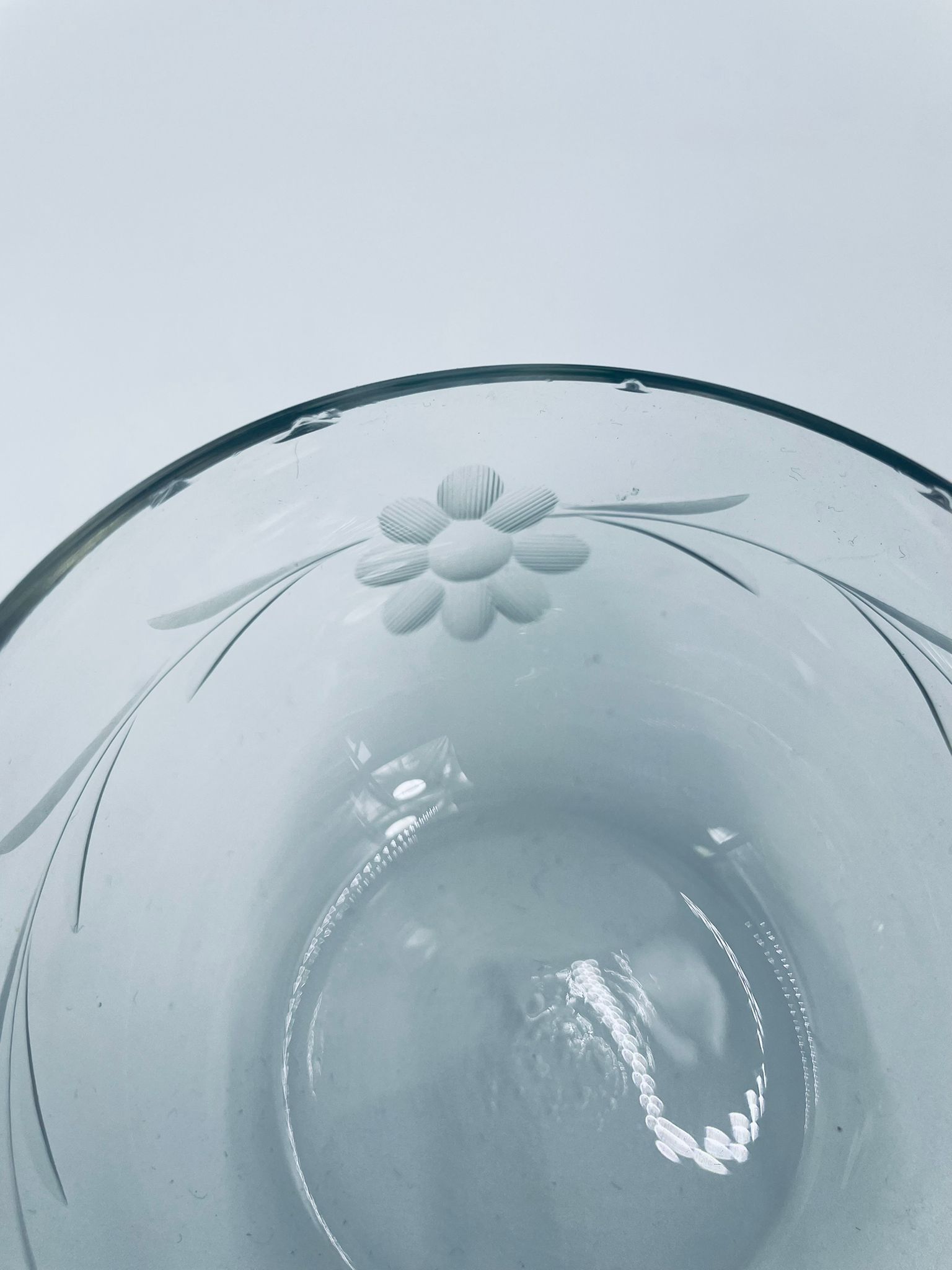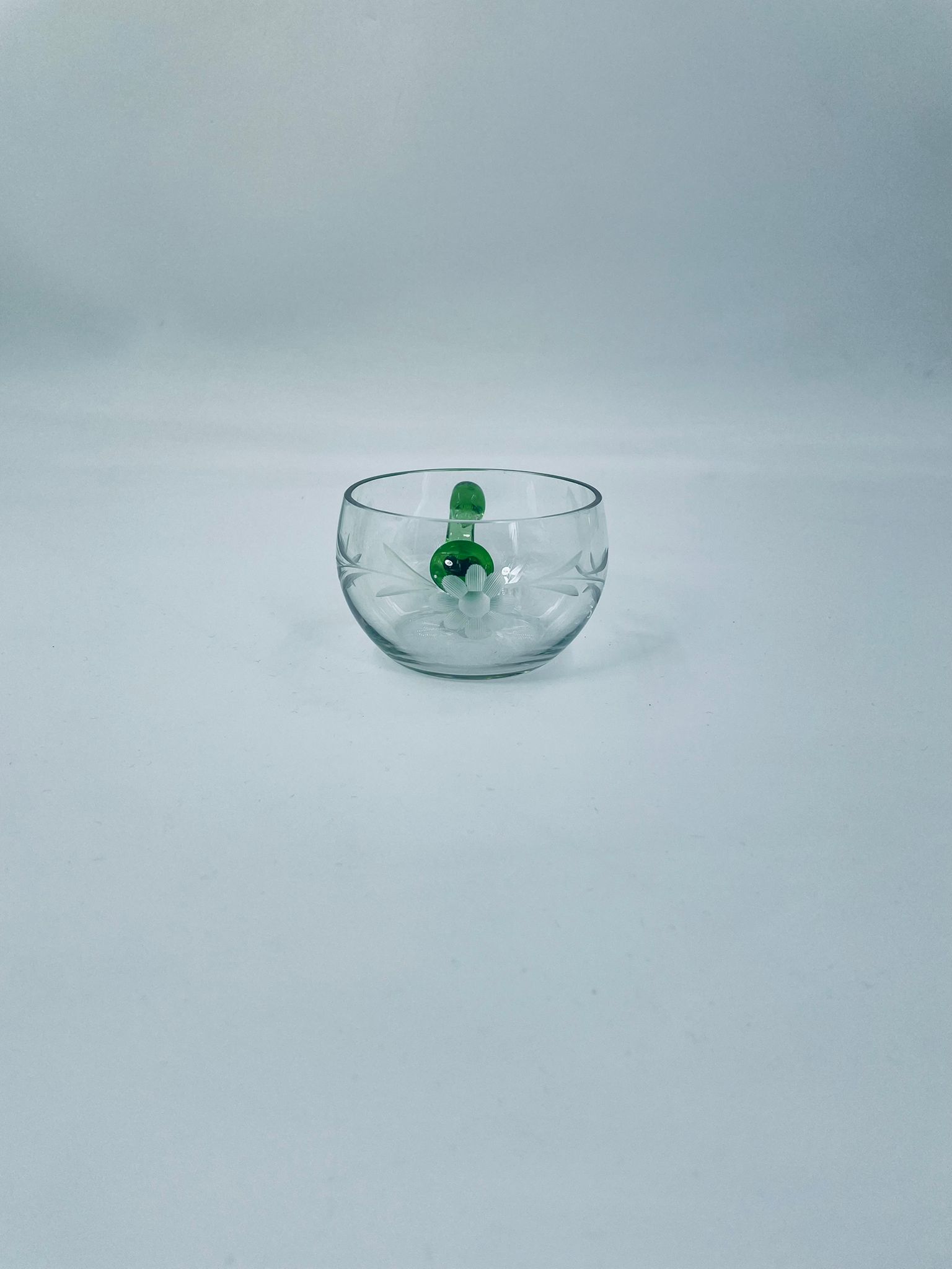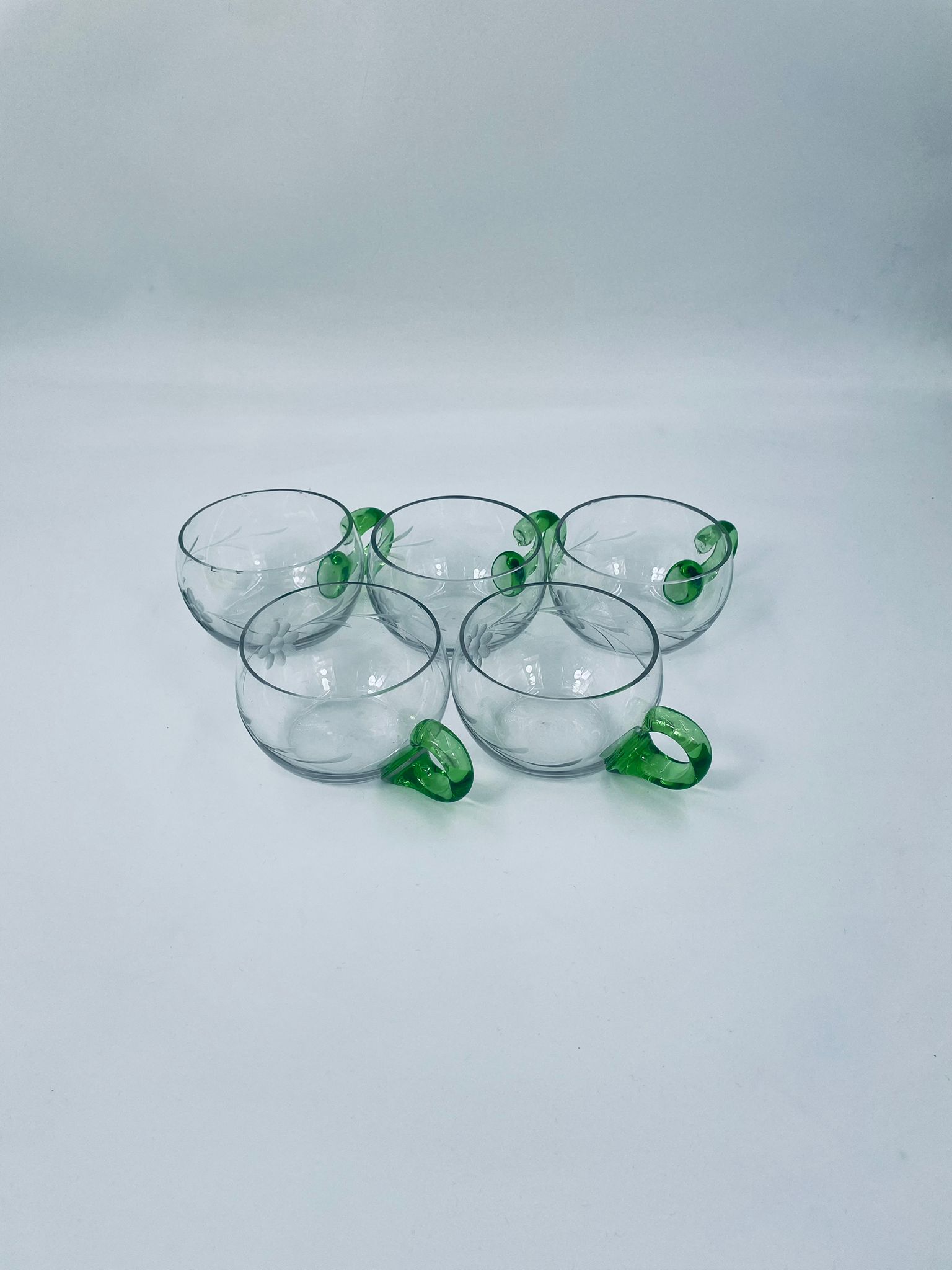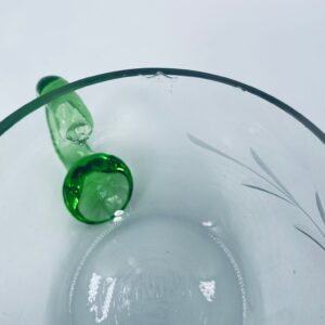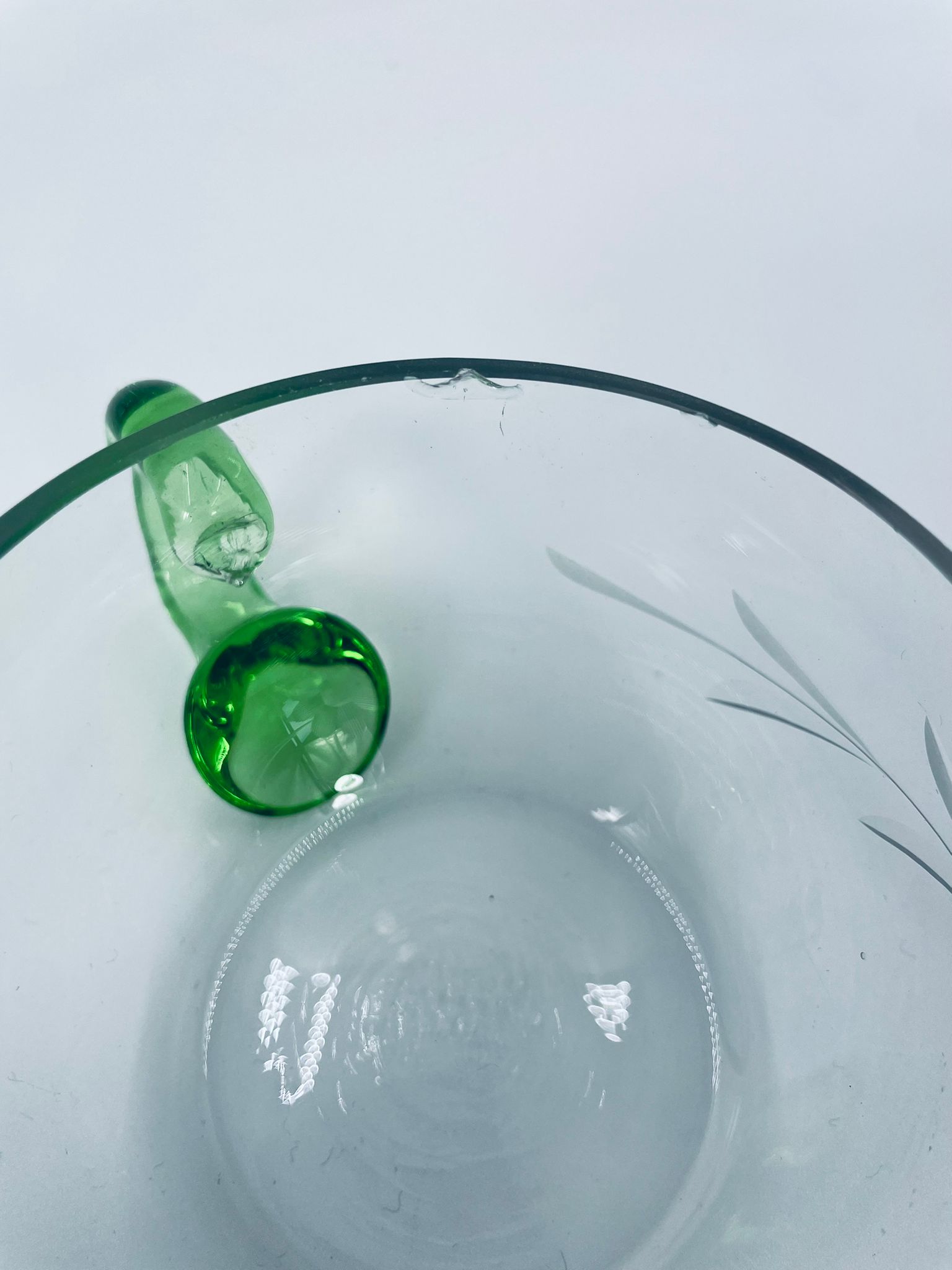 Tea/coffee cup, made of clear glass with an etched floral pattern. The handle of the cup is tinted green. The cup has a chip on the top rim and a crack.