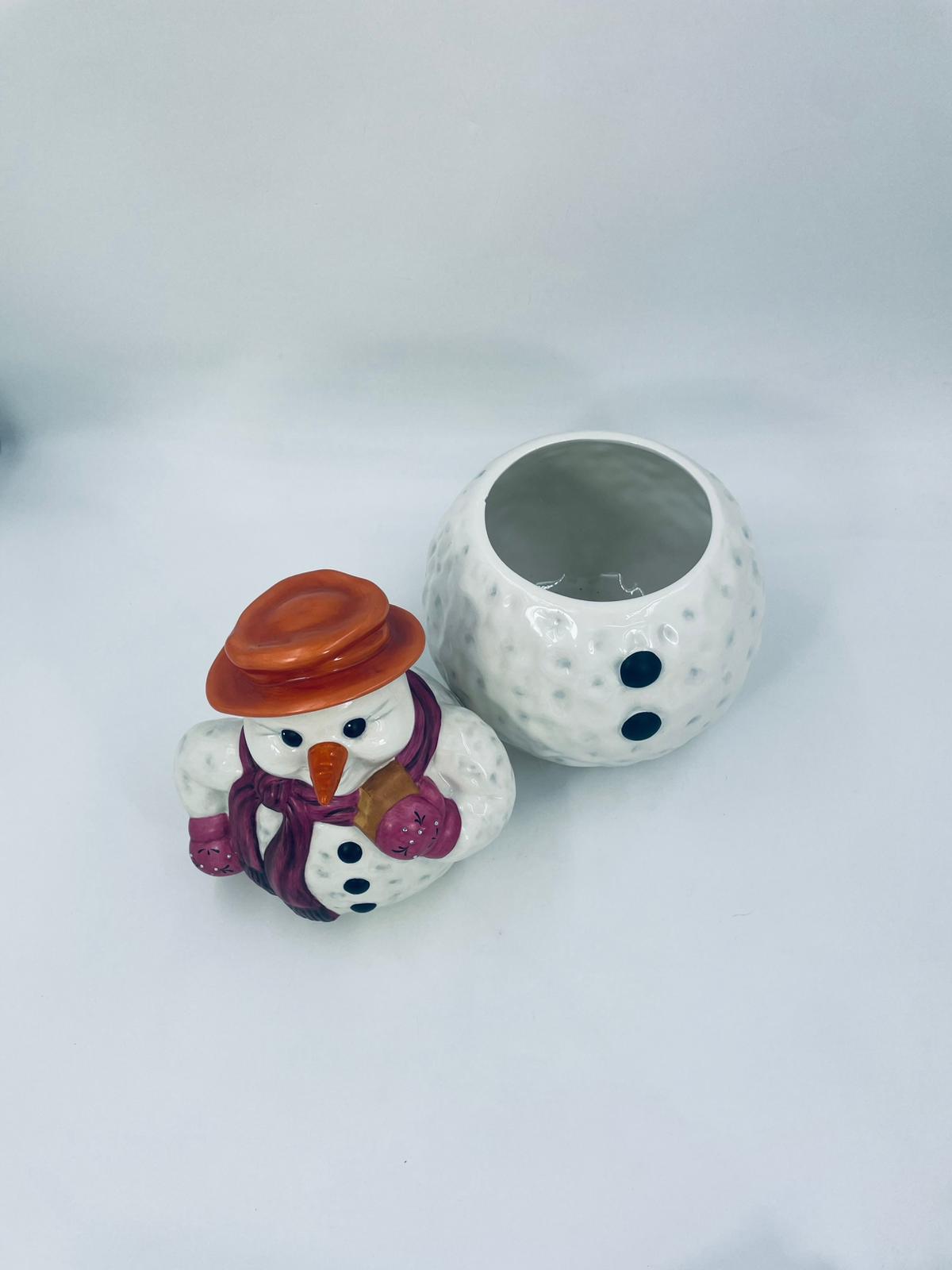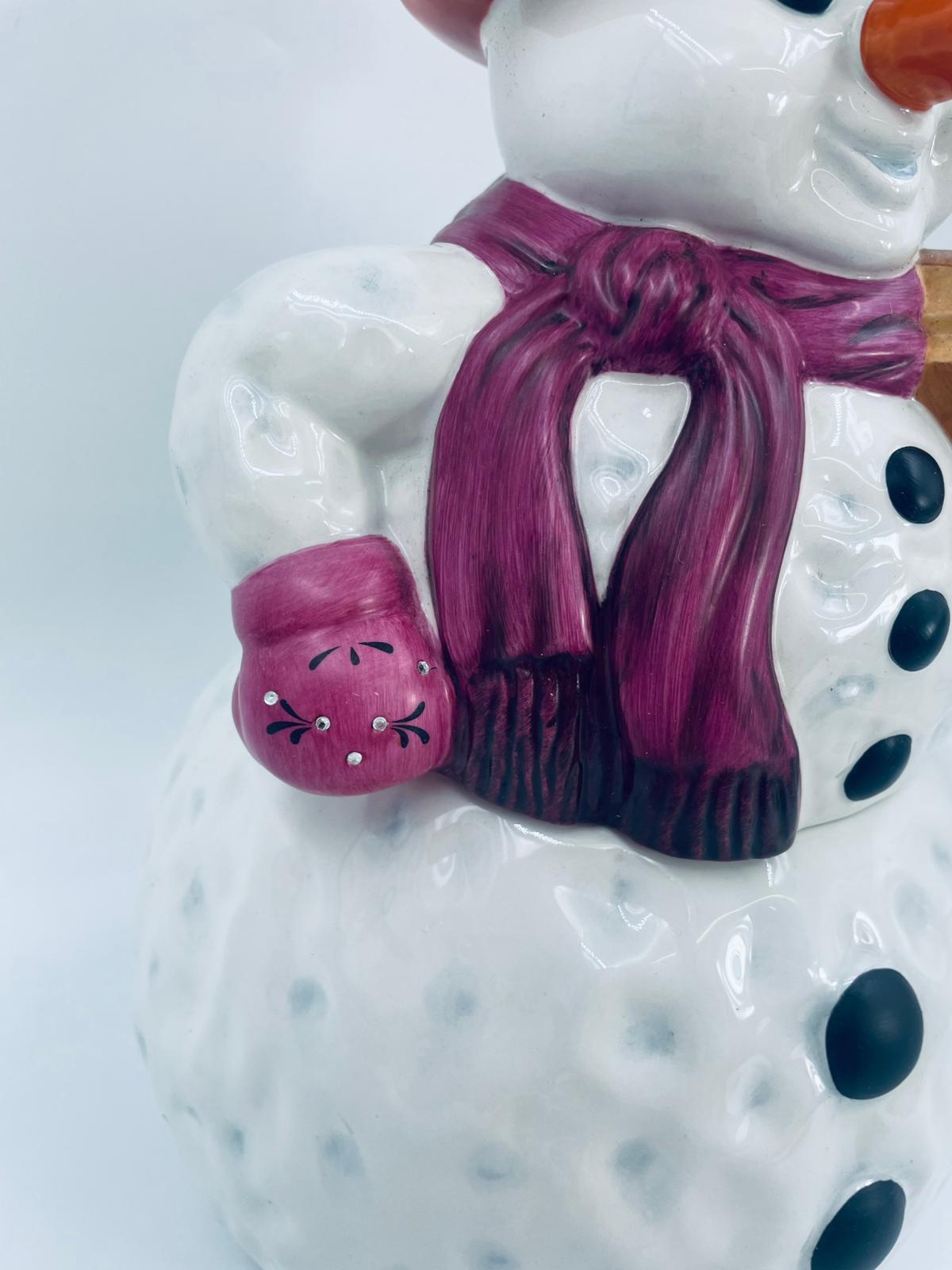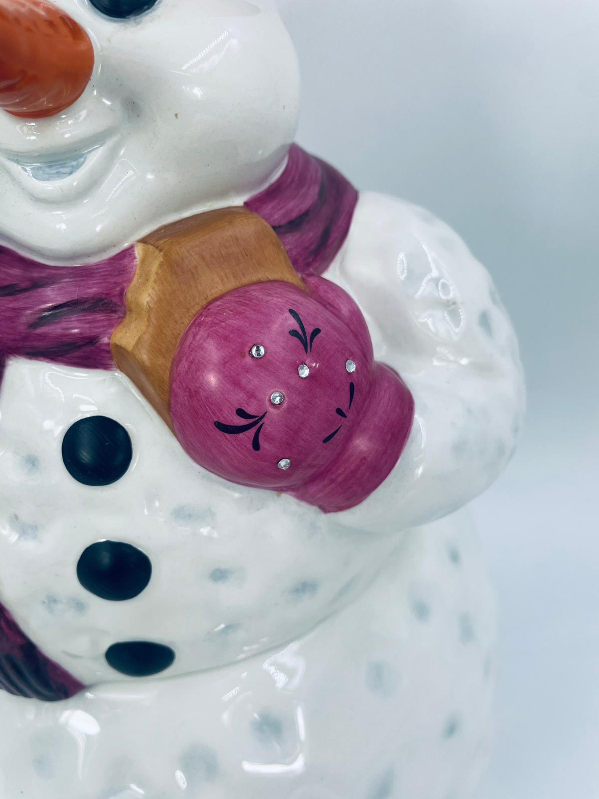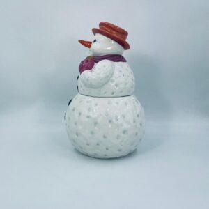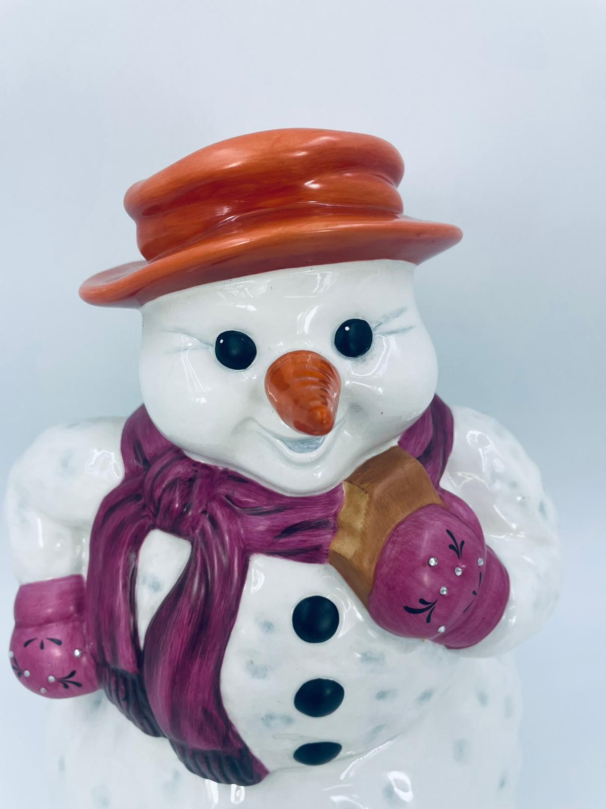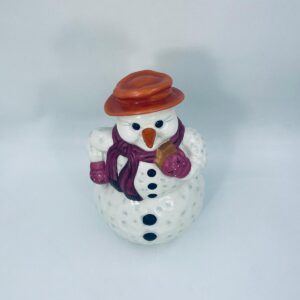 Figurine, container manufactured by Goebel, made of high-quality white porcelain. Figurine in the shape of a snowman, wearing a red hat, purple scarf and gloves with small crystals. The container consists of two parts, the lower round part forming the container, and the upper part forming the lid. The container is used to store cookies, gingerbread or other Christmas treats. There is a small chip on the inside edge.