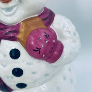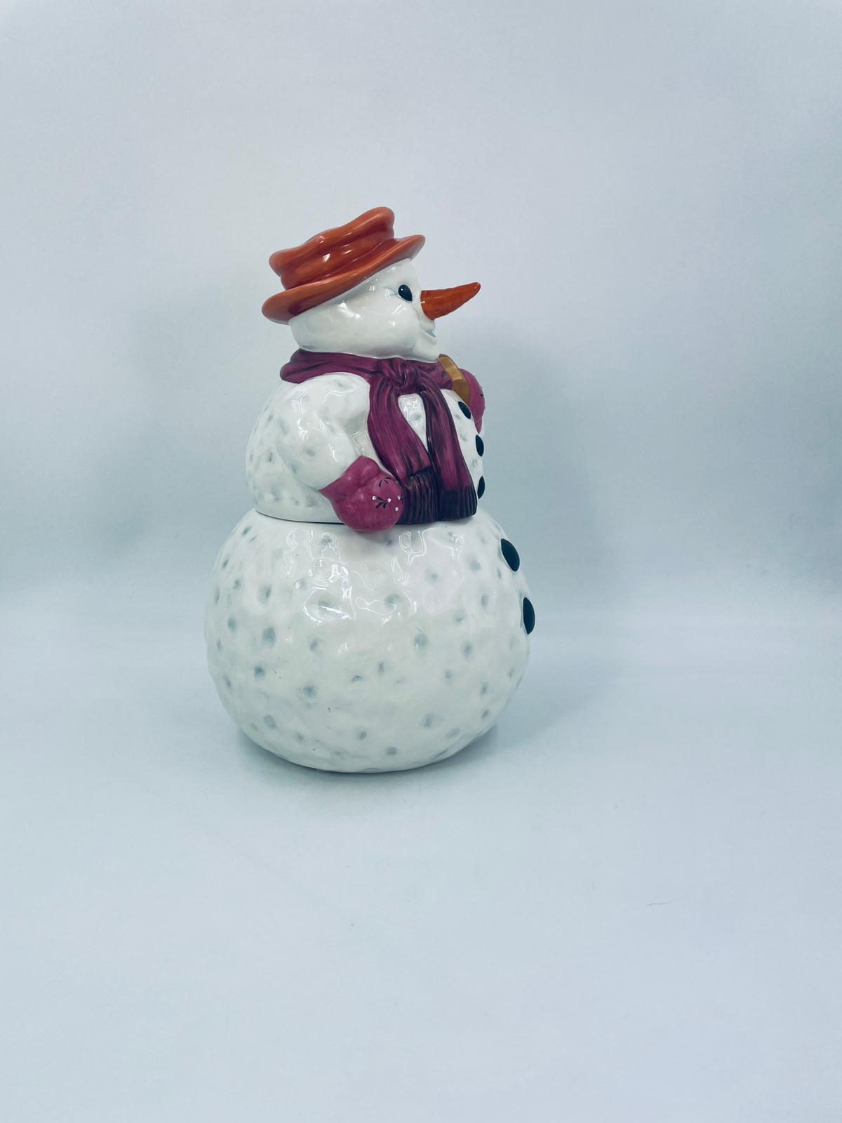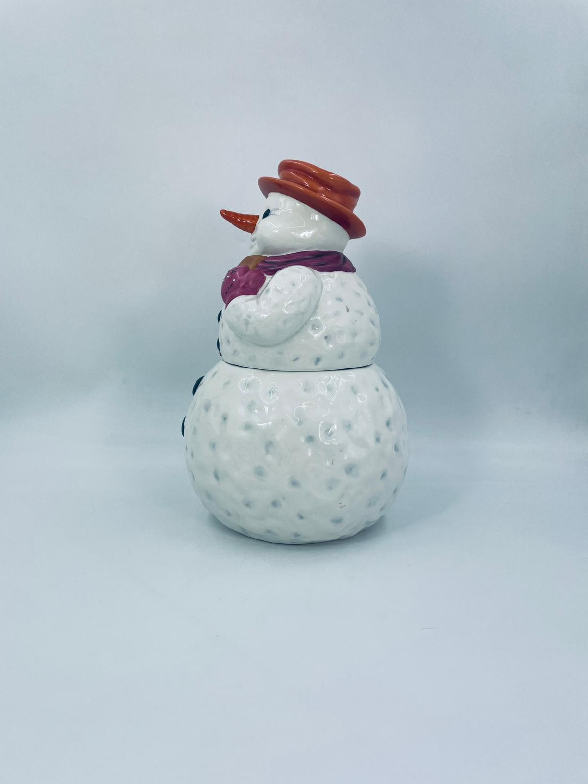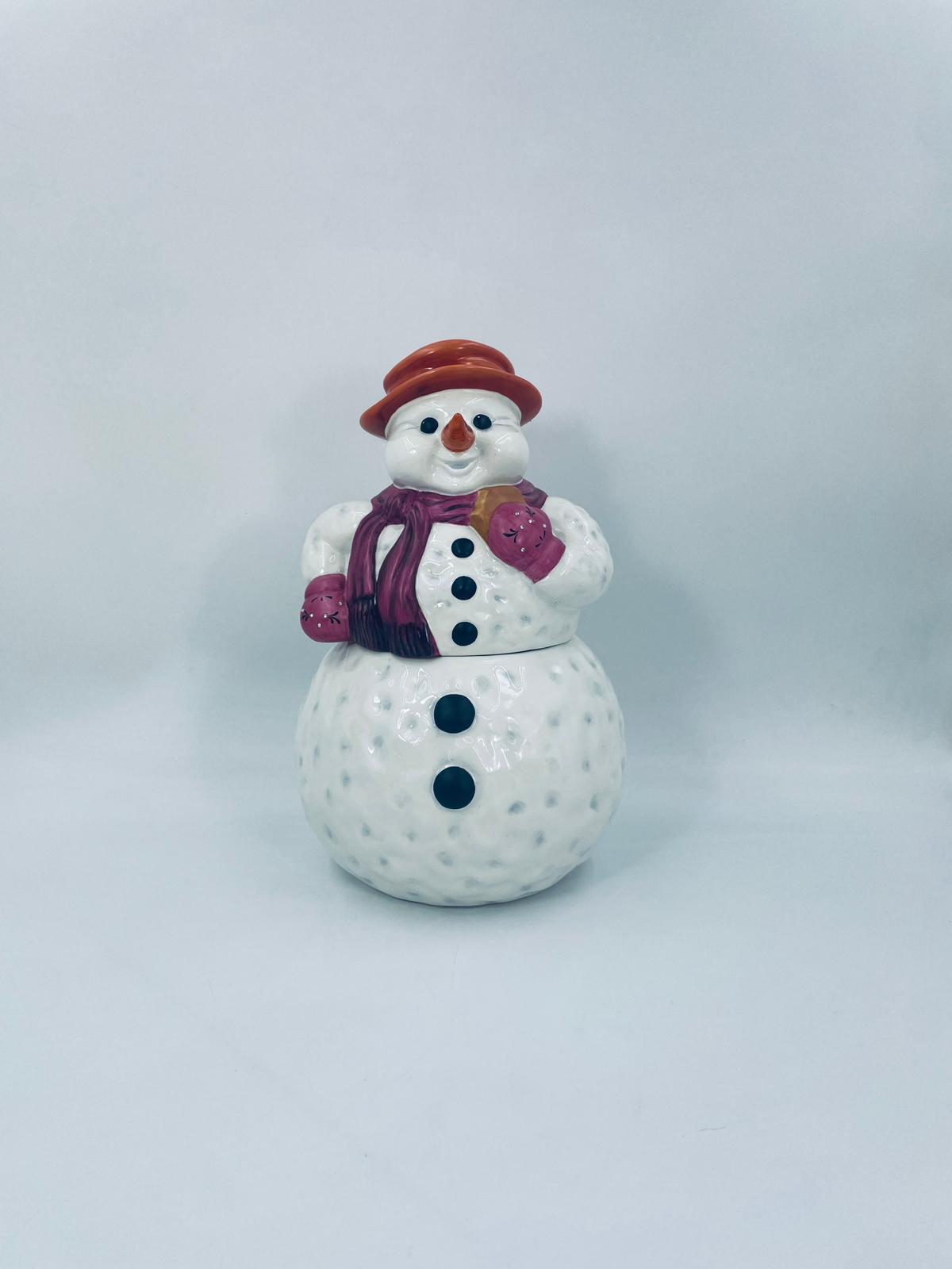 Figurine, container manufactured by Goebel, made of high-quality white porcelain. Figurine in the shape of a snowman, wearing a red hat, purple scarf and gloves with small crystals. The container consists of two parts, the lower round part forming the container, and the upper part forming the lid. The container is used to store cookies, gingerbread or other Christmas treats. There is a small chip on the inside edge.