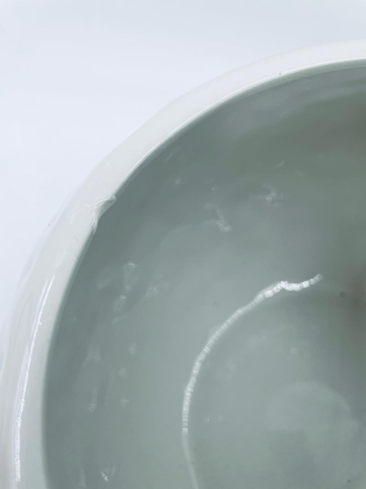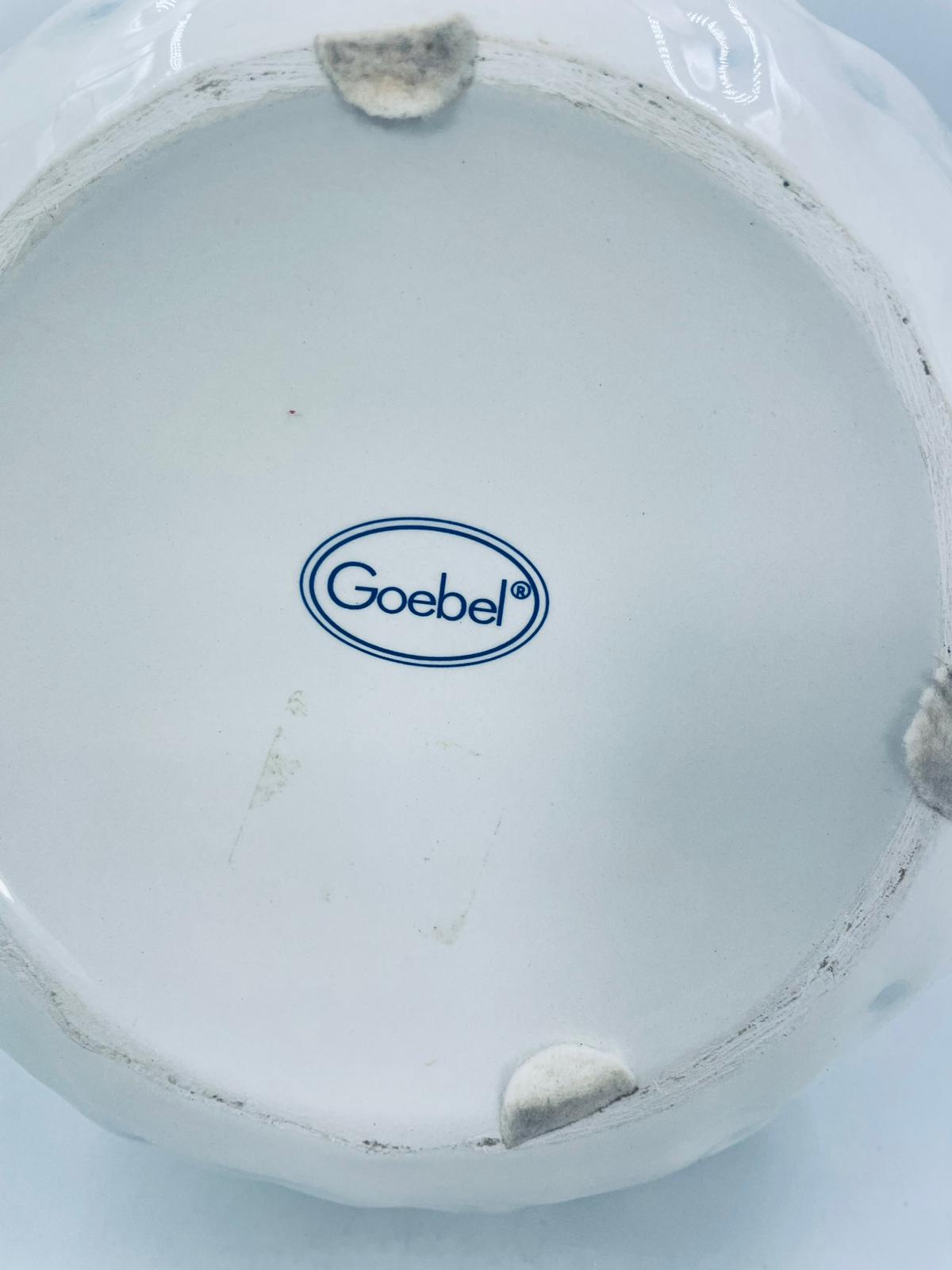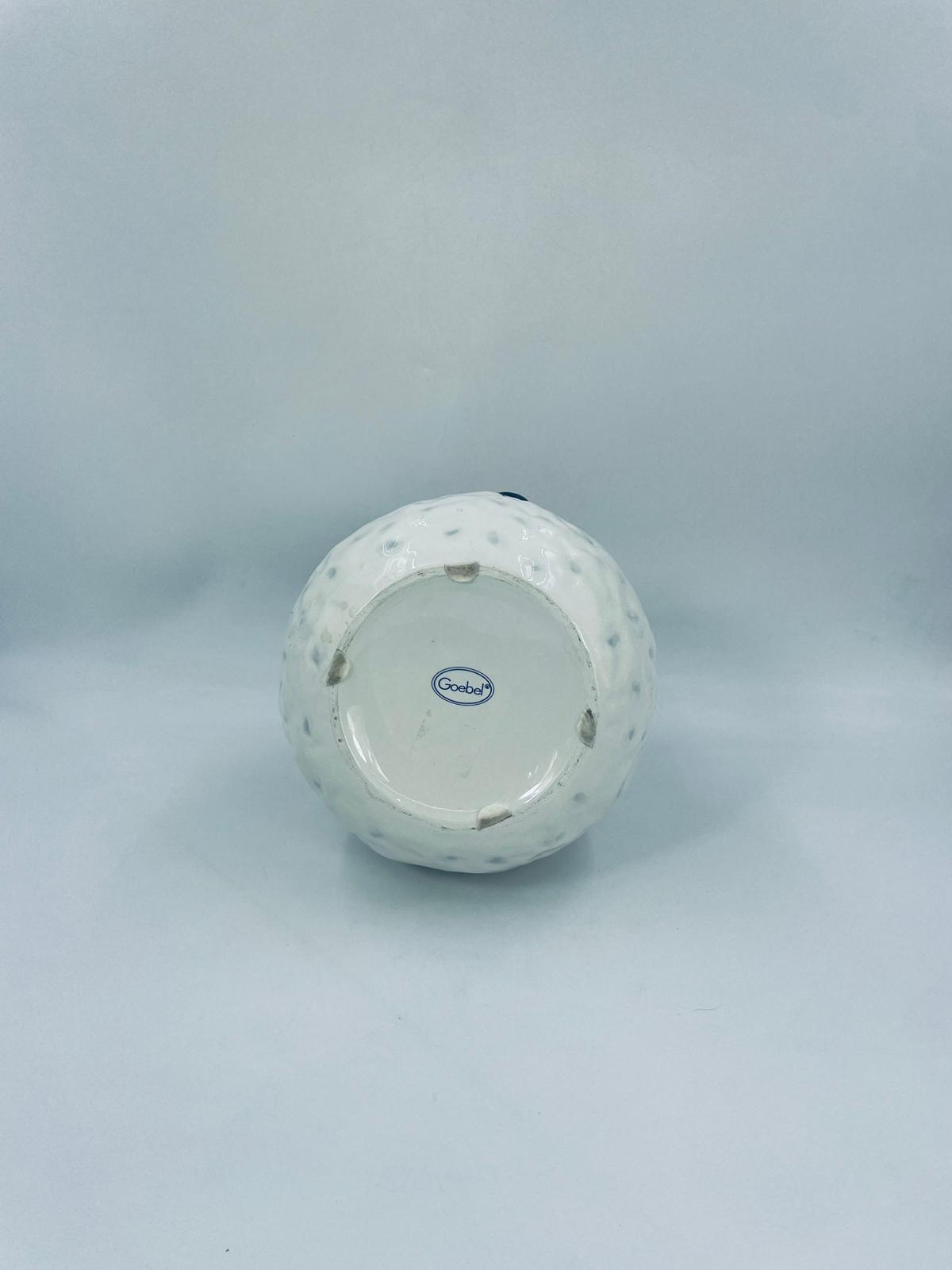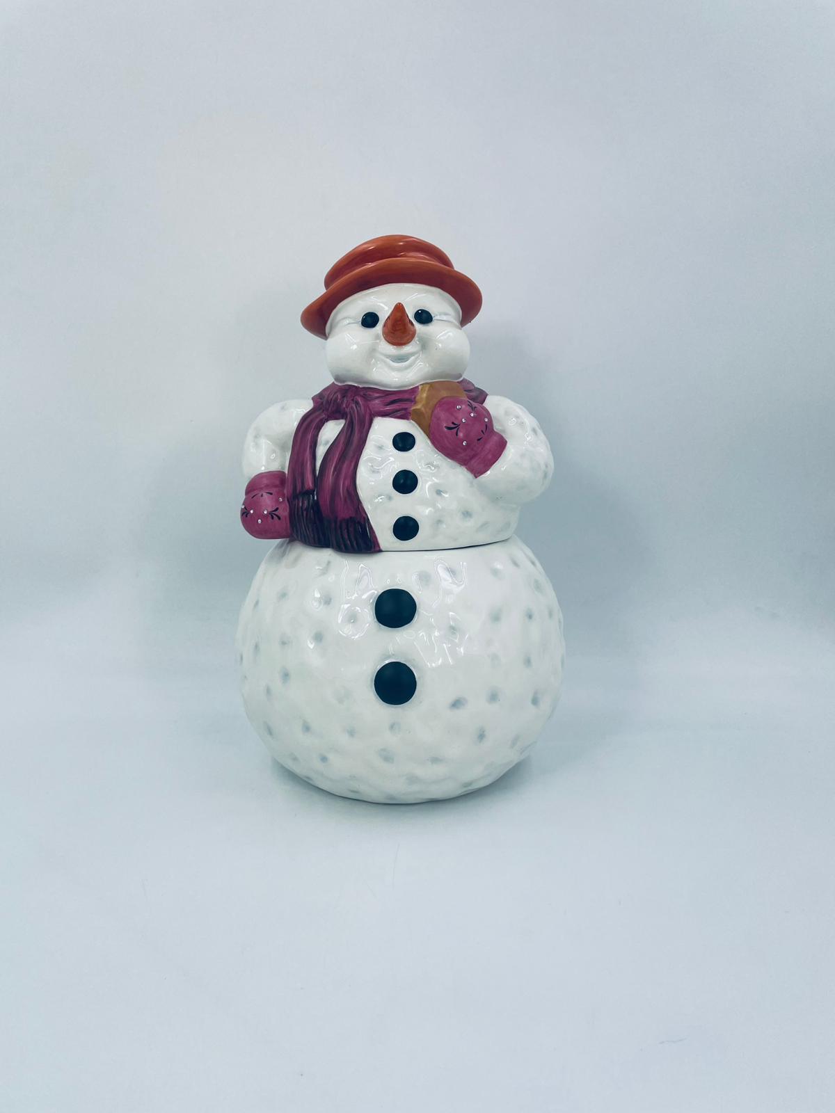 Figurine, container manufactured by Goebel, made of high-quality white porcelain. Figurine in the shape of a snowman, wearing a red hat, purple scarf and gloves with small crystals. The container consists of two parts, the lower round part forming the container, and the upper part forming the lid. The container is used to store cookies, gingerbread or other Christmas treats. There is a small chip on the inside edge.