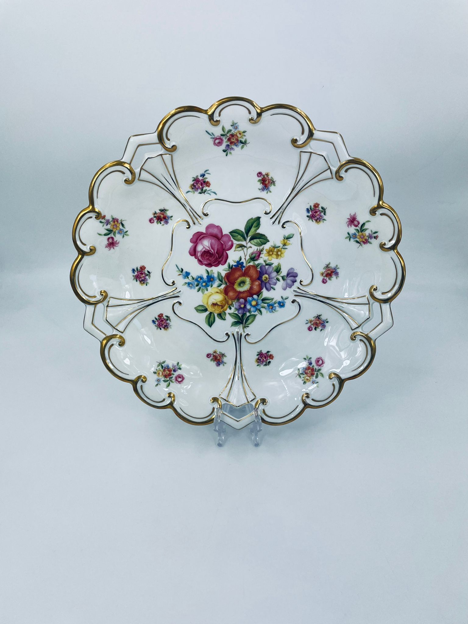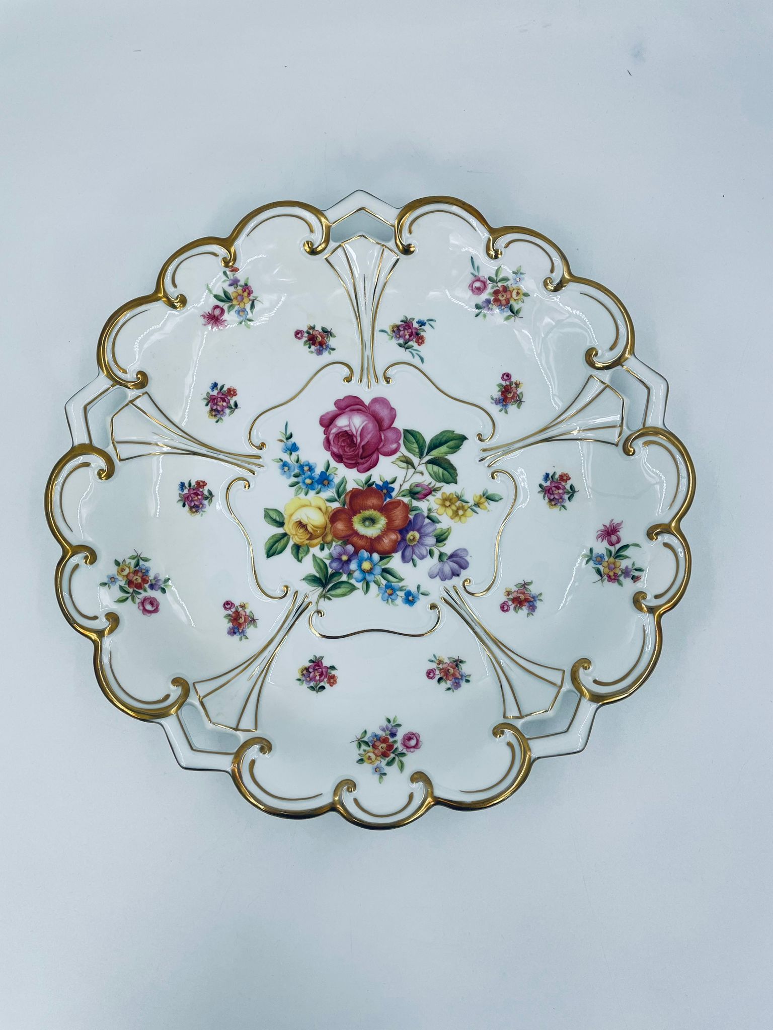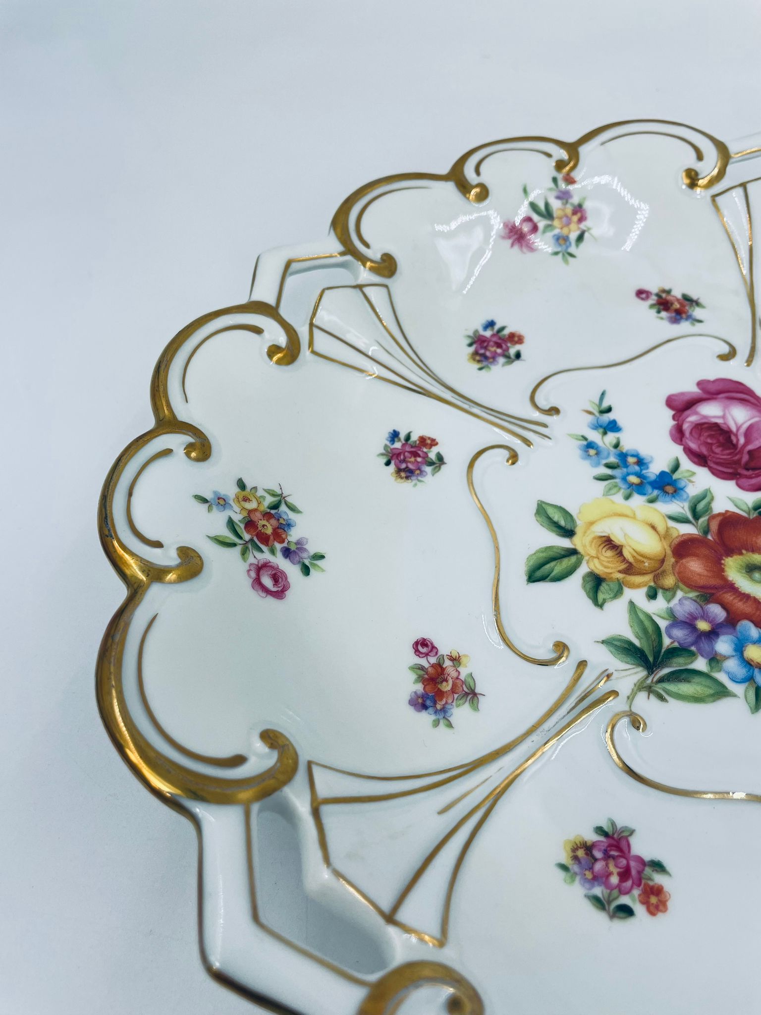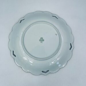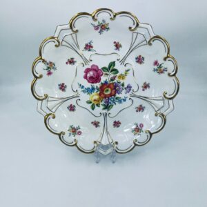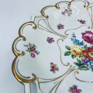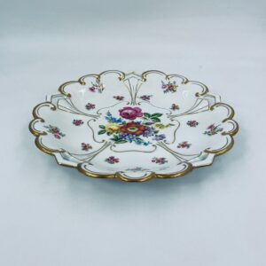 An antique porcelain platter by the Jlmenau factory in white with floral and relief decoration. The platter is finished with gilding on the wavy rim.