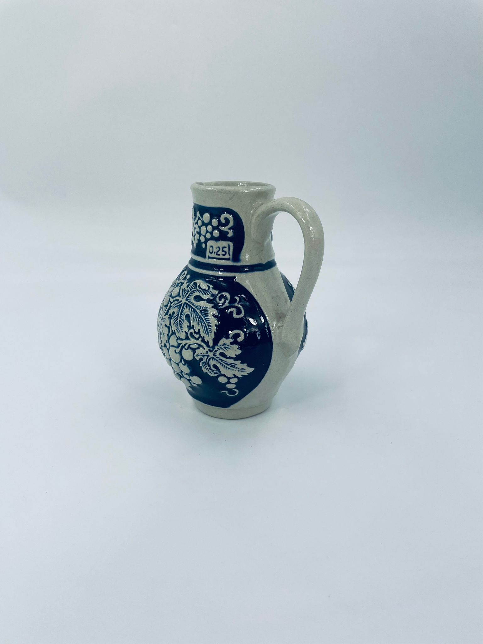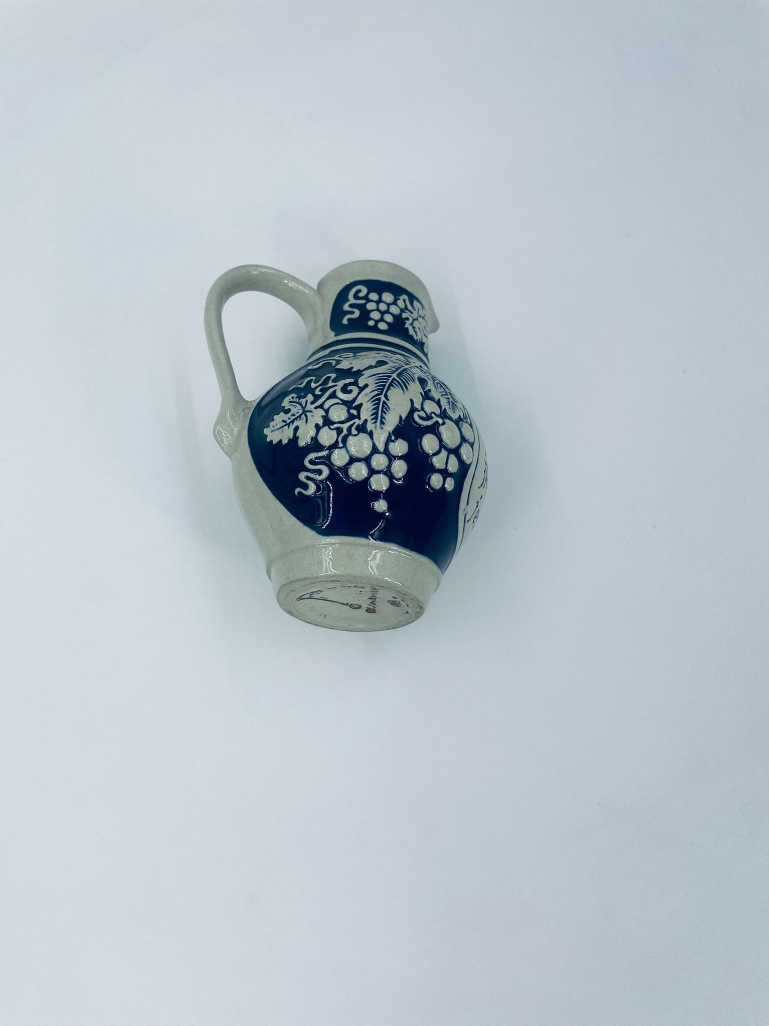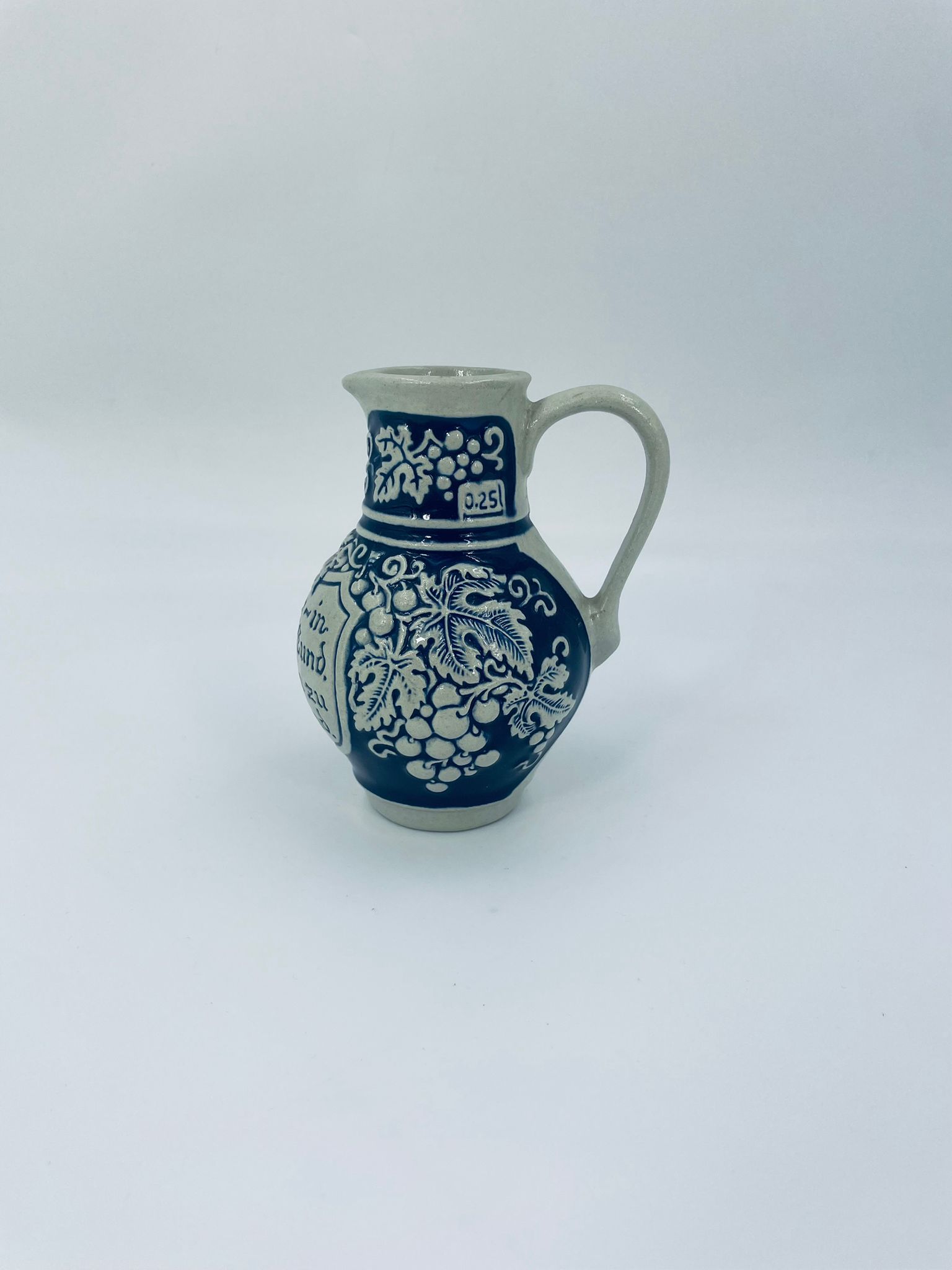 Jug by Gerz Grey Stoneware, made from ceramic with dominant grape and leaf motifs, finished in navy blue. Ideal for serving drinks, wine and as a collectible and decorative piece.