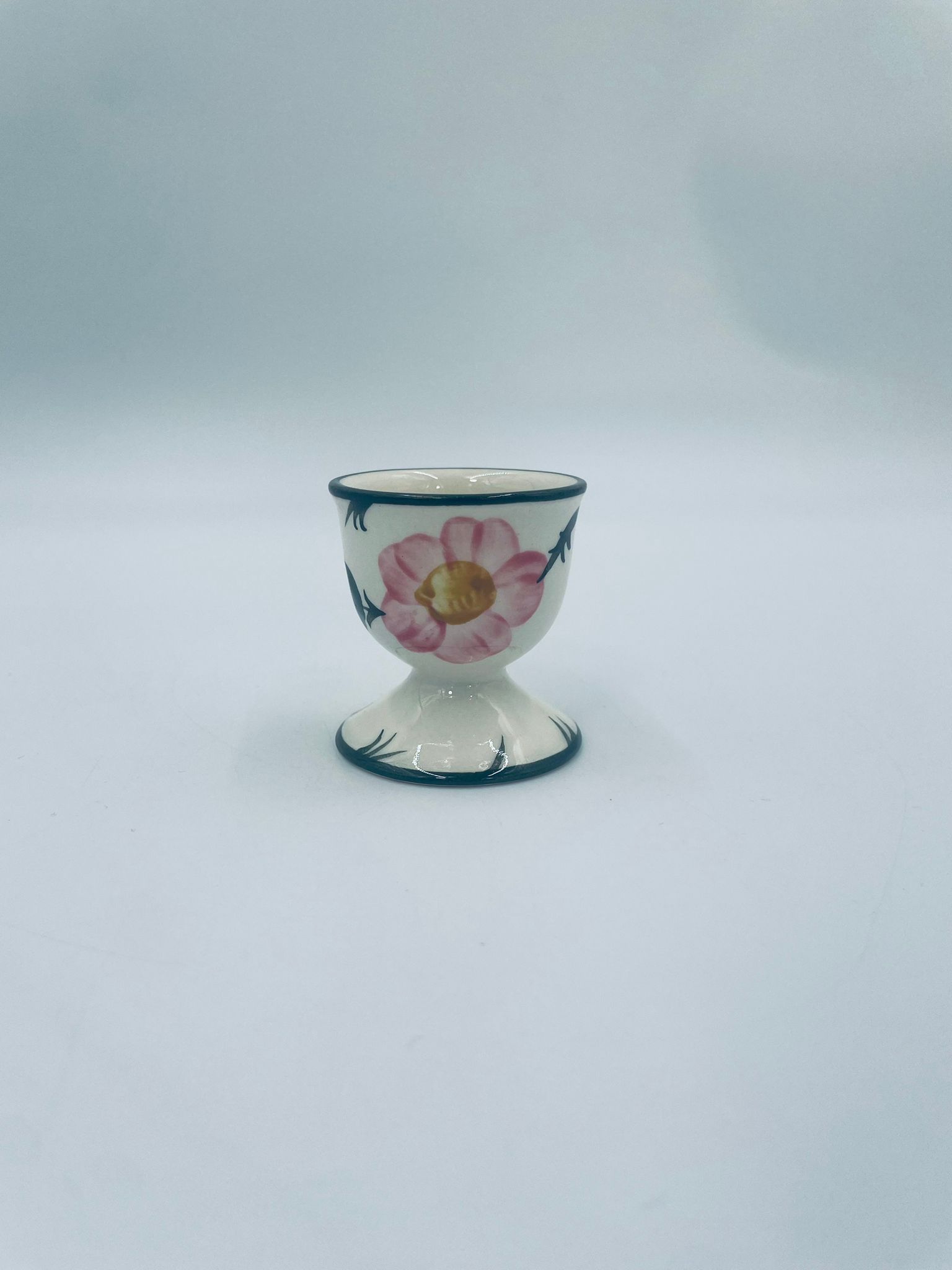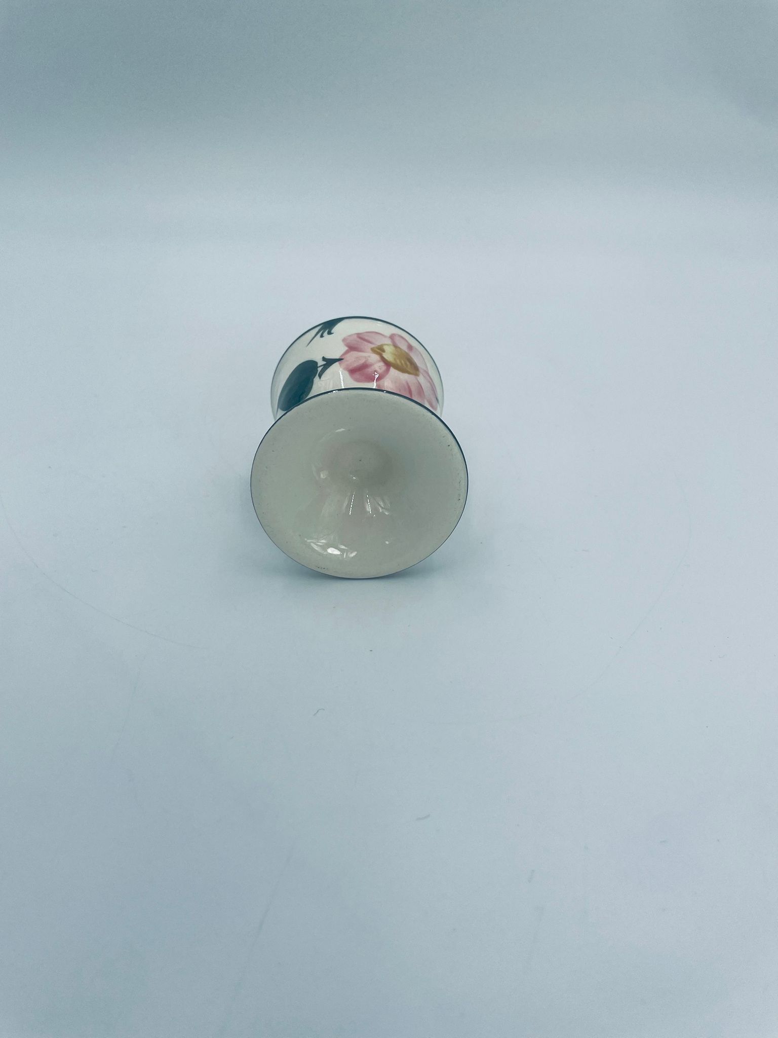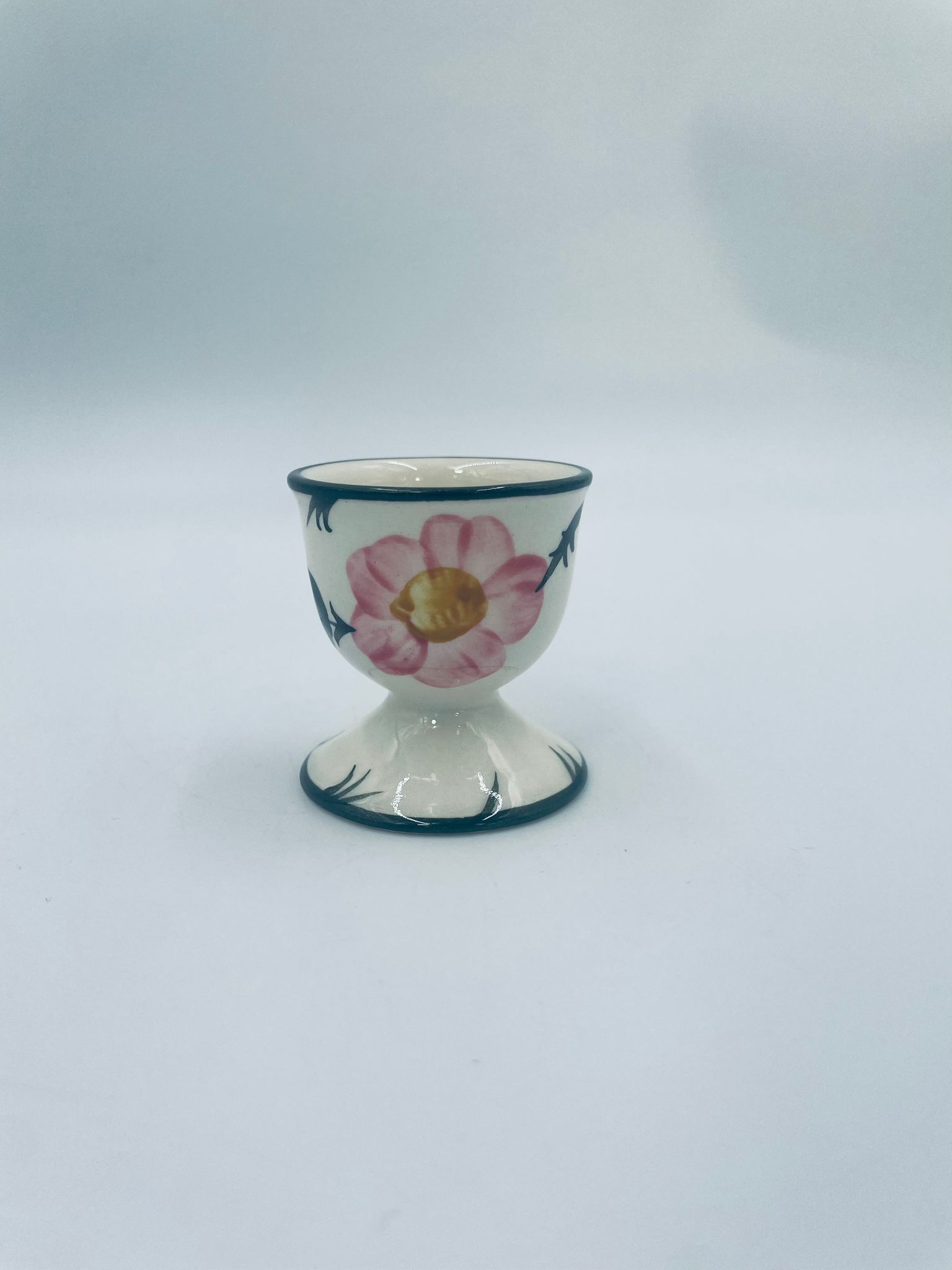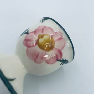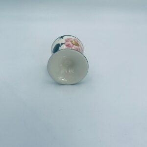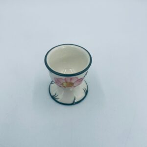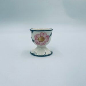 Kieliszek do jajka wytwórni Villeroy & Boch z kolekcji Wildrose zaprojektowany w 1969r, wykonany z wysokiej jakości porcelany w kolorze ecru. Jajcarka ozdobiona motywem ręczne malowanych różowych kwiatów i zielonych liści, wykończona zieloną obwódką na krawędziach.