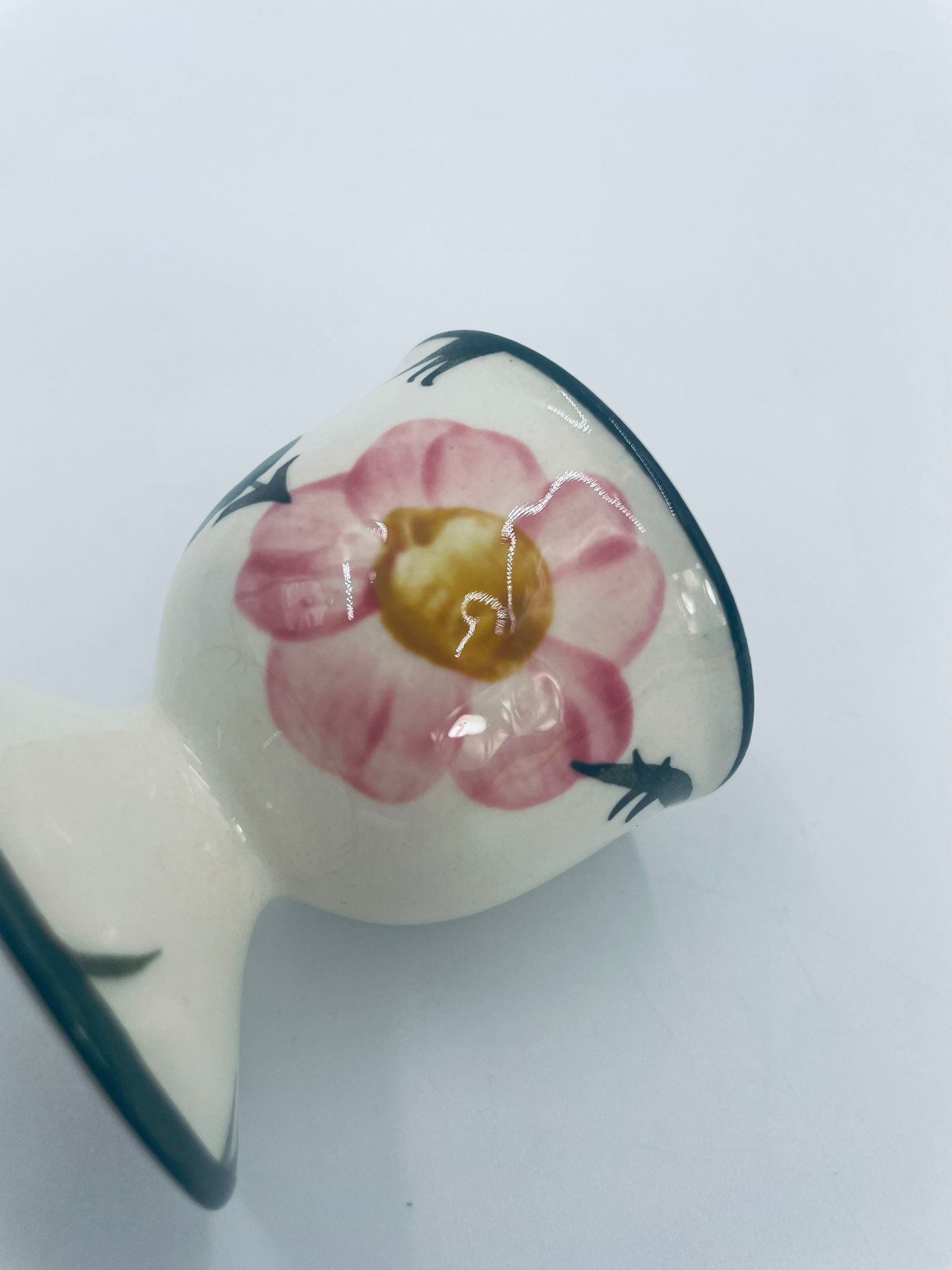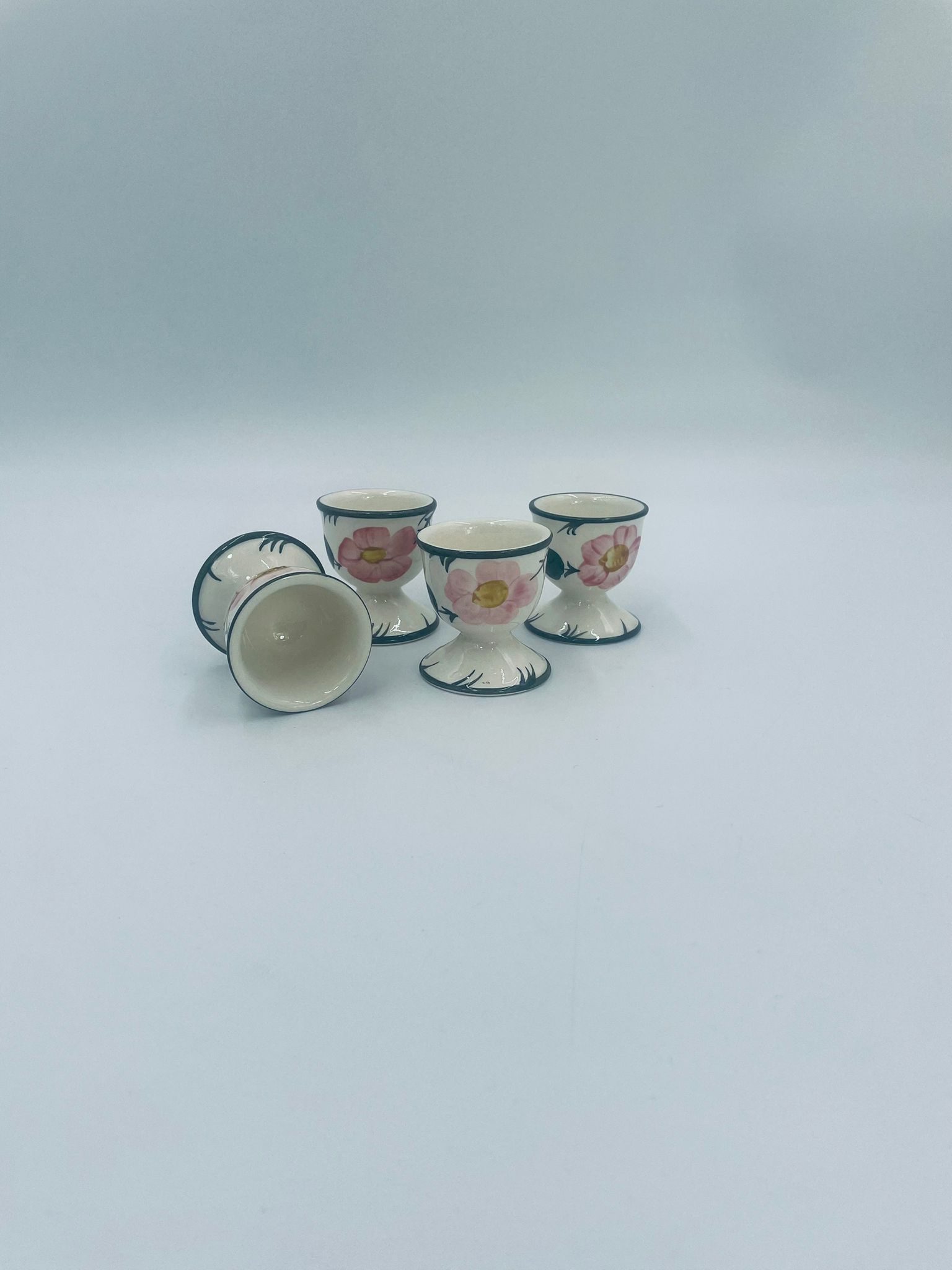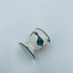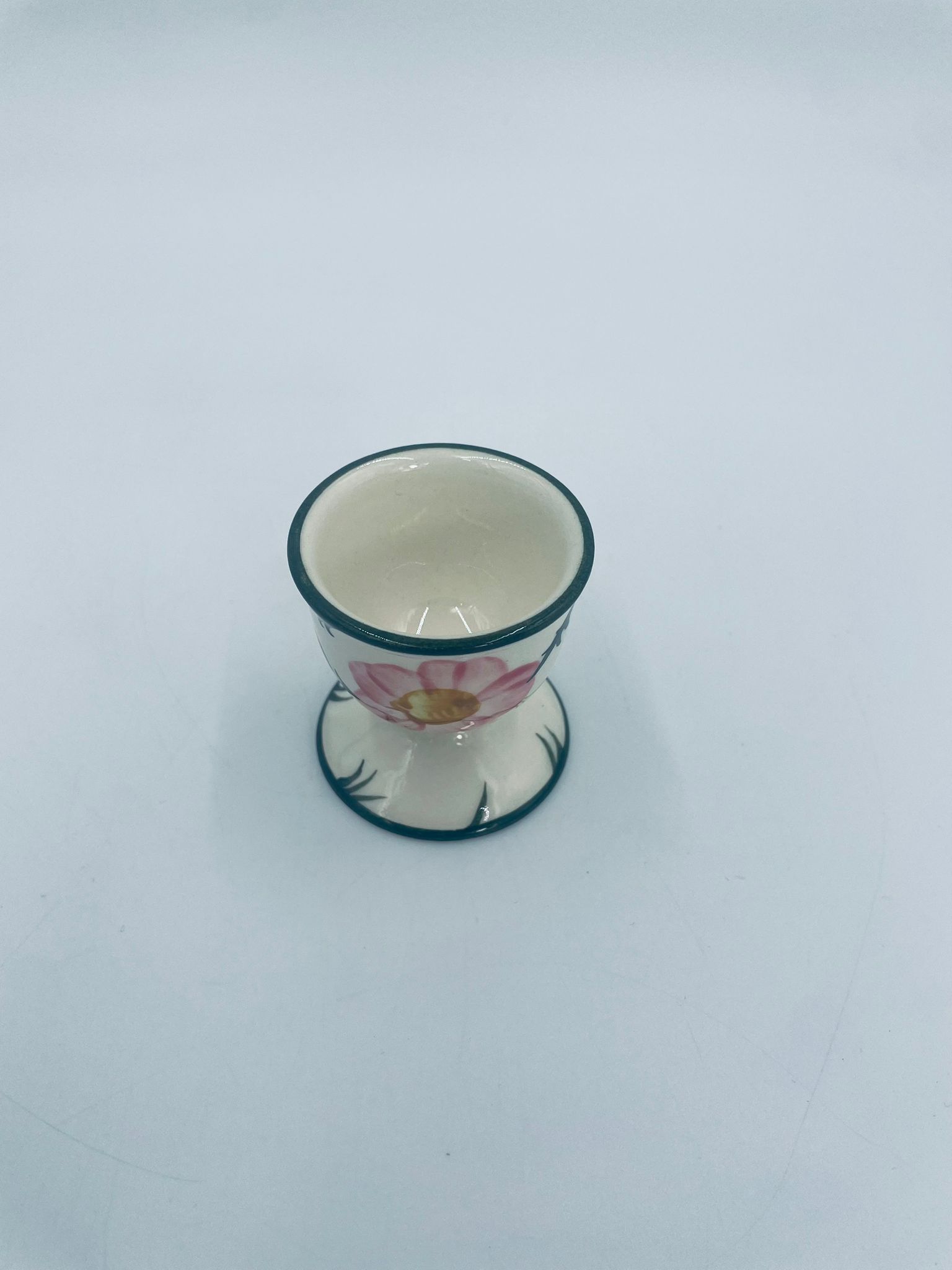 Kieliszek do jajka wytwórni Villeroy & Boch z kolekcji Wildrose zaprojektowany w 1969r, wykonany z wysokiej jakości porcelany w kolorze ecru. Jajcarka ozdobiona motywem ręczne malowanych różowych kwiatów i zielonych liści, wykończona zieloną obwódką na krawędziach.