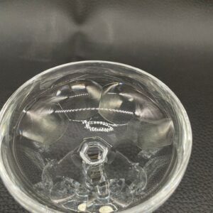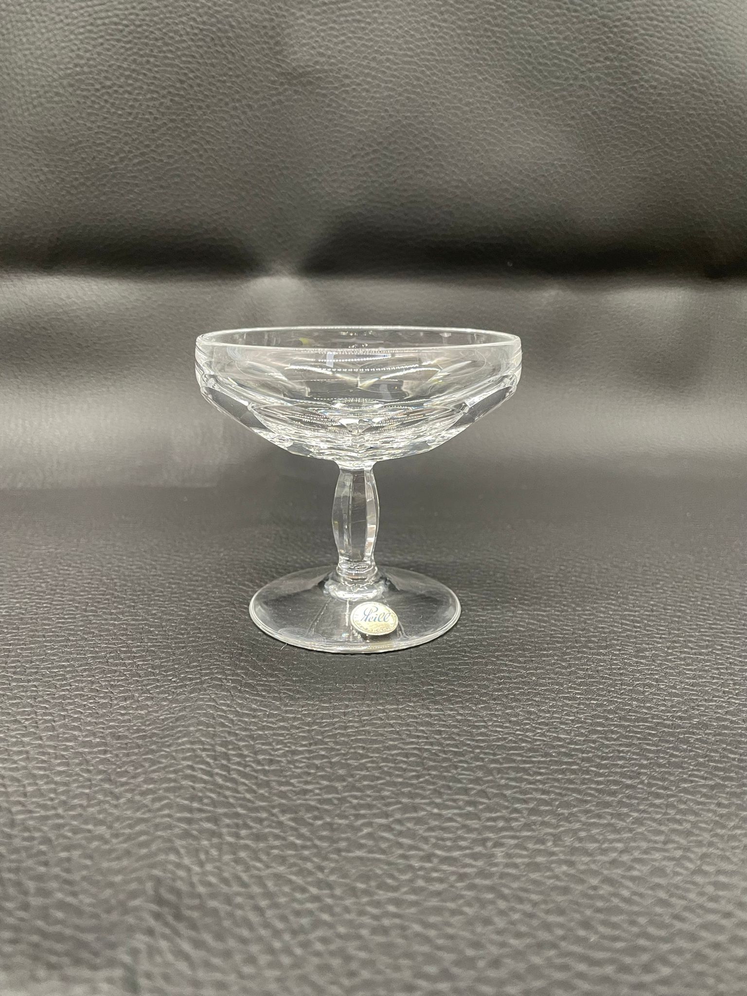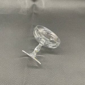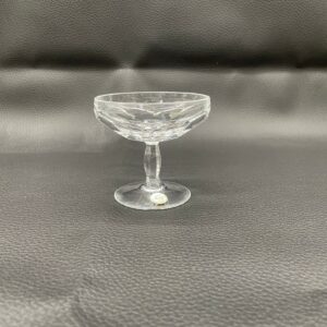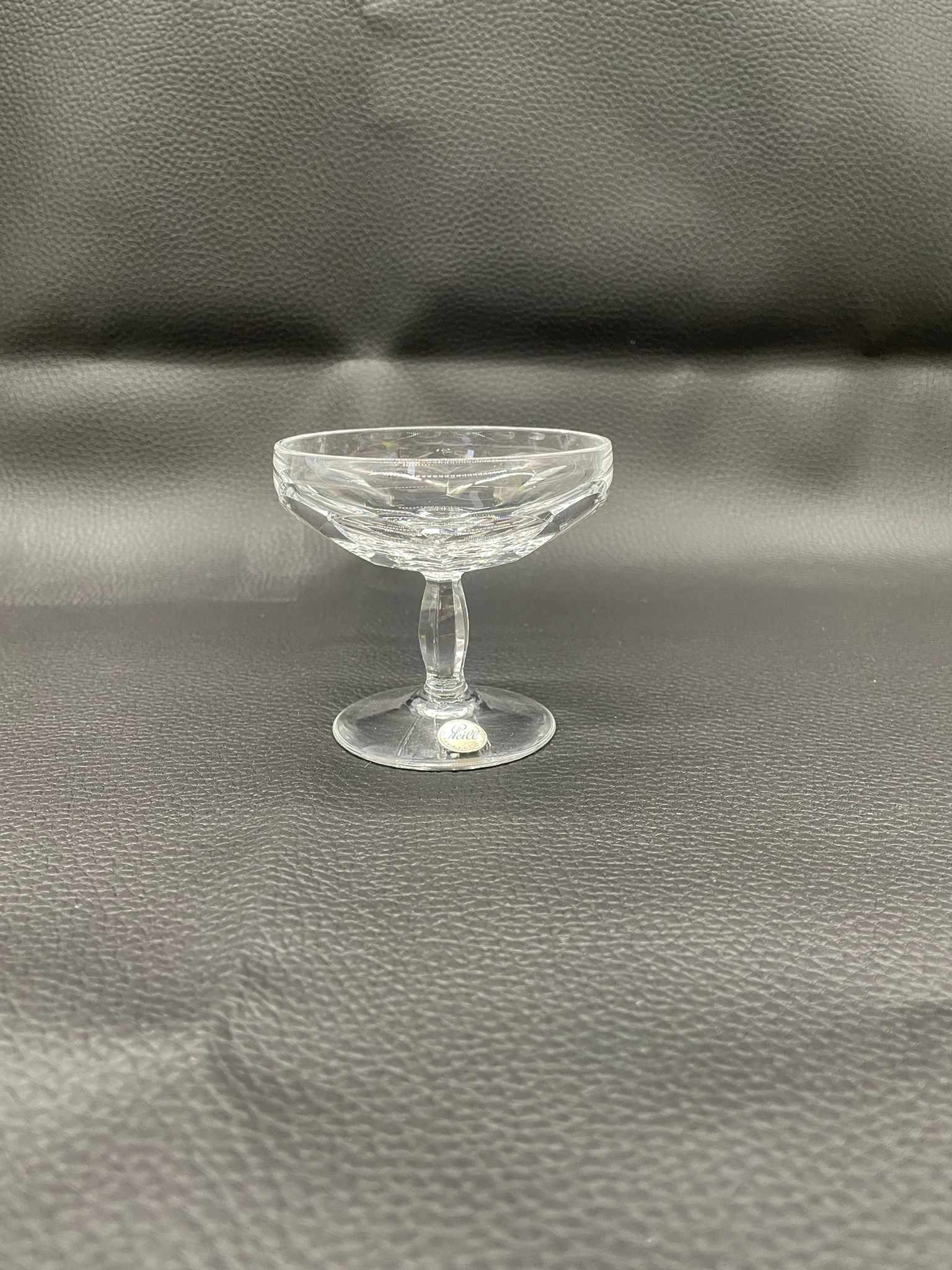 Kieliszek do szampana, likieru wyprodukowany przez Niemiecka hutę szkła Peill & Putzler z serii „Marion” z lat 70tych., wykonany z wysokiej jakości szkła kryształowego ołowiowego. Kieliszek charakteryzuje się ręcznie ciętą, przezroczystą, fasetowana , szeroką czarą typu coupé oraz ozdobną, fasetowana, smukłą nóżką z wyraźnym zgrubieniem po środku i stabilną podstawą.