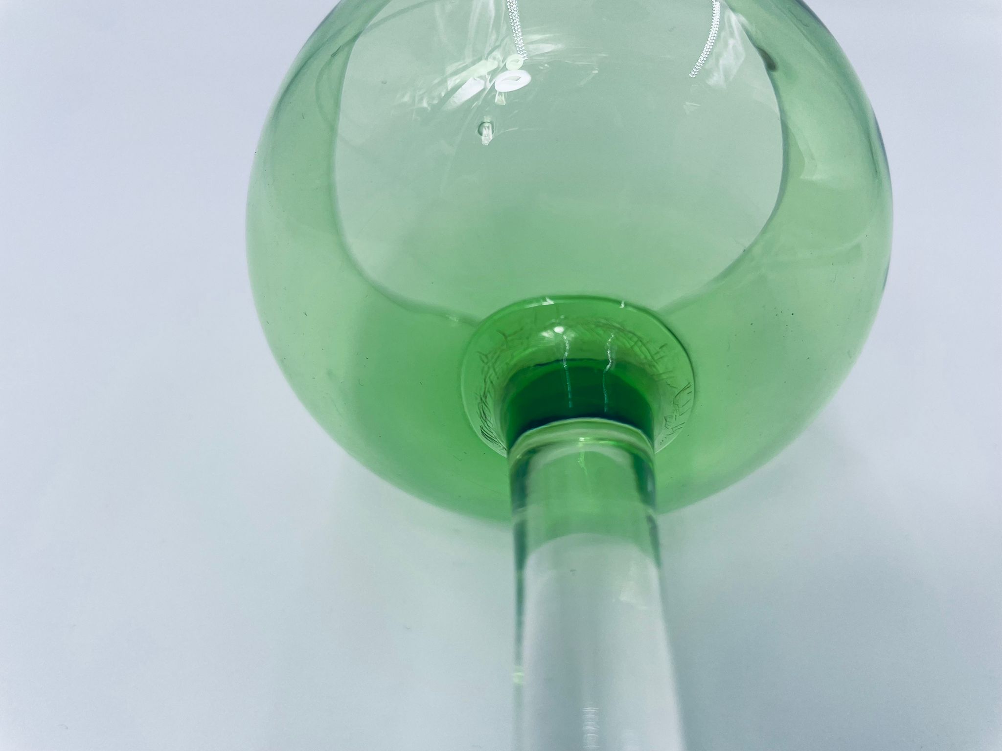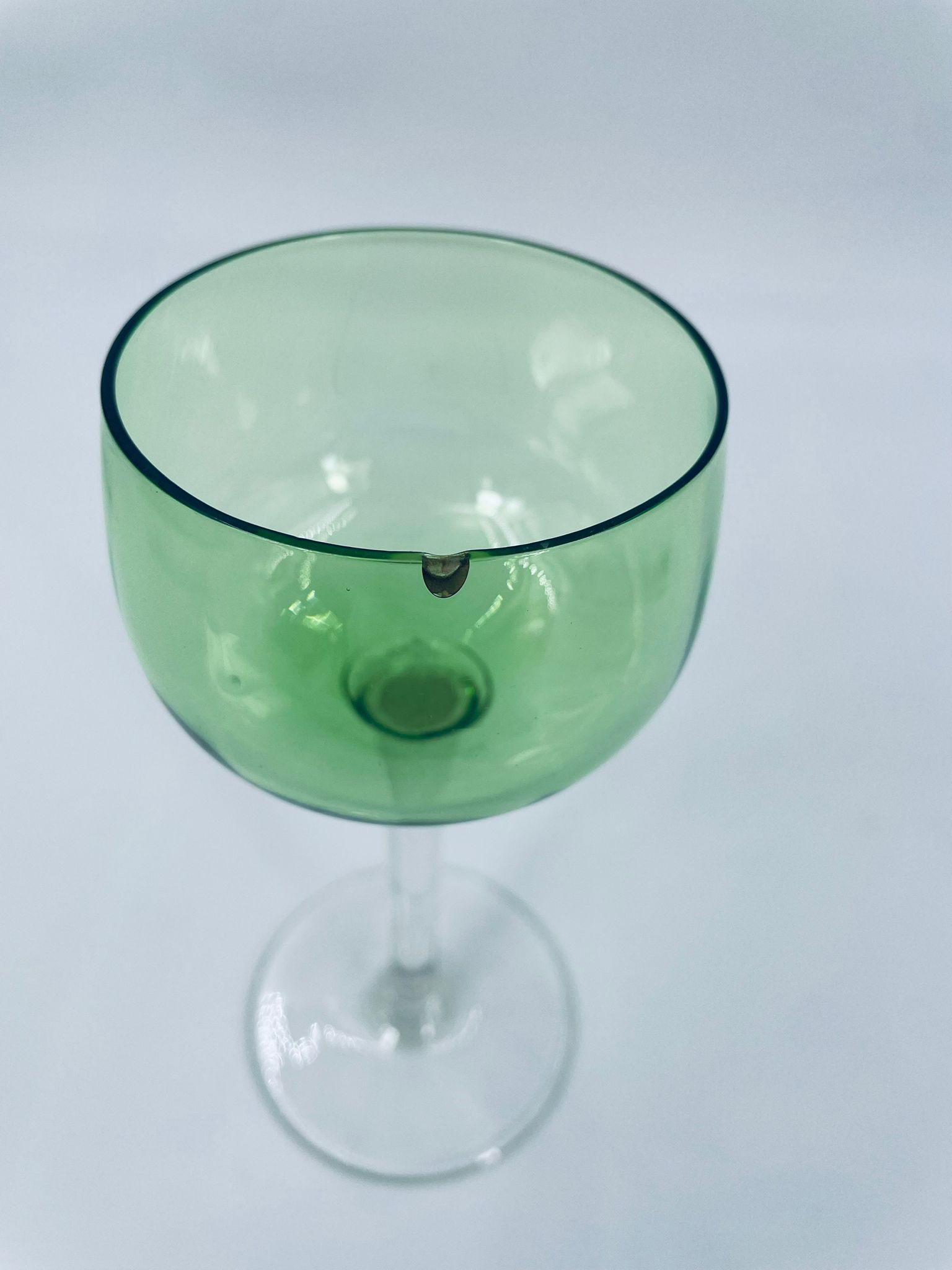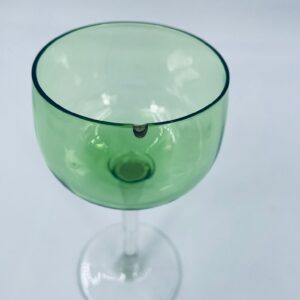 Kieliszek do wina wykonany z wysokiej jakości szkła kryształowego. Charakteryzuje się zieloną czaszą oraz długą i smukłą nóżką ze stabilną podstawą. Kieliszek posiada zarysowania oraz uszczerbek na górnym rancie.