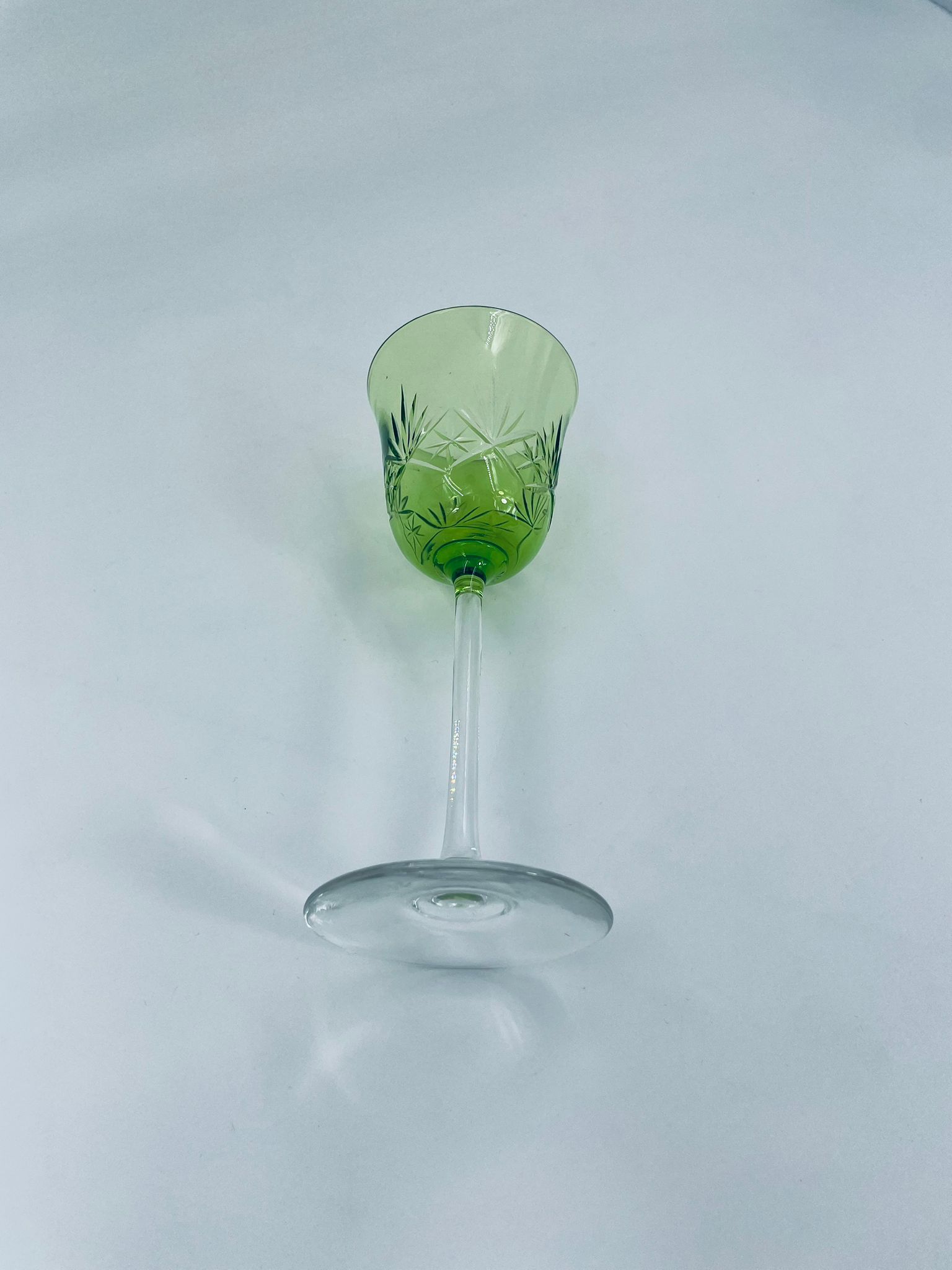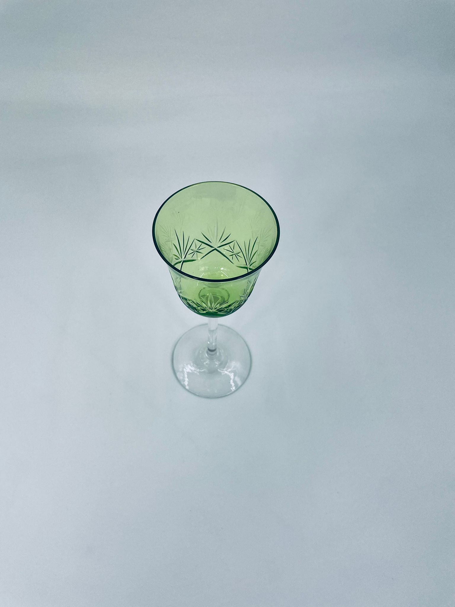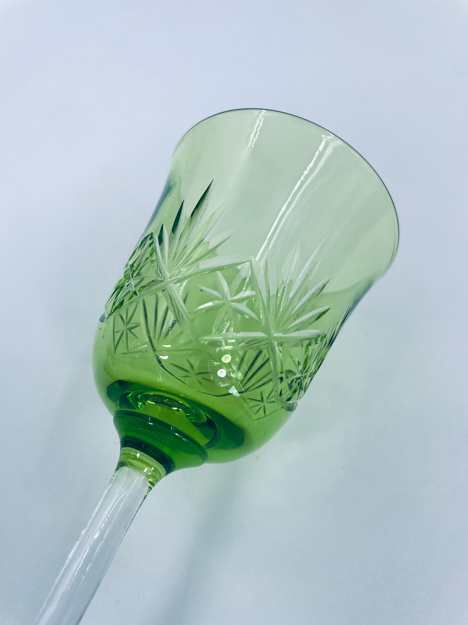 Kieliszek do wina wykonany ze szkła kryształowego. Czara barwiona kolorem limonkowym z bogatymi, szlifowanymi zdobieniami.