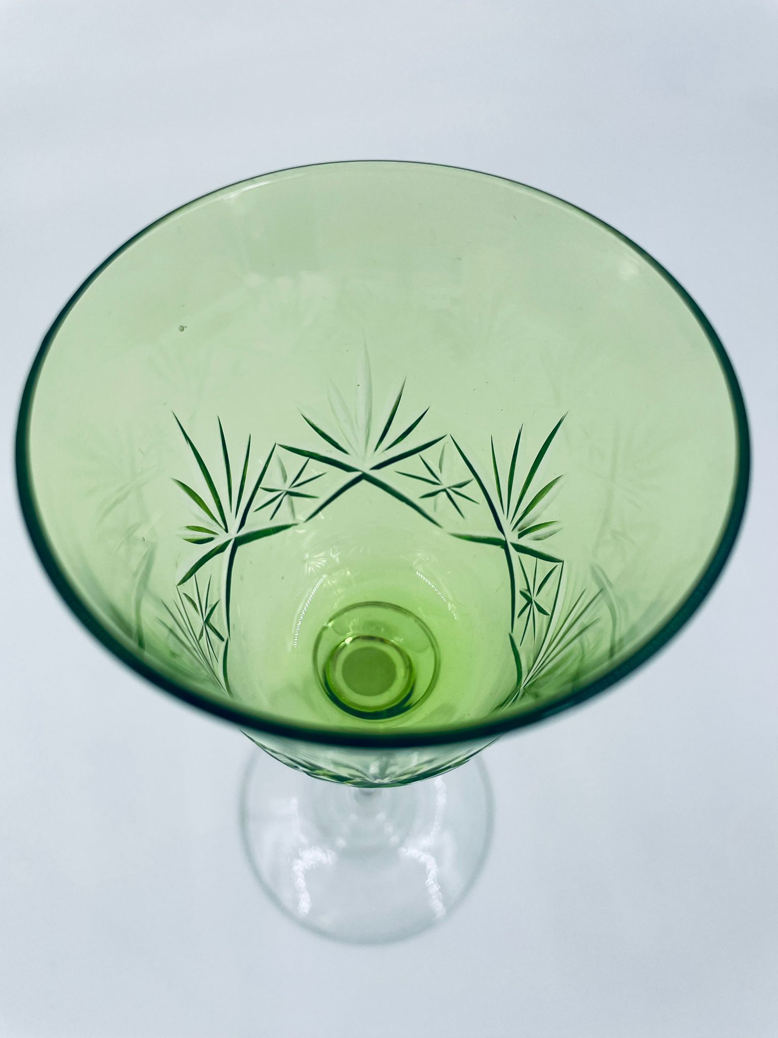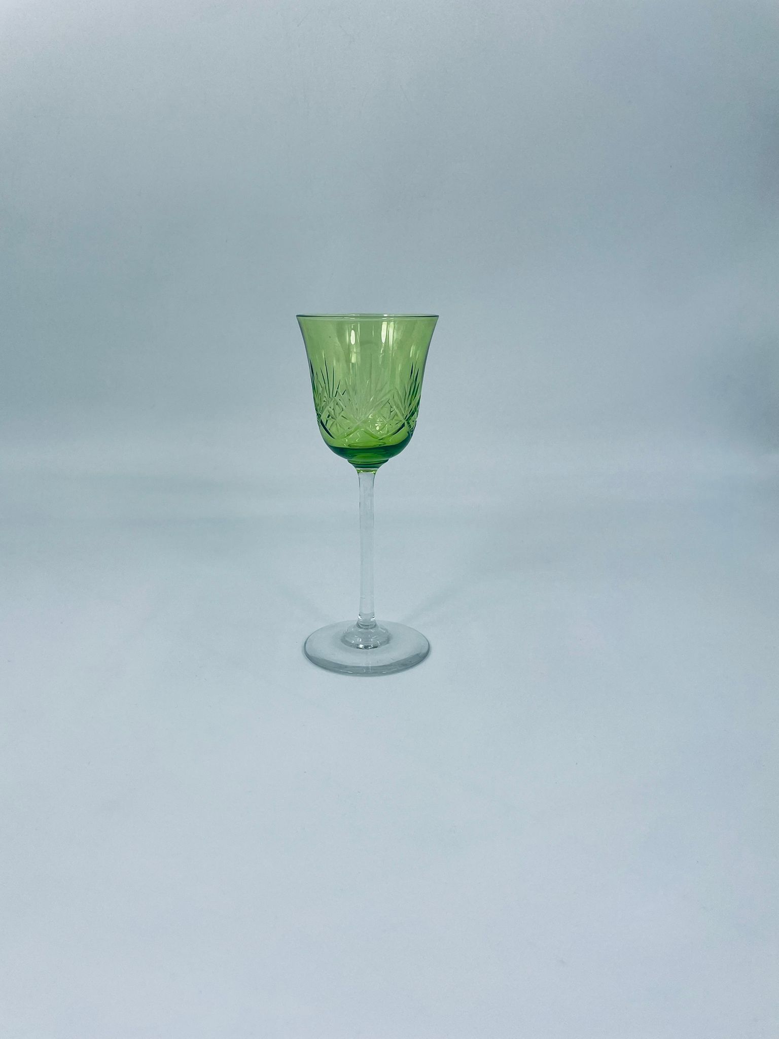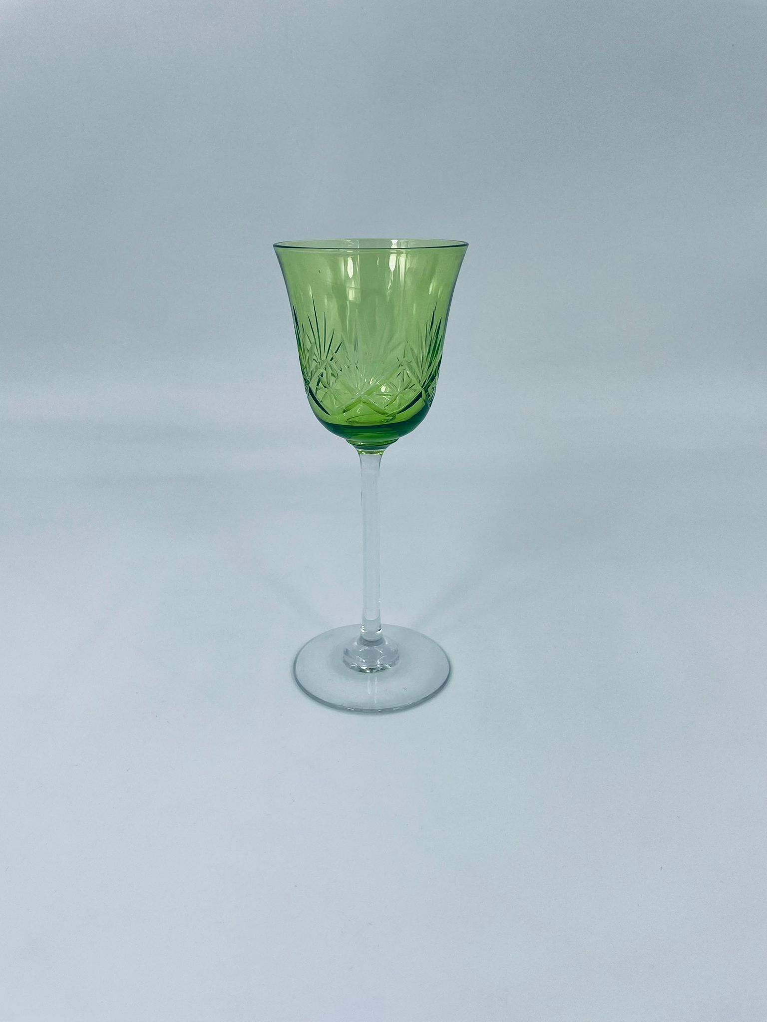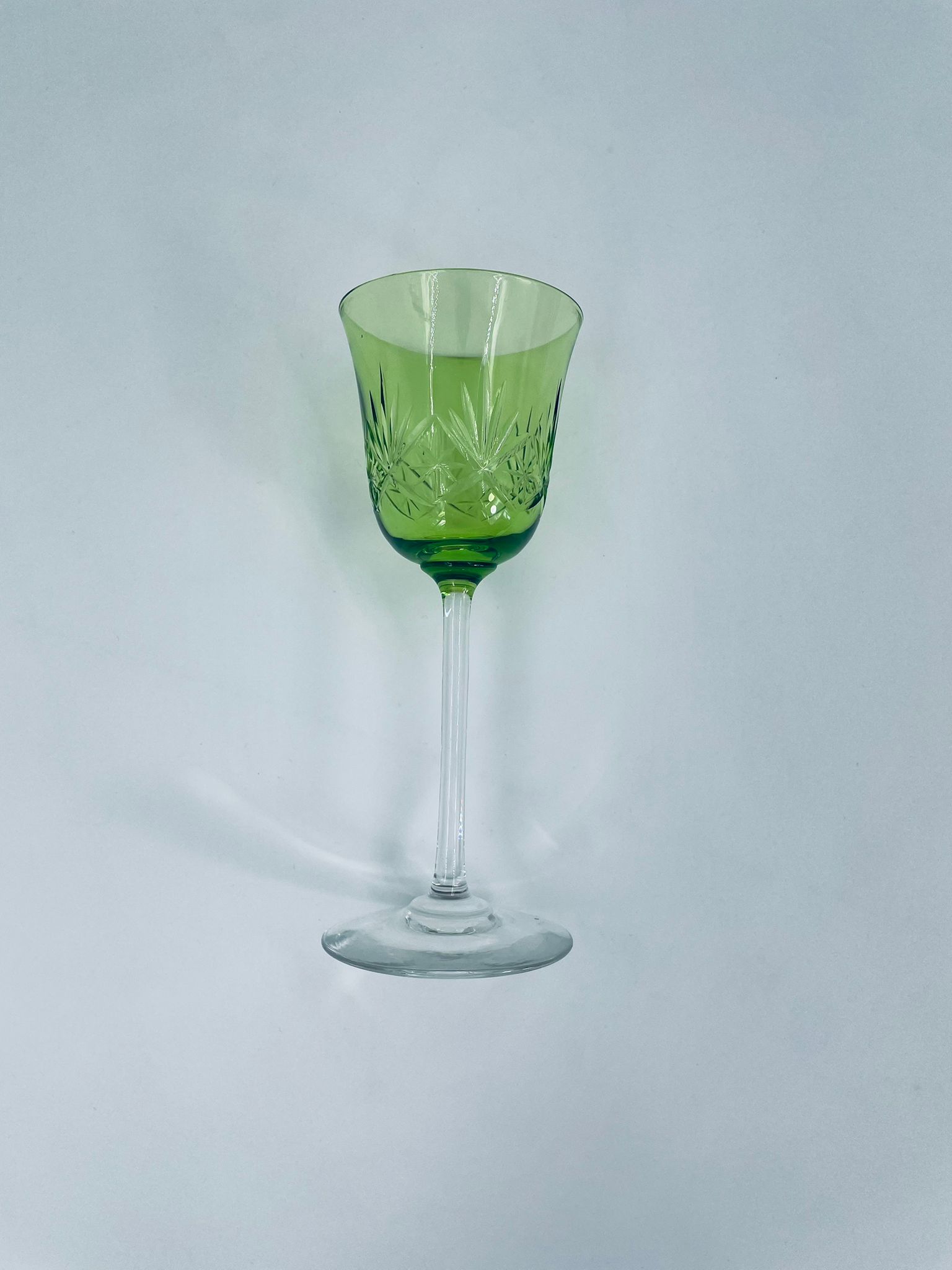 Kieliszek do wina wykonany ze szkła kryształowego. Czara barwiona kolorem limonkowym z bogatymi, szlifowanymi zdobieniami.
