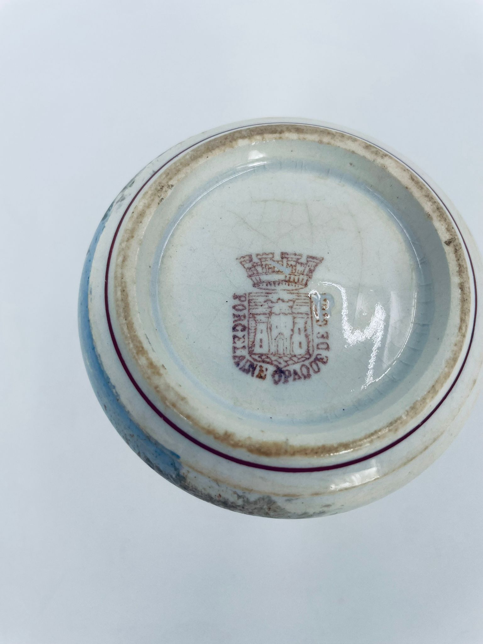 Kitchen container by the French label Opaque de Gien made of ceramic. Container with the design of a castle on a bridge and the inscription Safran. It has a crack in the glaze.