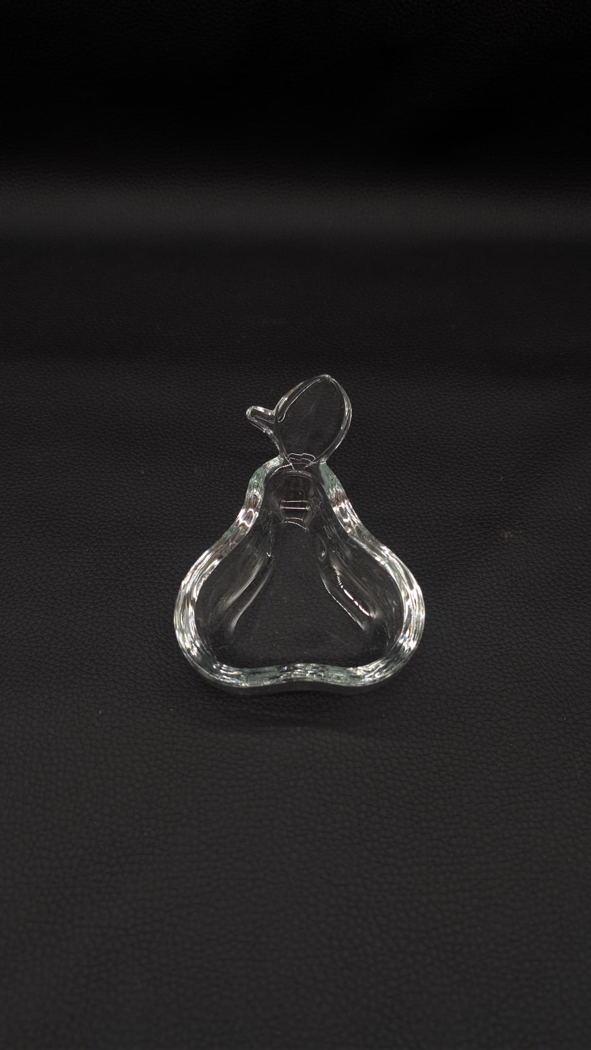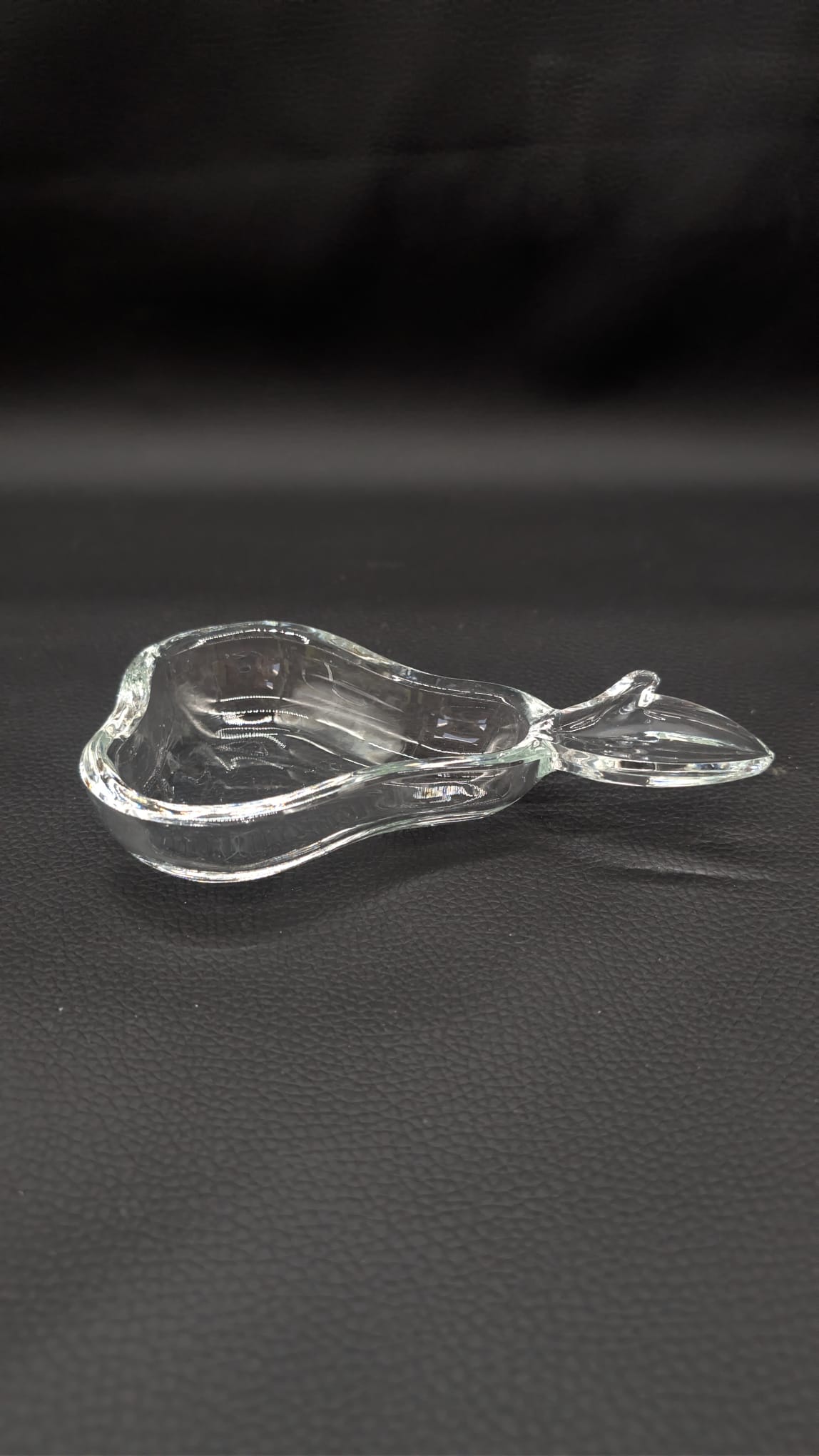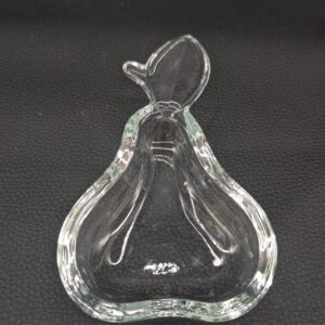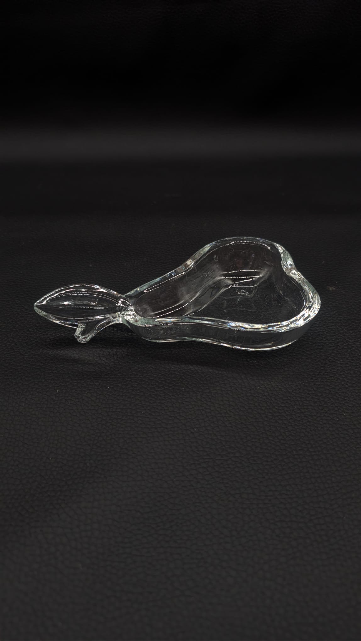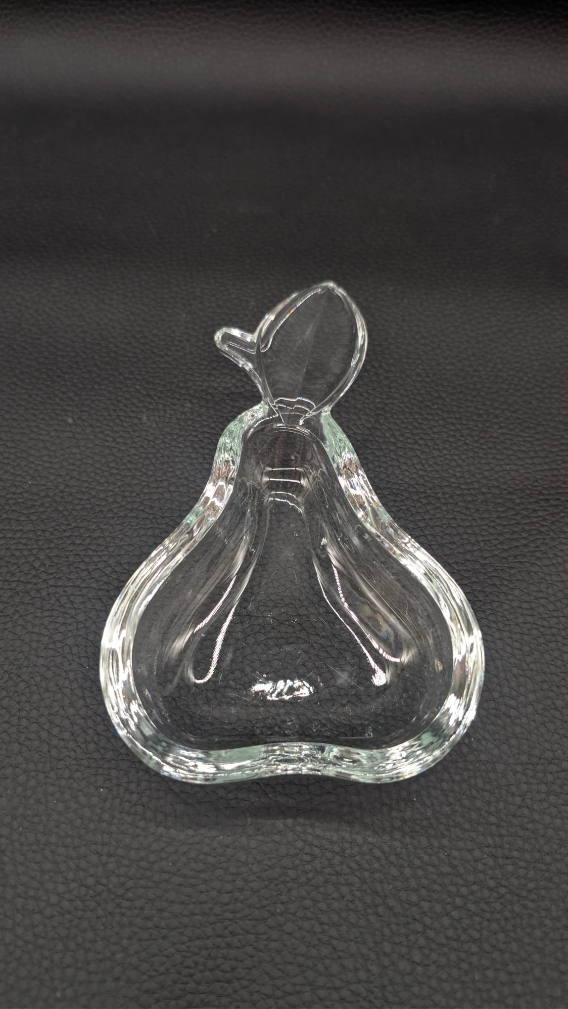 Kryształowa miska w kształcie gruszki w stylu vintage. Przedmiot ma delikatny, przezroczysty wygląd, który nadaje mu elegancki charakter. Może być wykorzystywana jako dekoracja lub do przechowywania drobnych przedmiotów.
