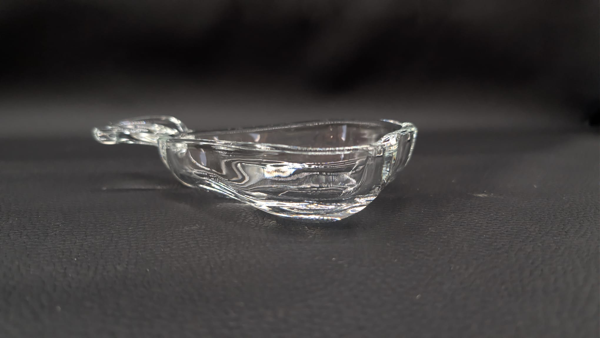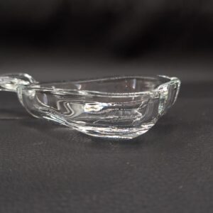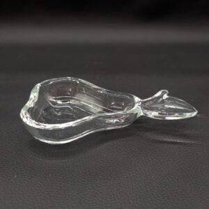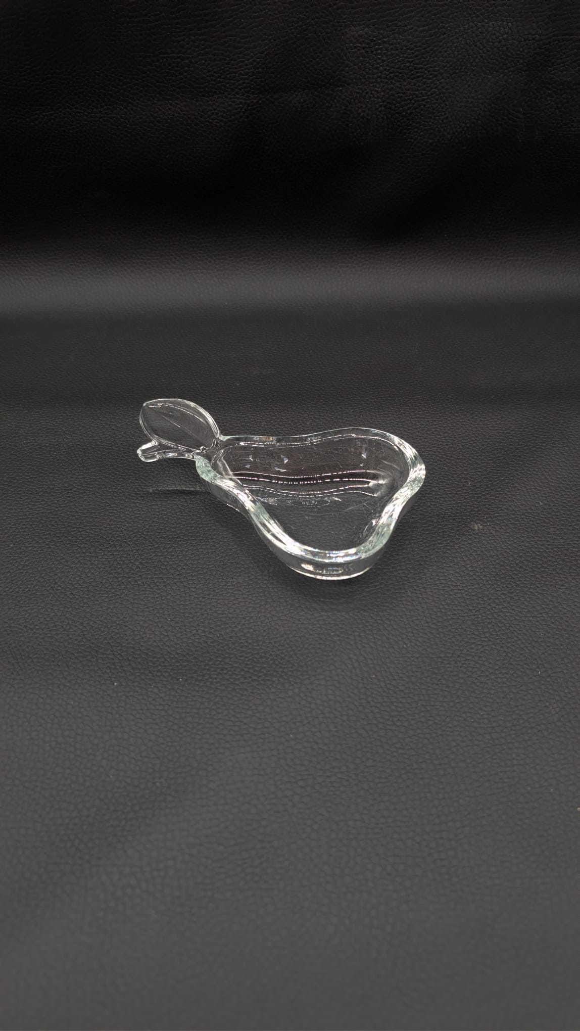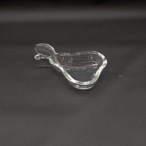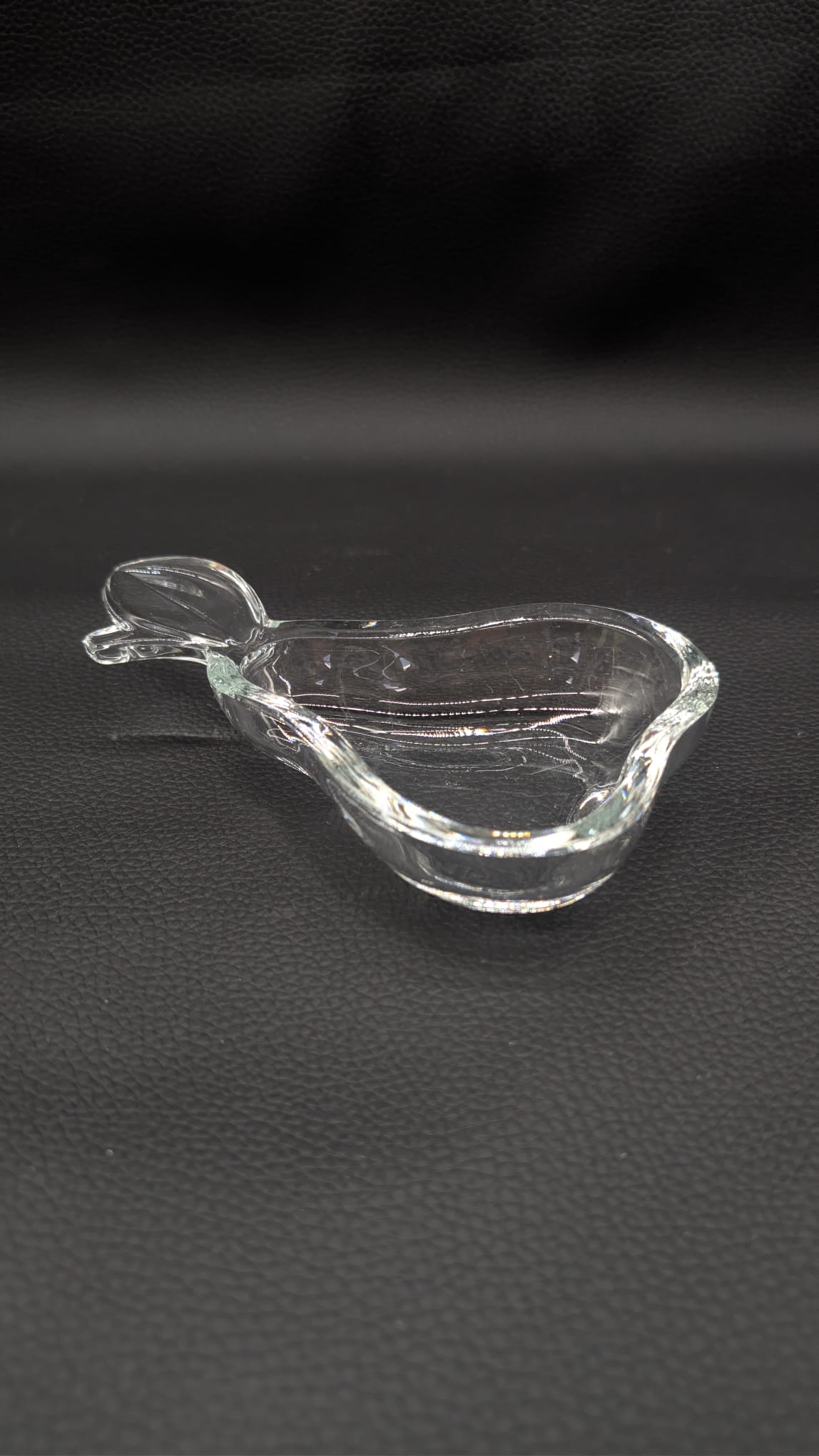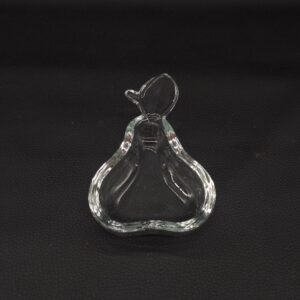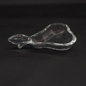 Kryształowa miska w kształcie gruszki w stylu vintage. Przedmiot ma delikatny, przezroczysty wygląd, który nadaje mu elegancki charakter. Może być wykorzystywana jako dekoracja lub do przechowywania drobnych przedmiotów.