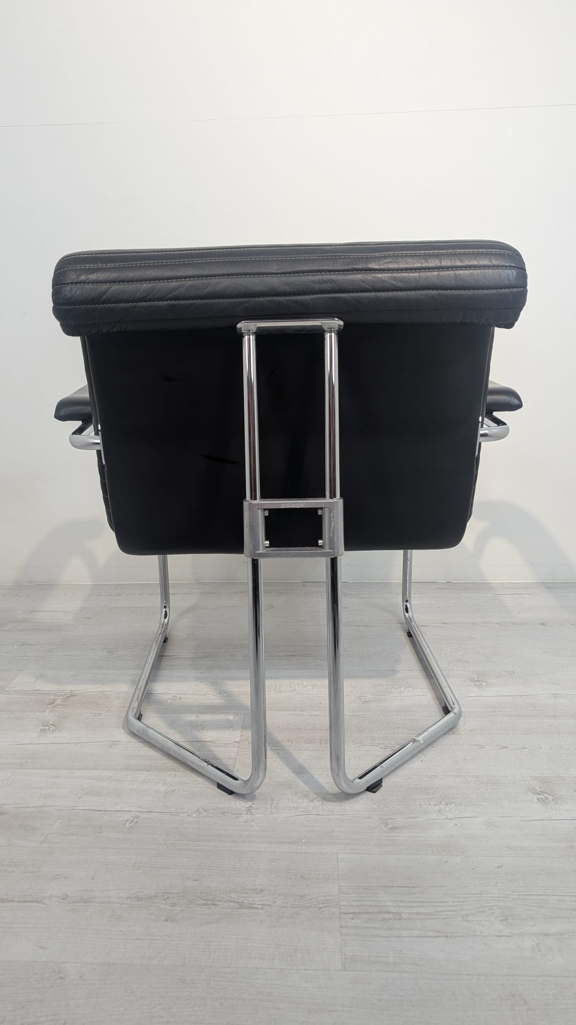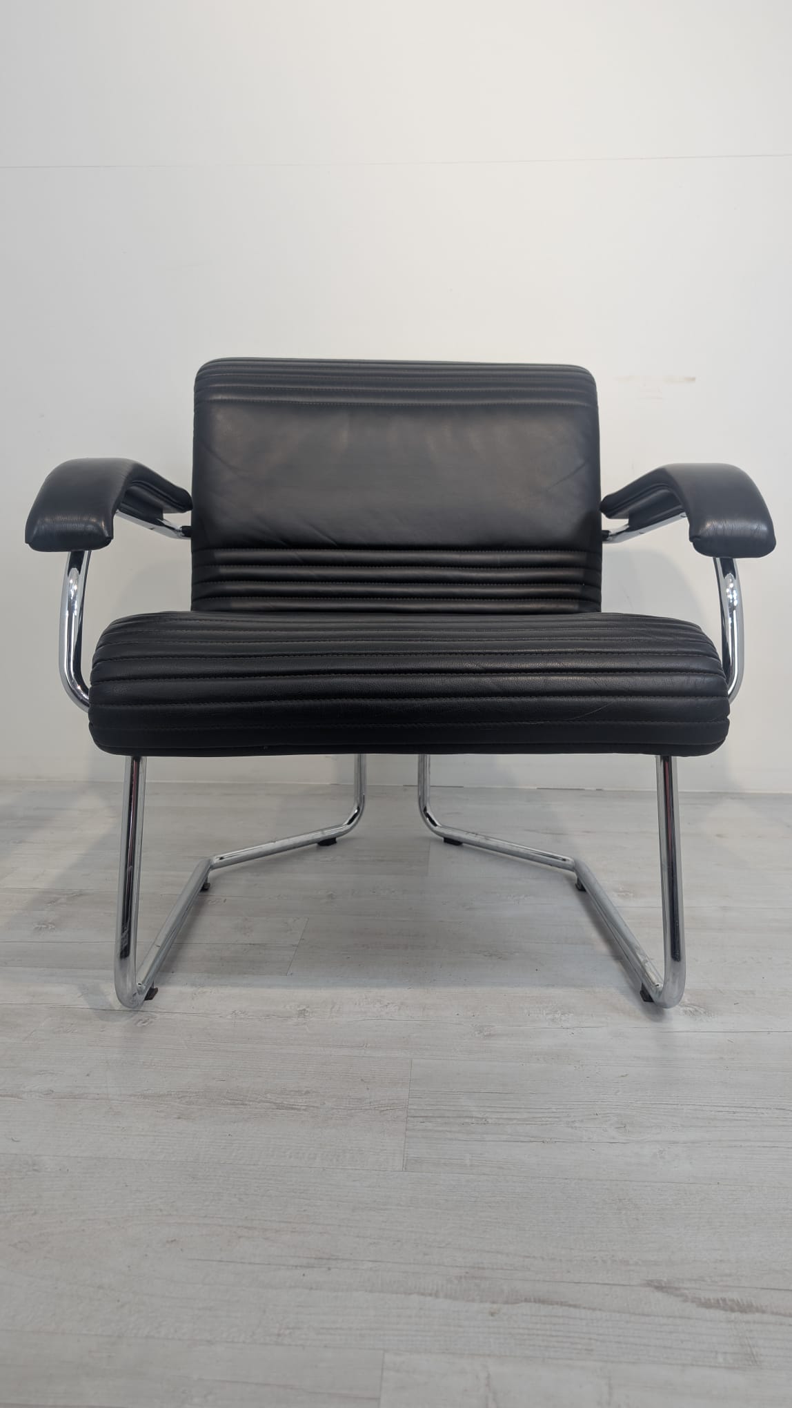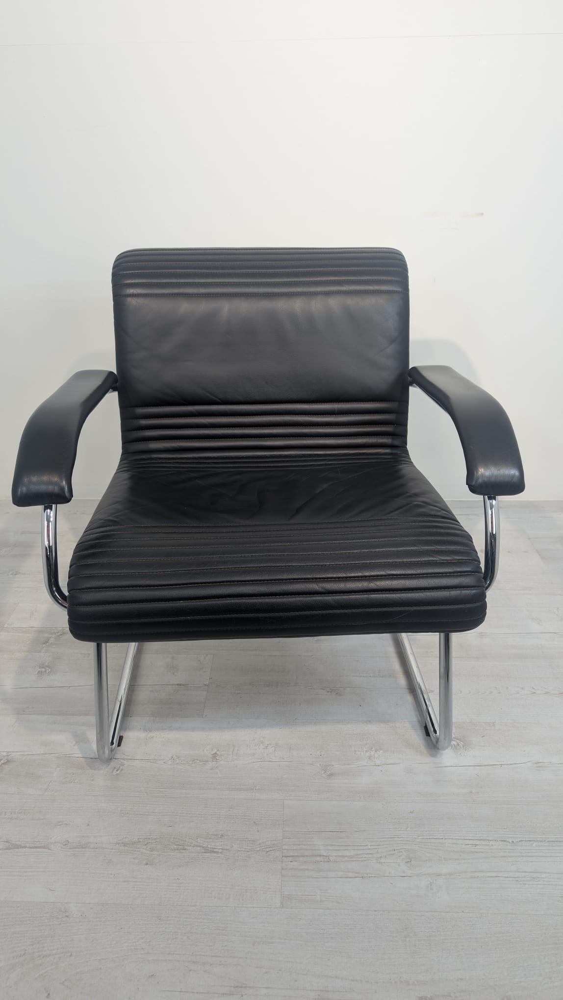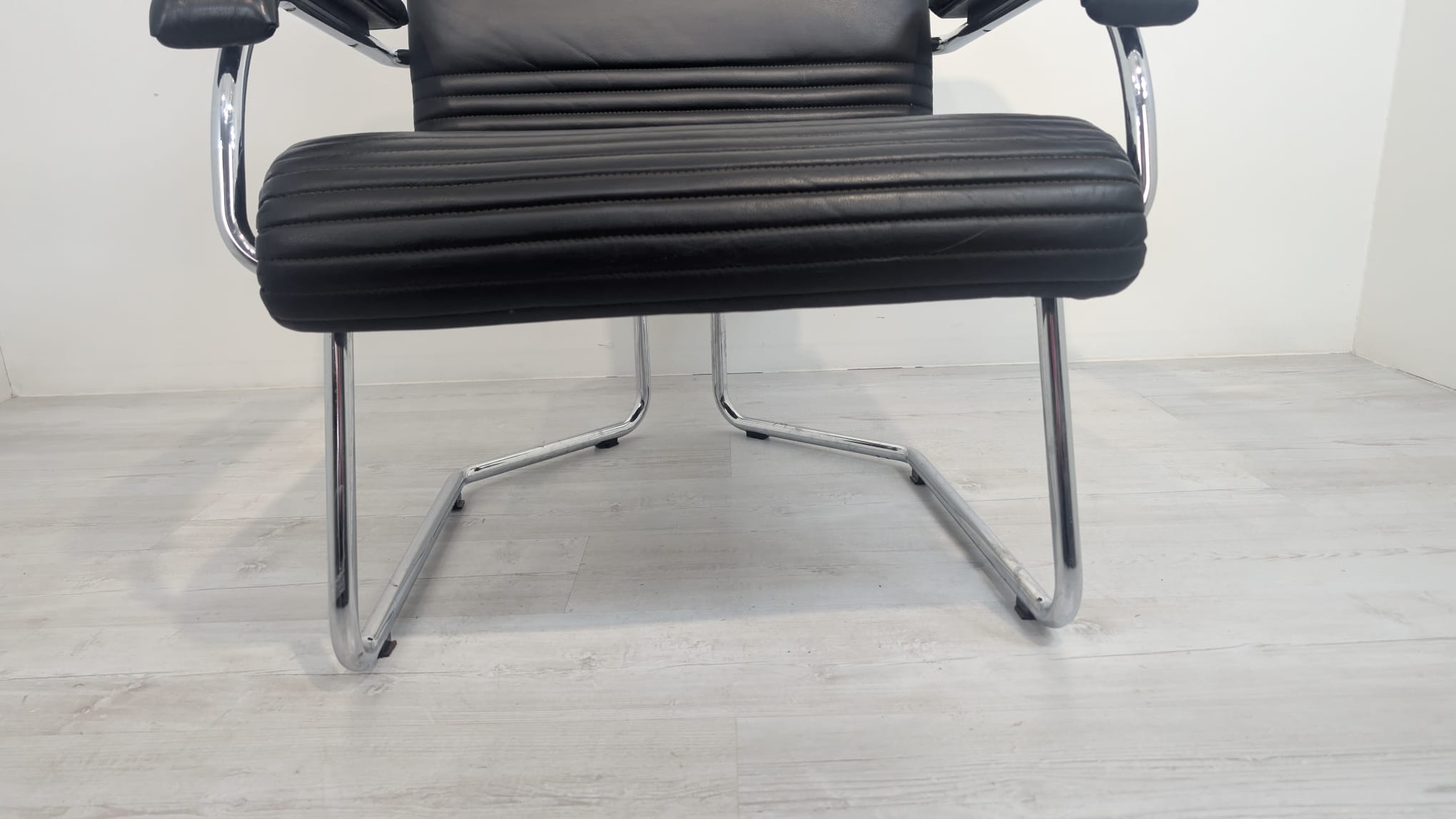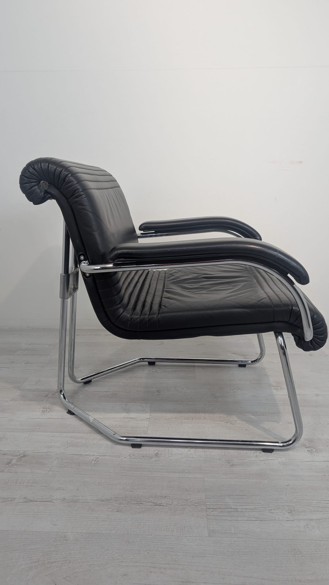 Fotel wykonany z czarnej skóry naturalnej na stelażu ze stali chromowanej.