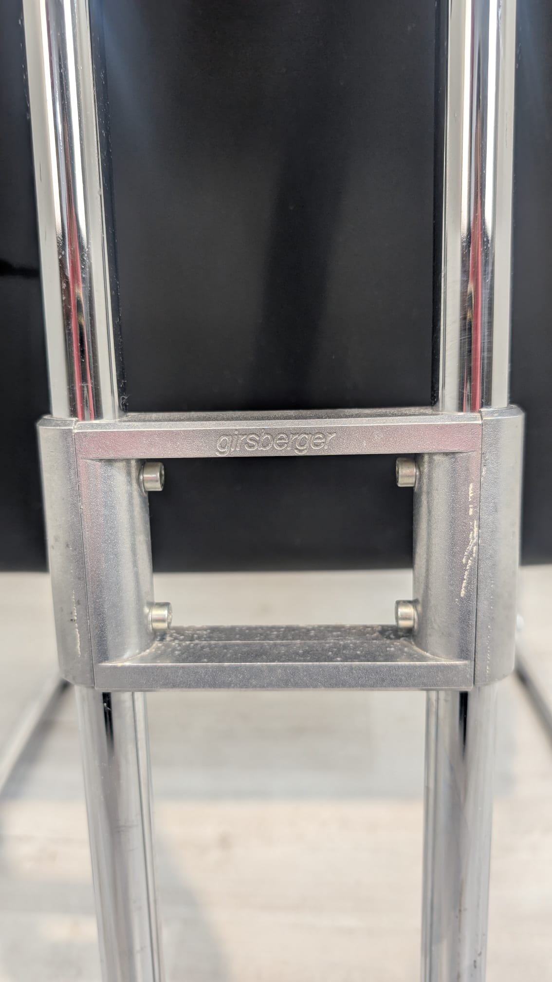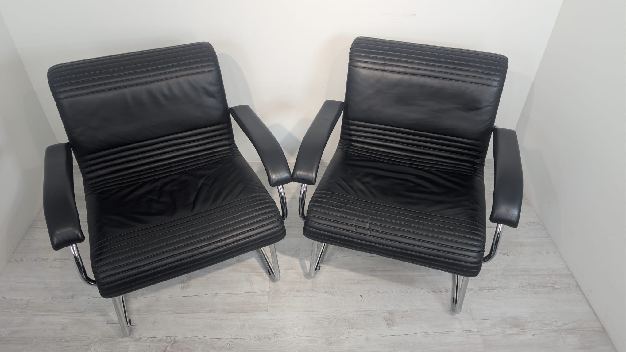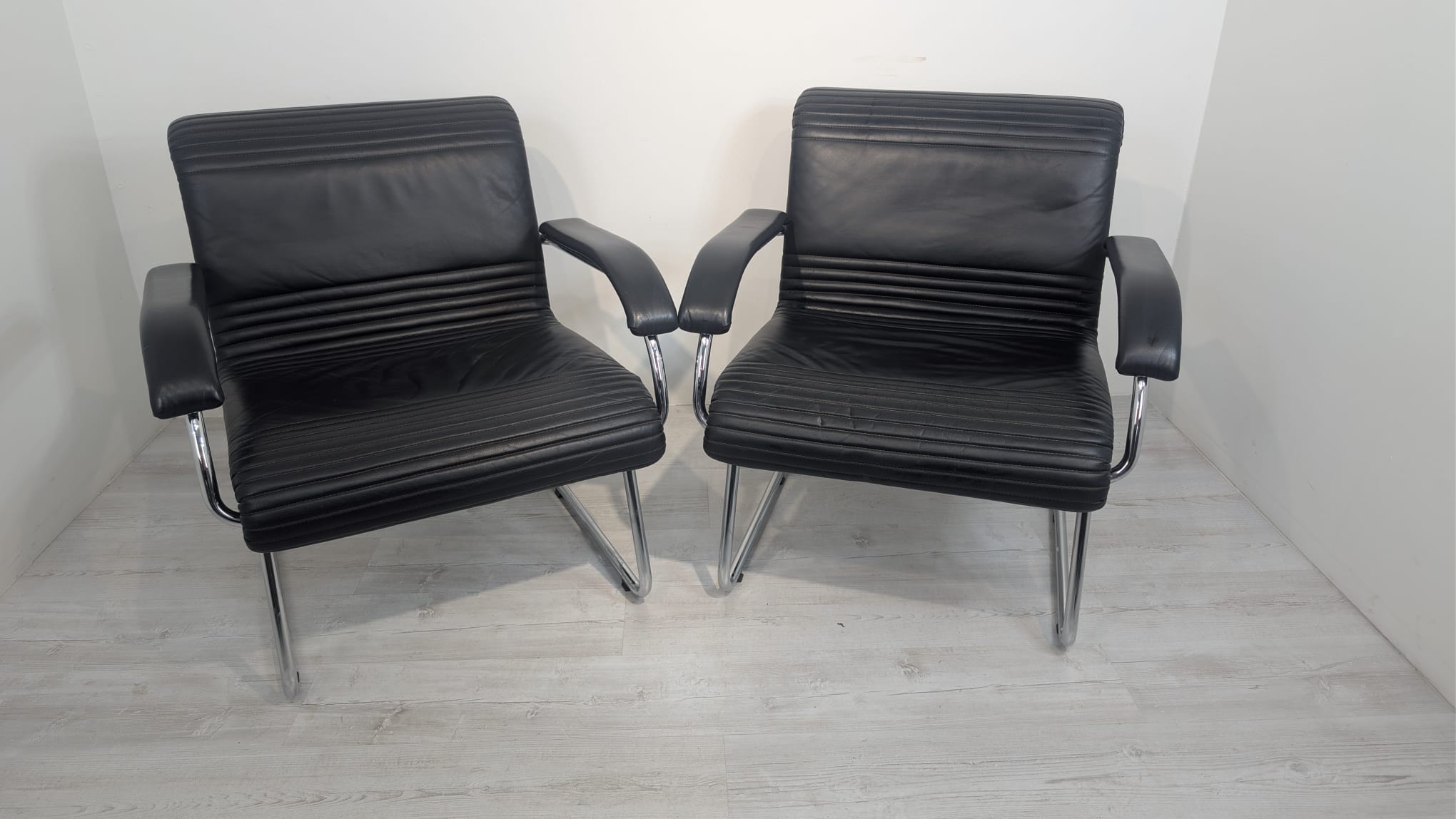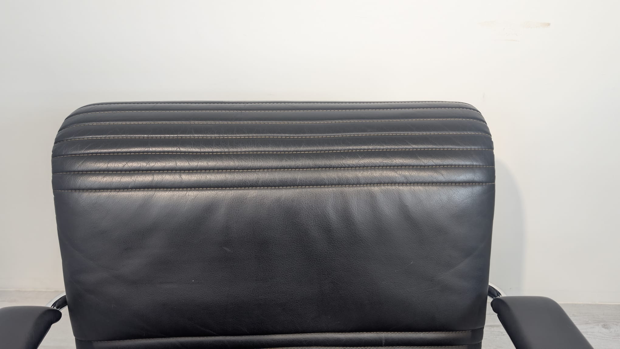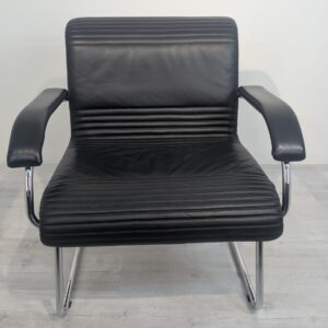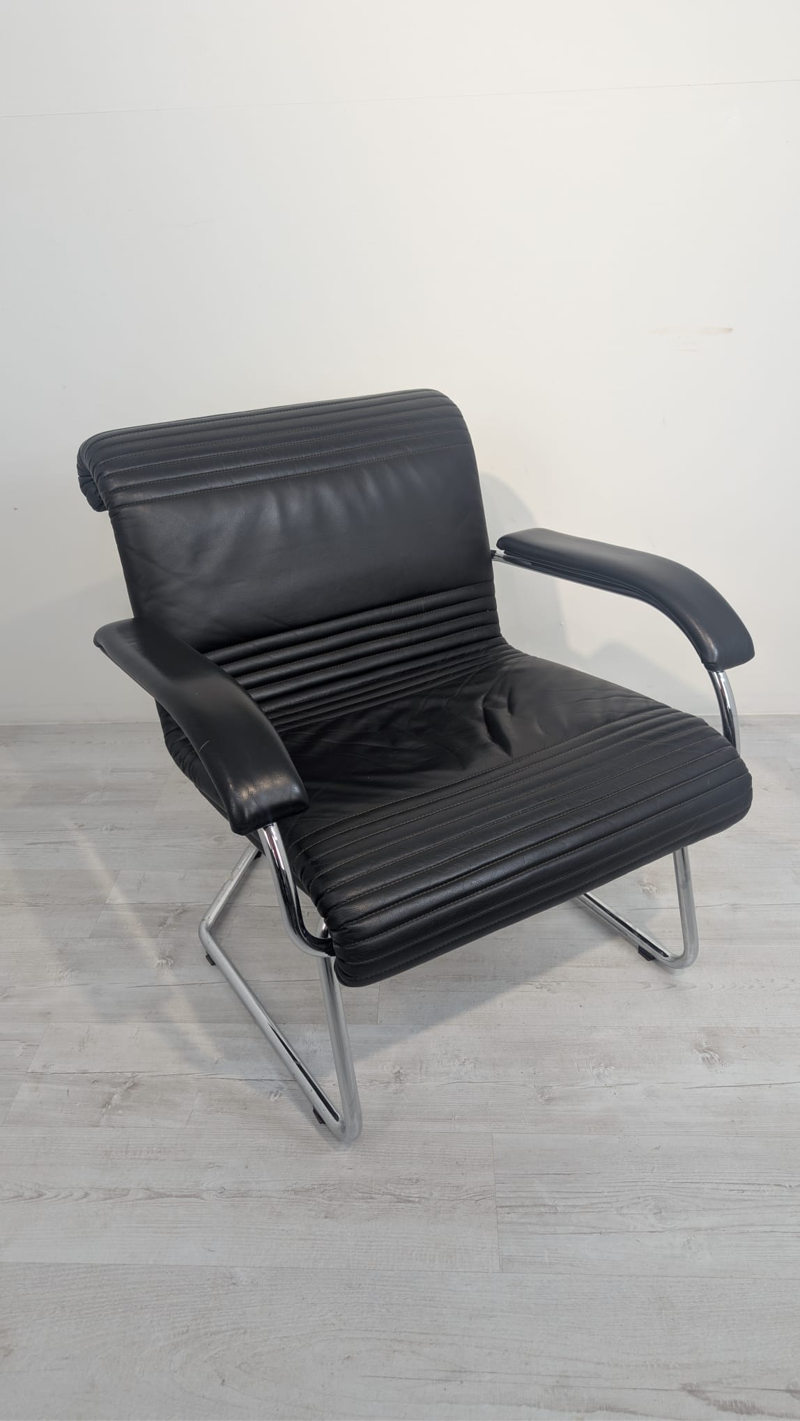 Fotel wykonany z czarnej skóry naturalnej na stelażu ze stali chromowanej.