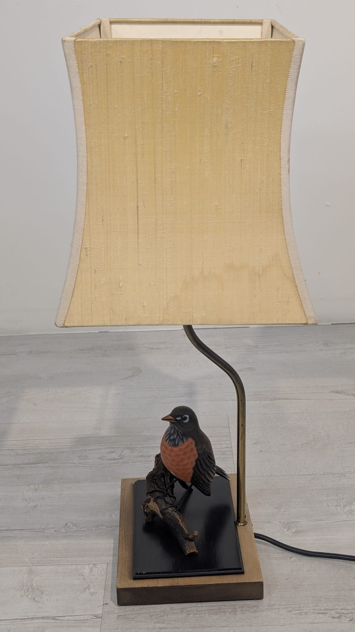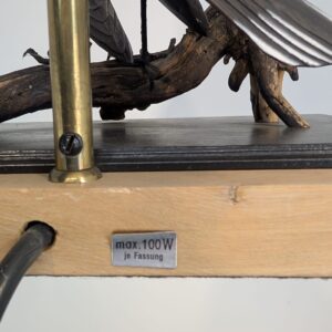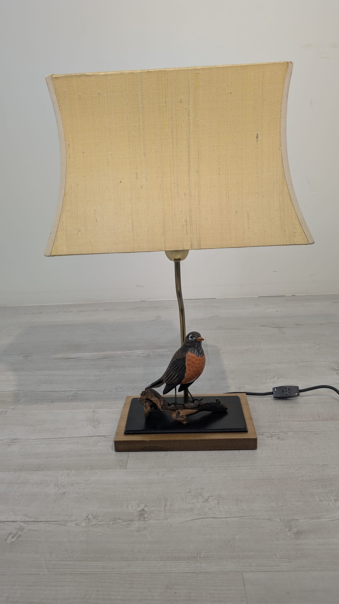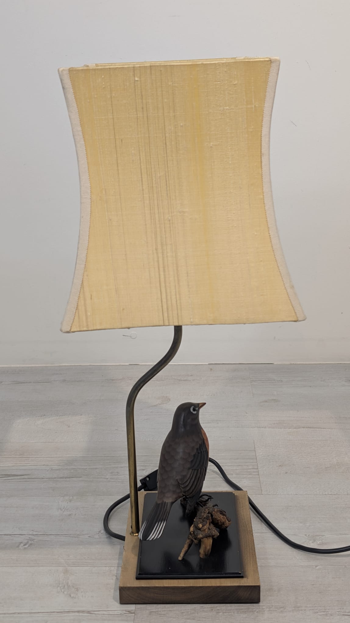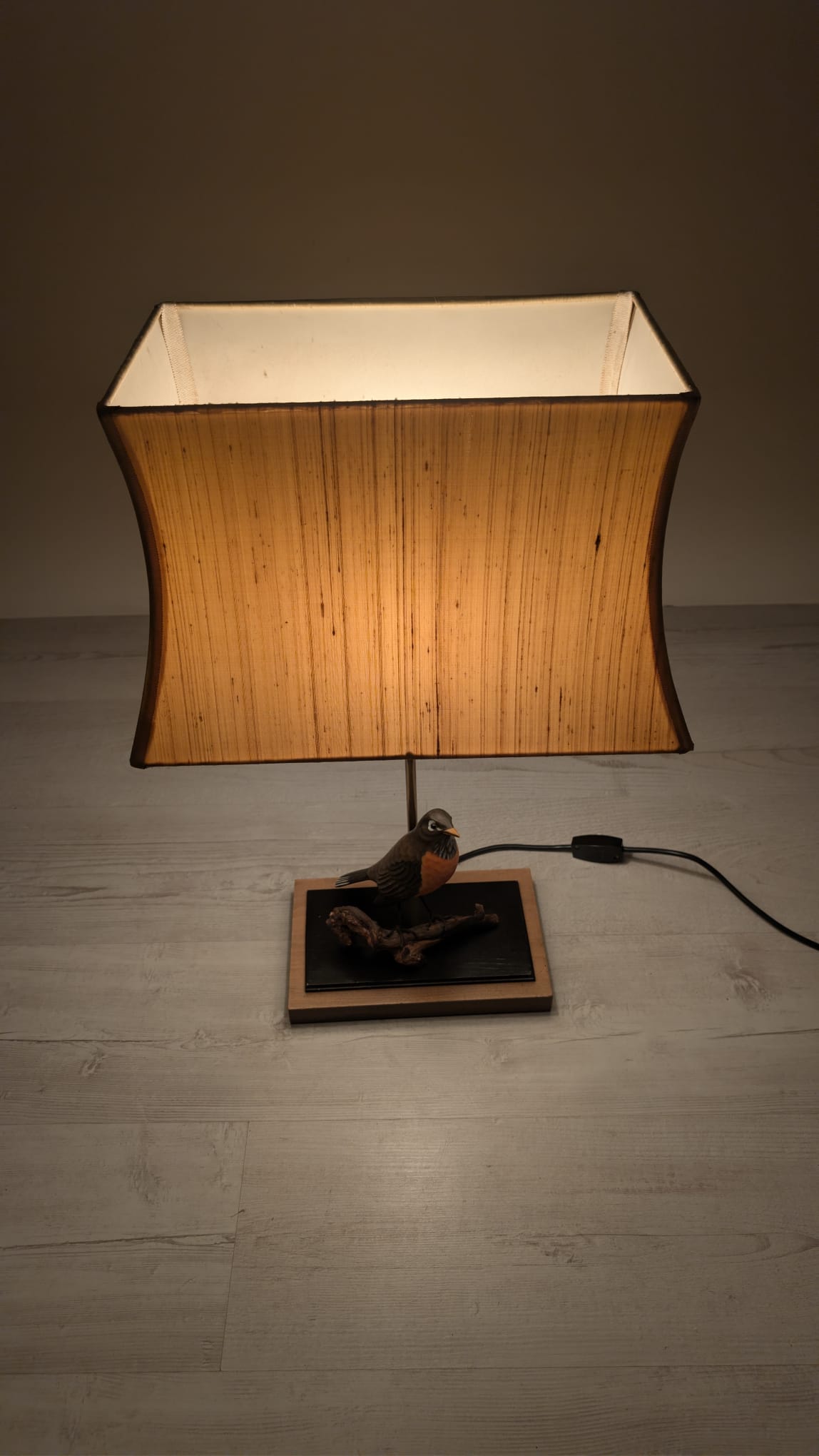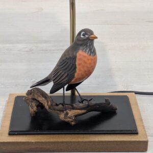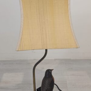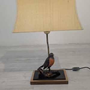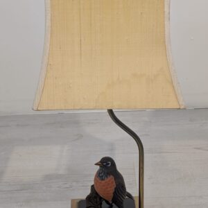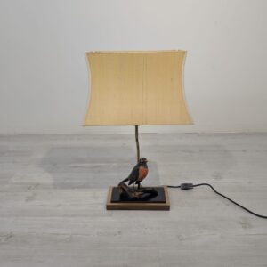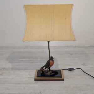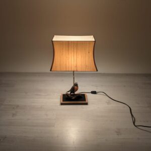 Unikalna lampa stołowa z lat 60. XX wieku, wykonana z drewna i ozdobiona figurką ptaka. Klasyczny design z ciepłym, przytulnym abażurem. Idealna jako dodatek do wnętrza w stylu vintage lub retro.