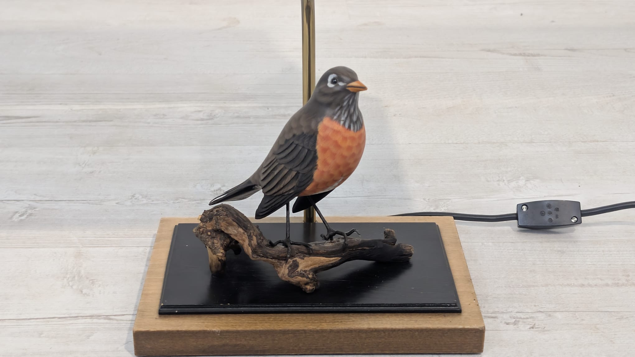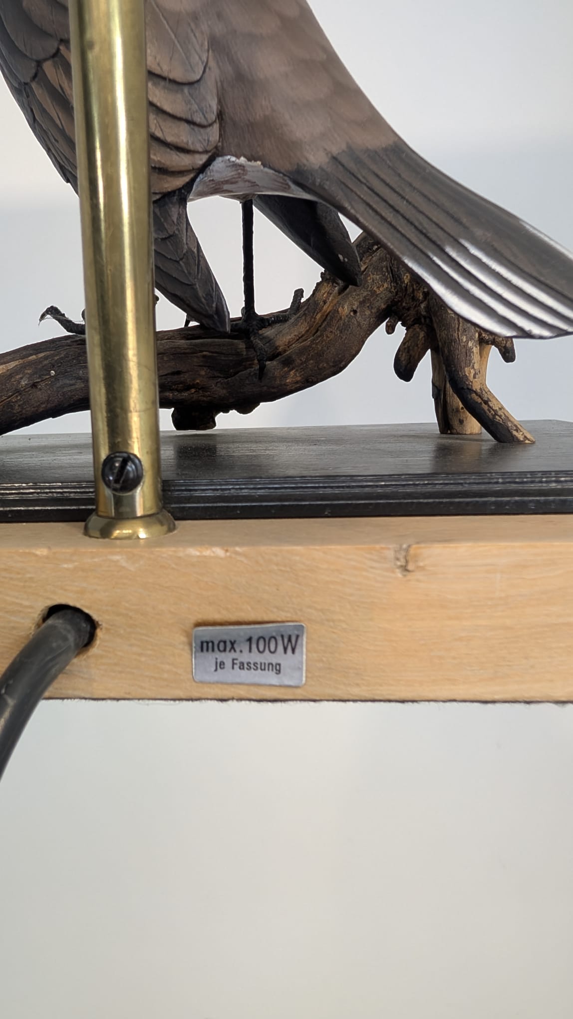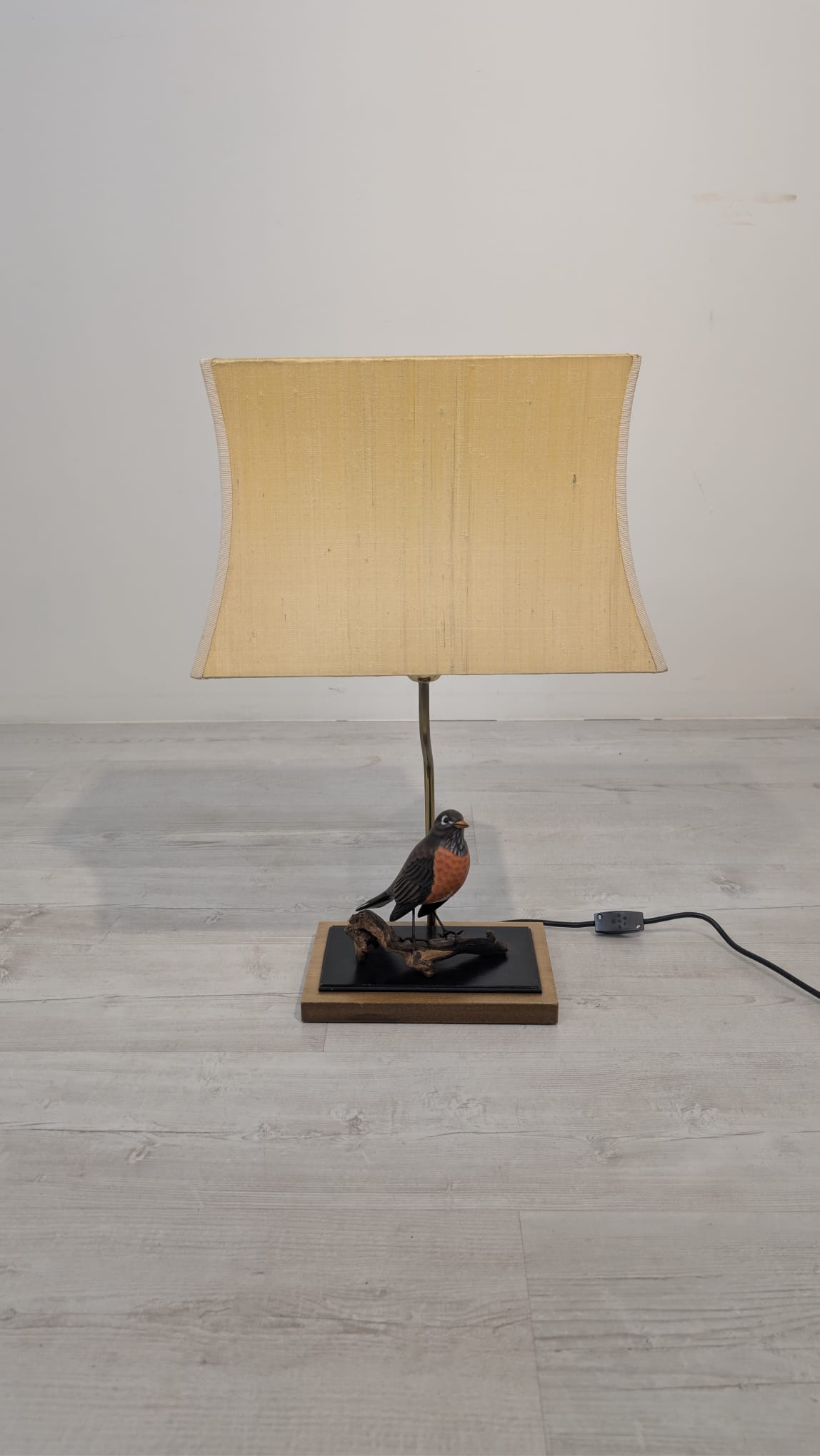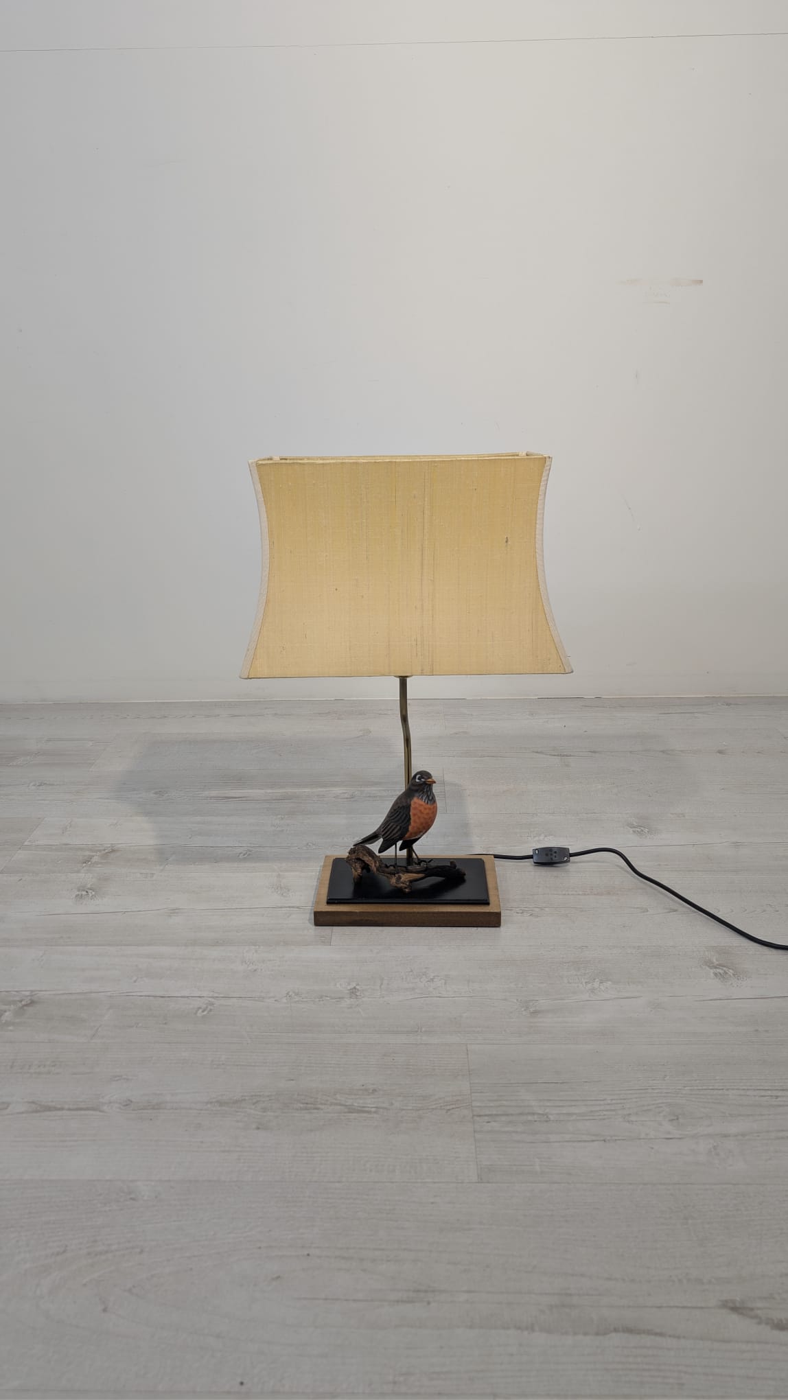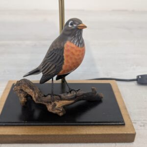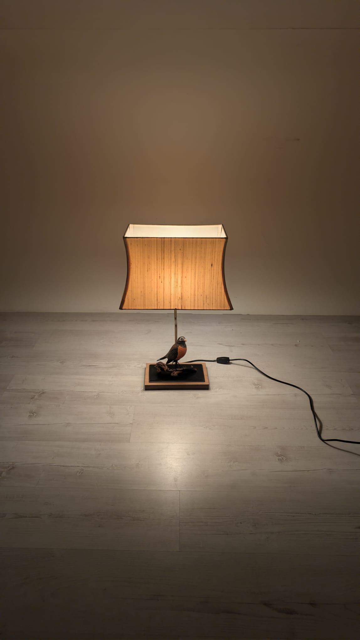 Unikalna lampa stołowa z lat 60. XX wieku, wykonana z drewna i ozdobiona figurką ptaka. Klasyczny design z ciepłym, przytulnym abażurem. Idealna jako dodatek do wnętrza w stylu vintage lub retro.