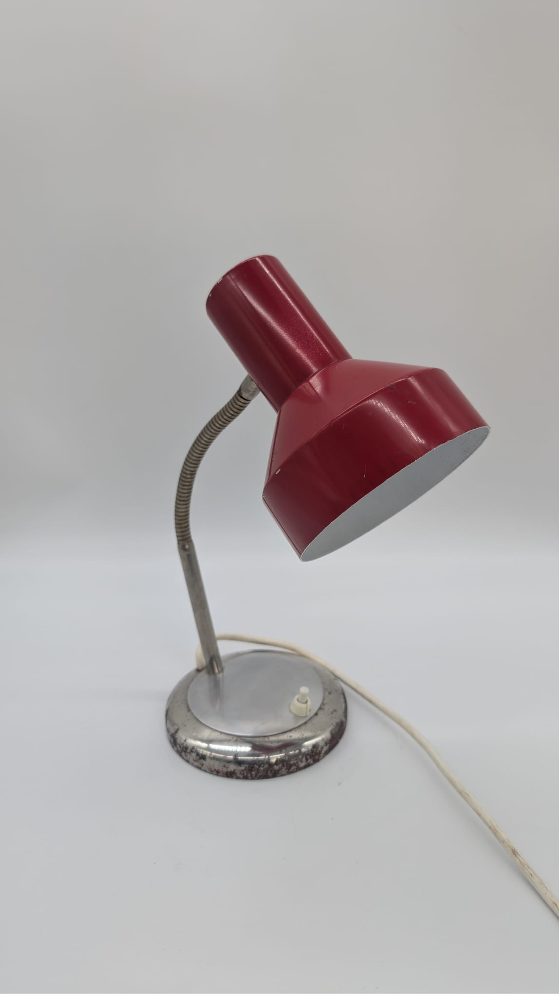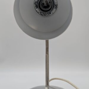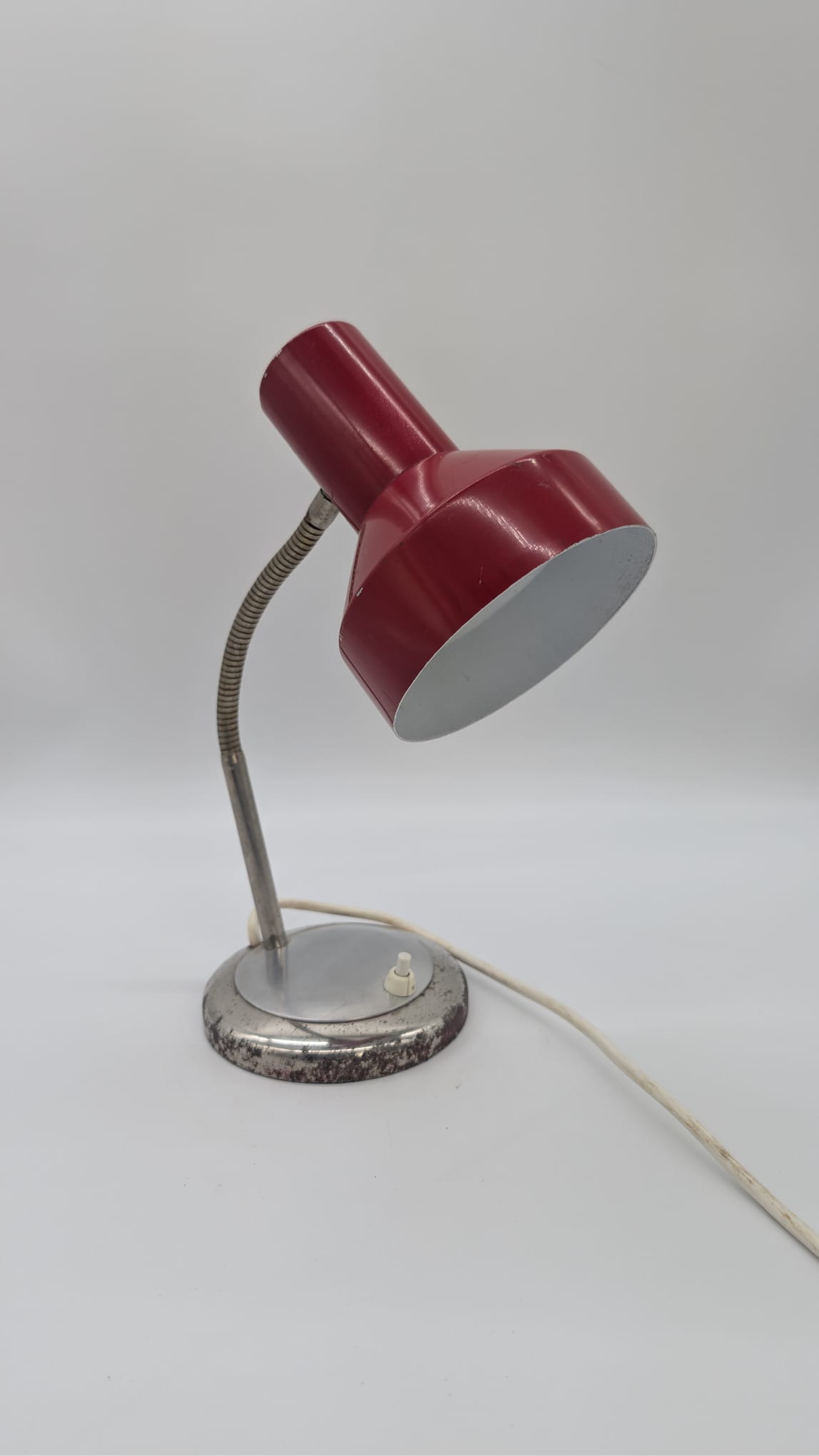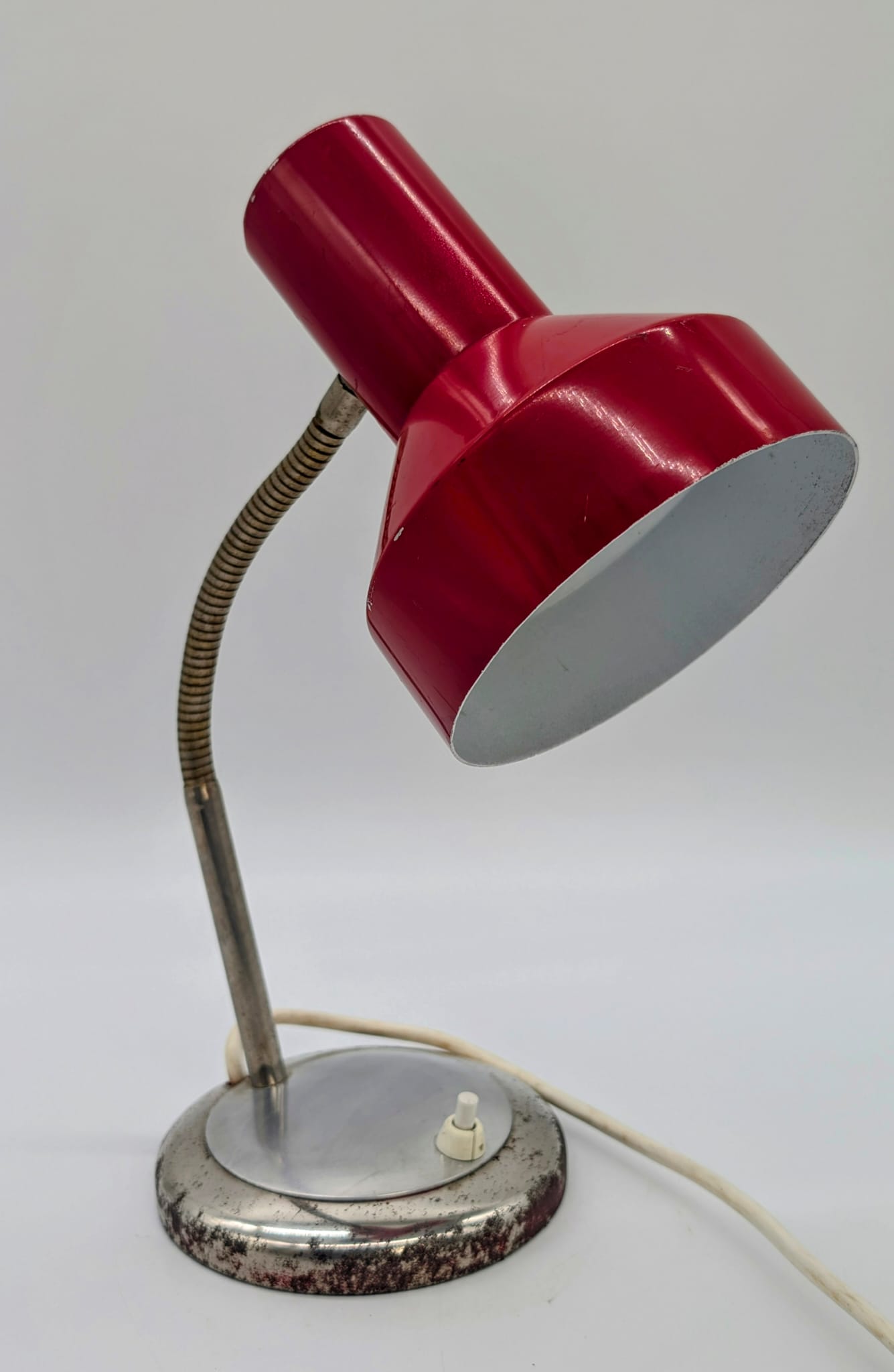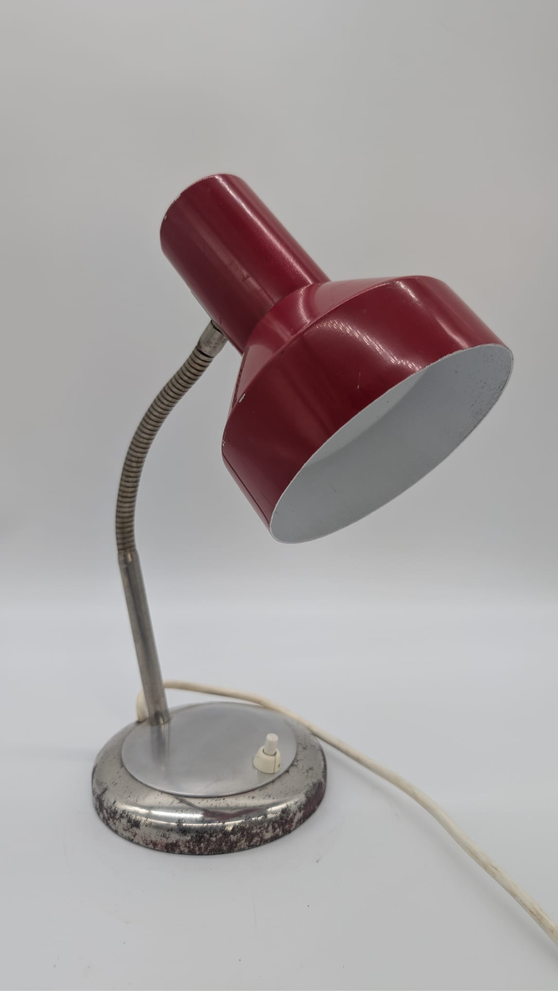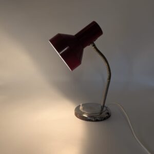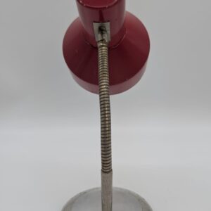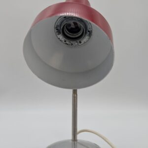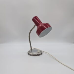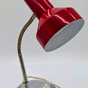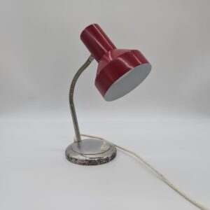 Stylowa lampka biurkowa w kolorze czerwonym, pochodząca z lat 70-tych. Posiada regulowany kąt nachylenia, co ułatwia oświetlenie pracy. Dzięki swojemu retro designowi będzie pasować do wielu wnętrz, nadając im niepowtarzalny charakter.