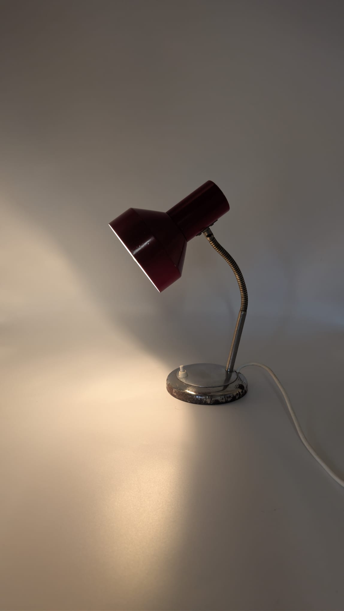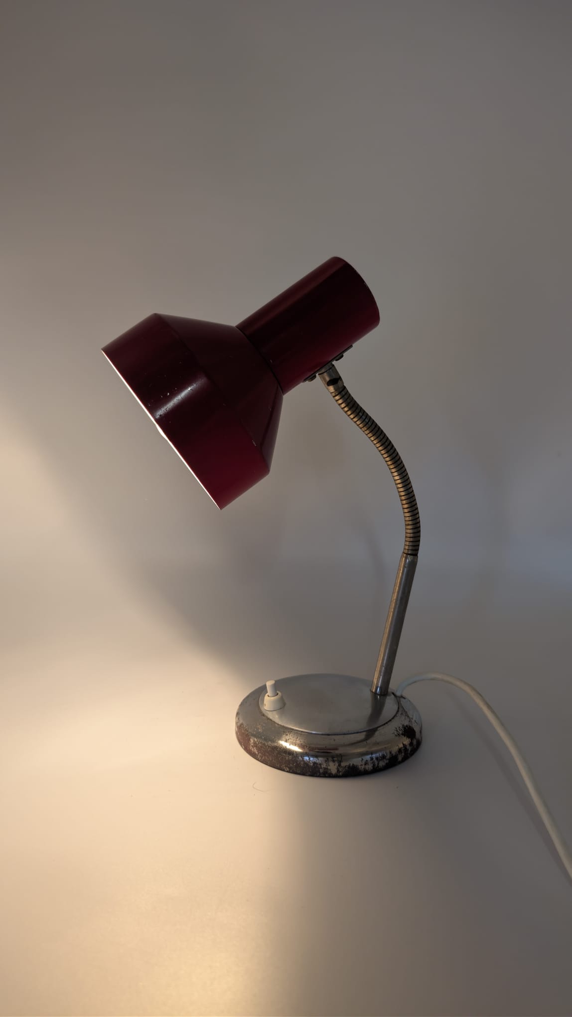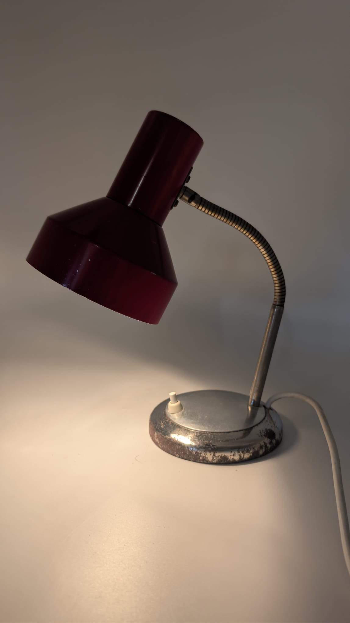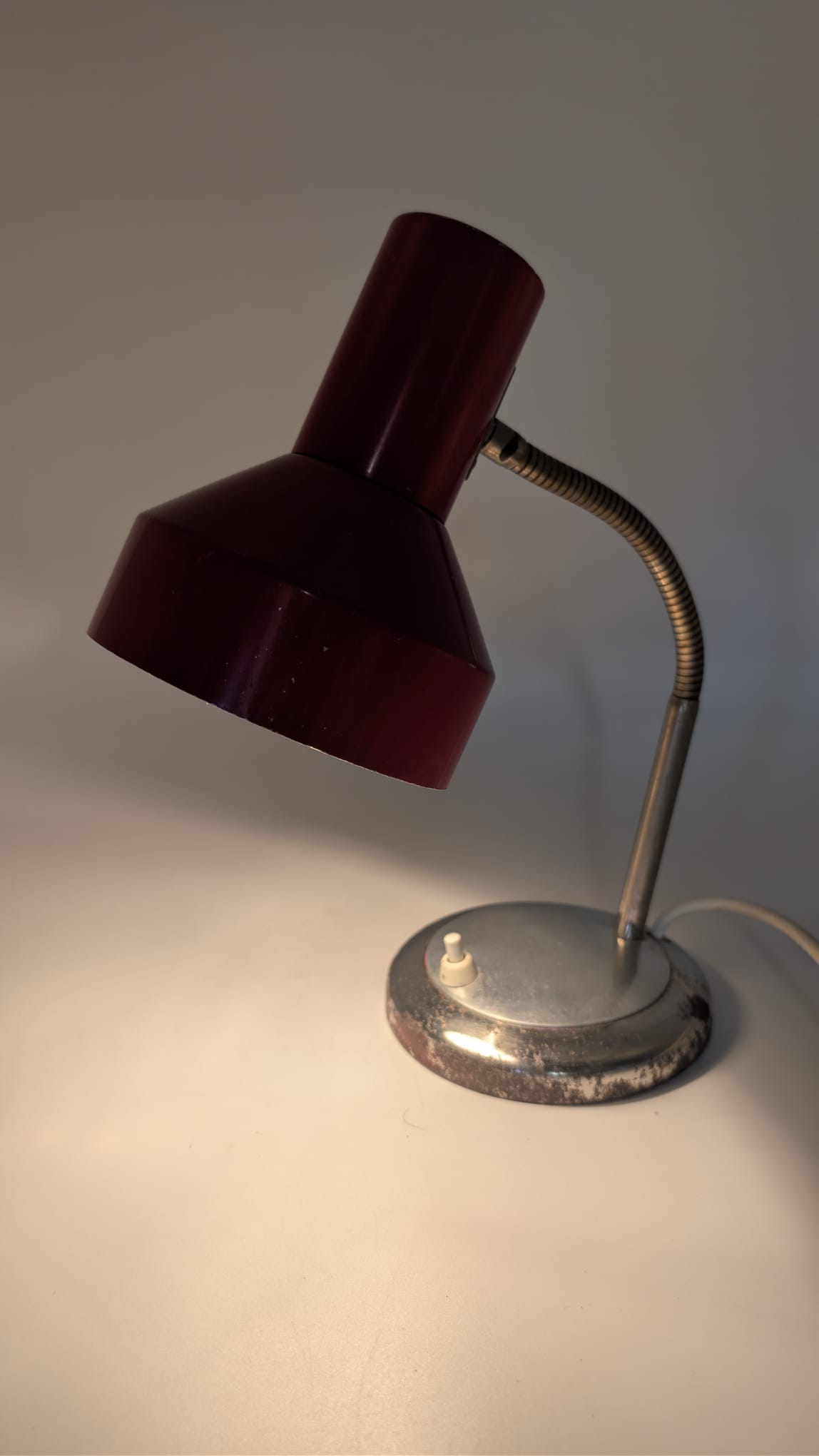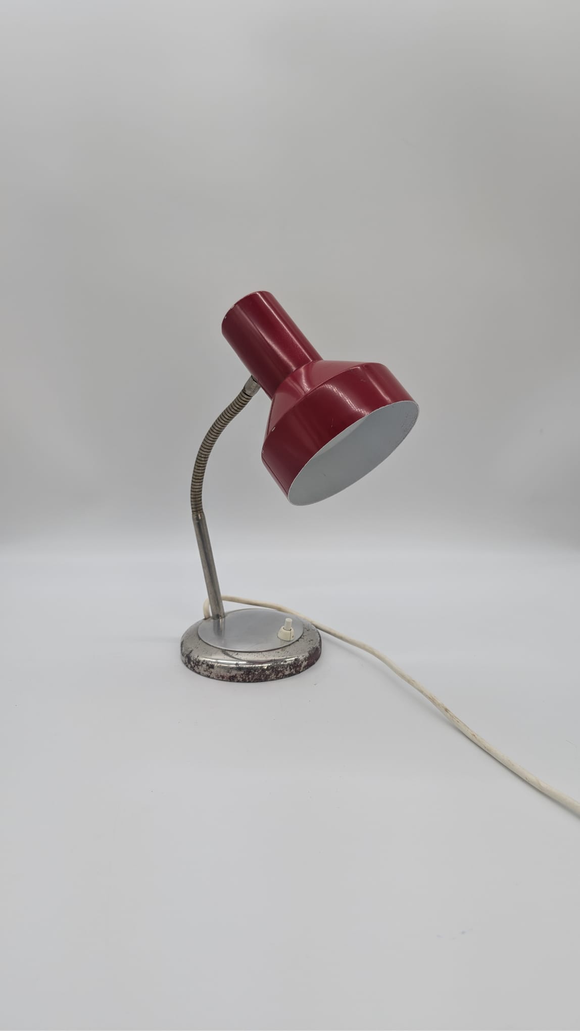 Stylowa lampka biurkowa w kolorze czerwonym, pochodząca z lat 70-tych. Posiada regulowany kąt nachylenia, co ułatwia oświetlenie pracy. Dzięki swojemu retro designowi będzie pasować do wielu wnętrz, nadając im niepowtarzalny charakter.