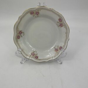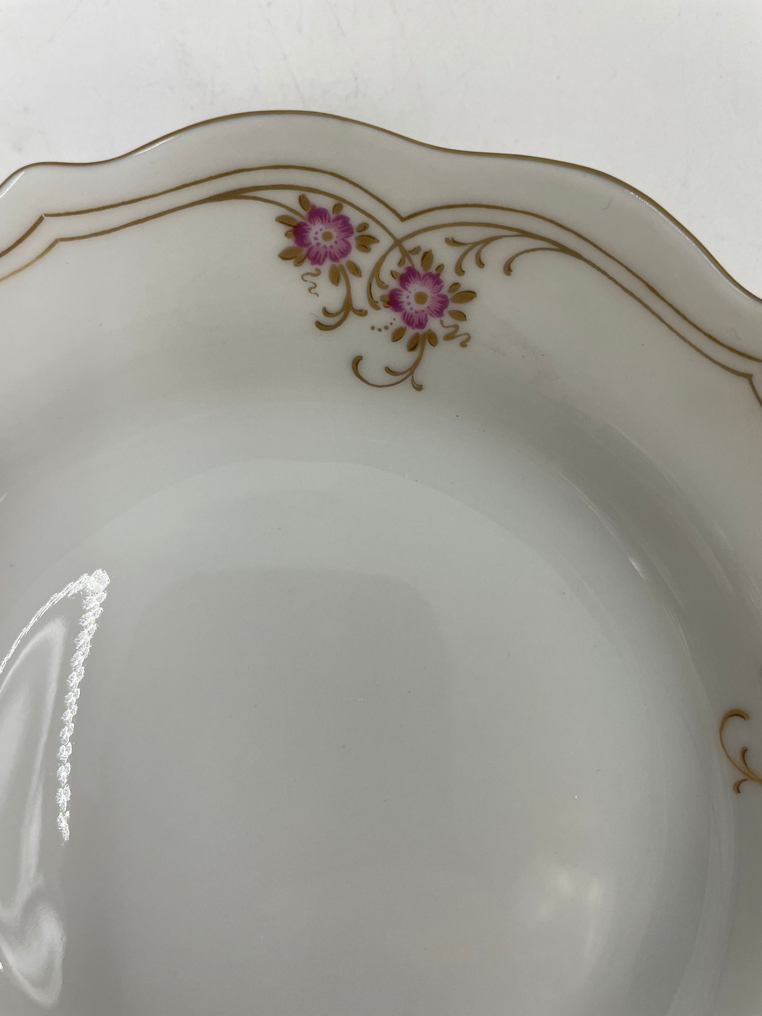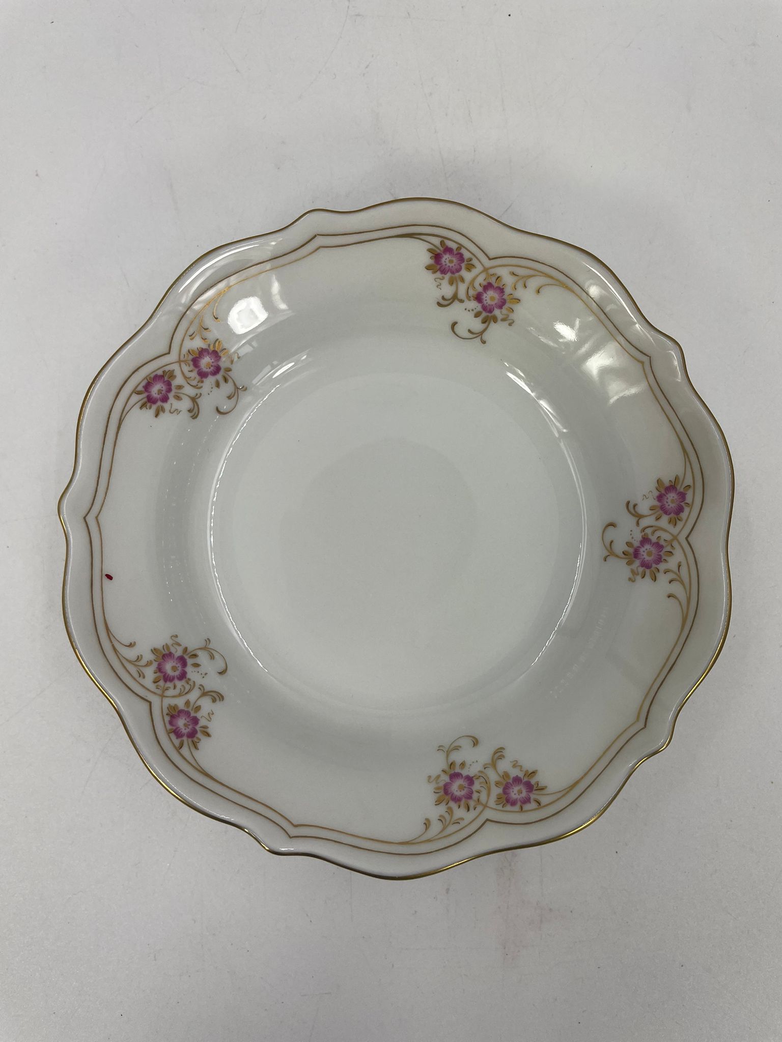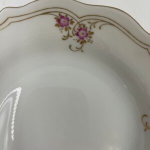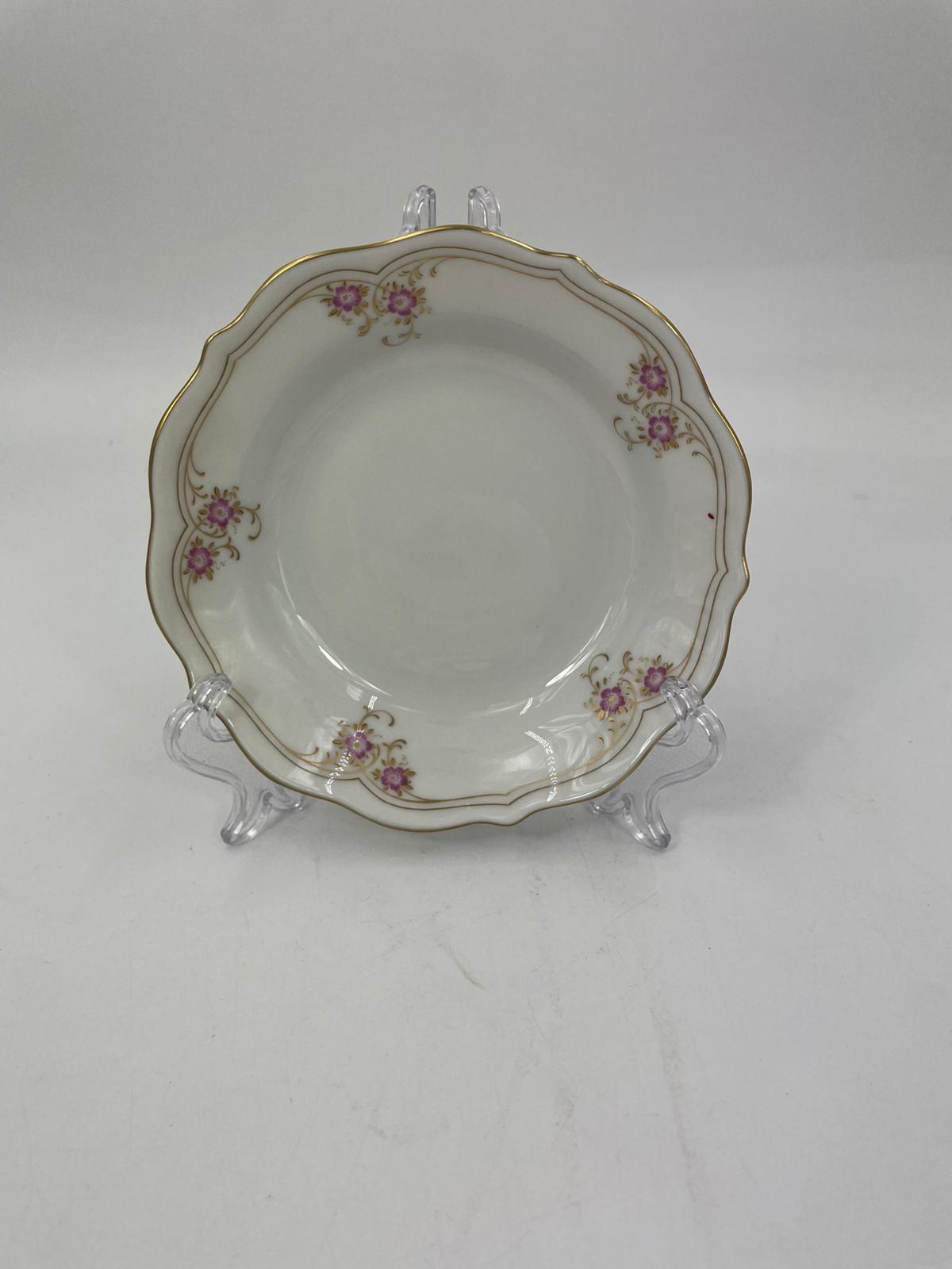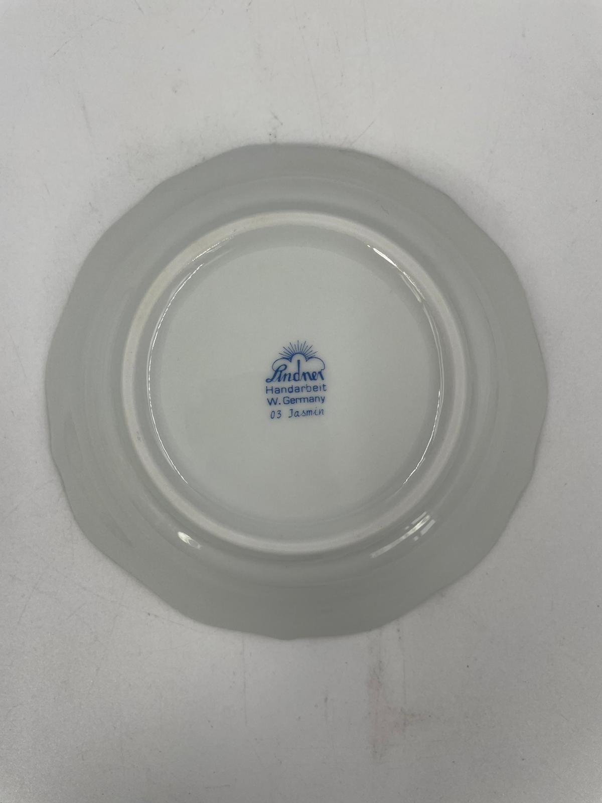 Lindner Handarbeit porcelain saucer, Marie Luise Jasmin, white with a pattern of small pink flowers, finished with gilding.
