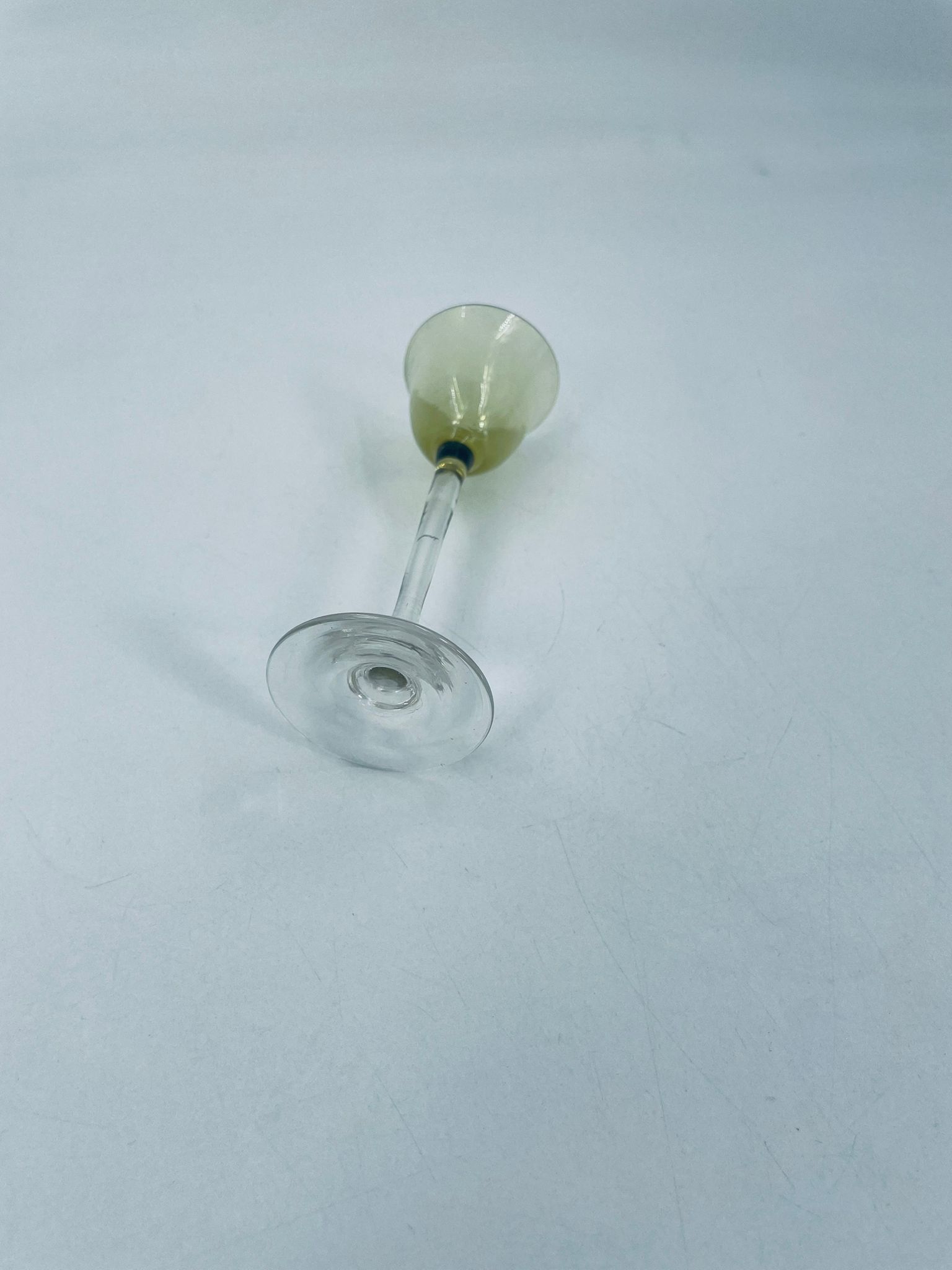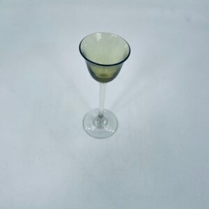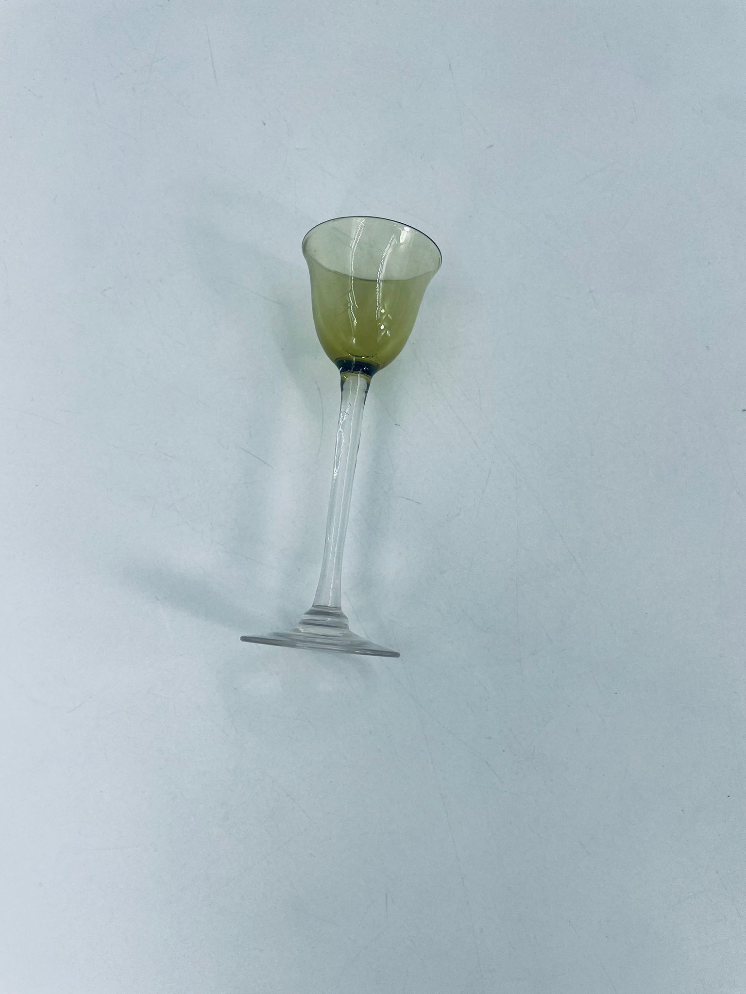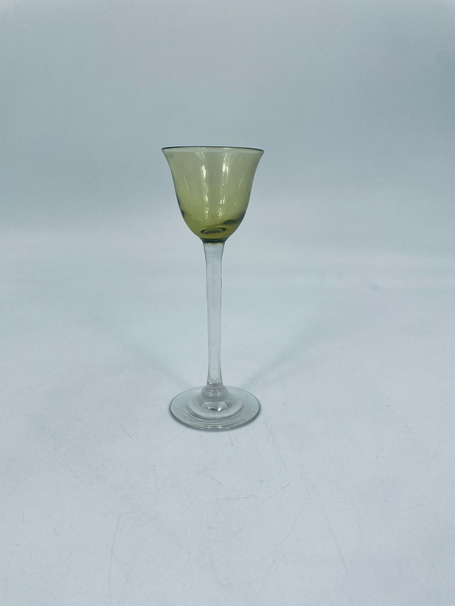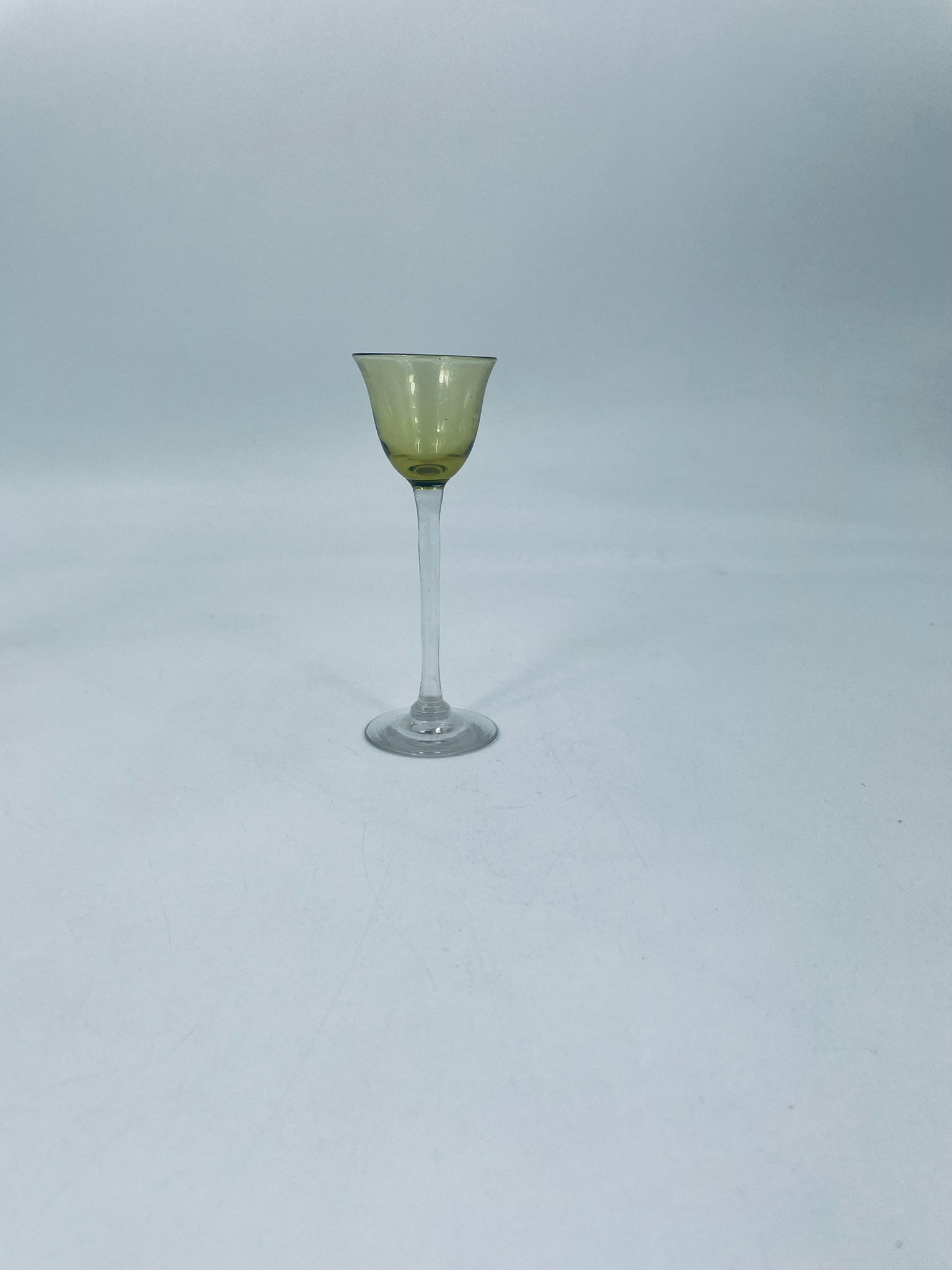 Liqueur glass made of glass. The foot is transparent, the bowl coloured in green and in the shape of a tulip.
