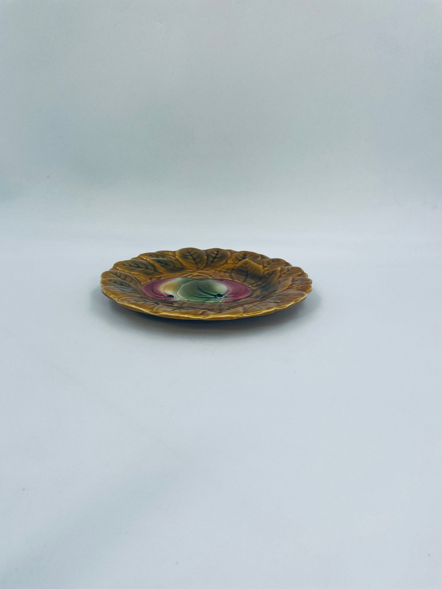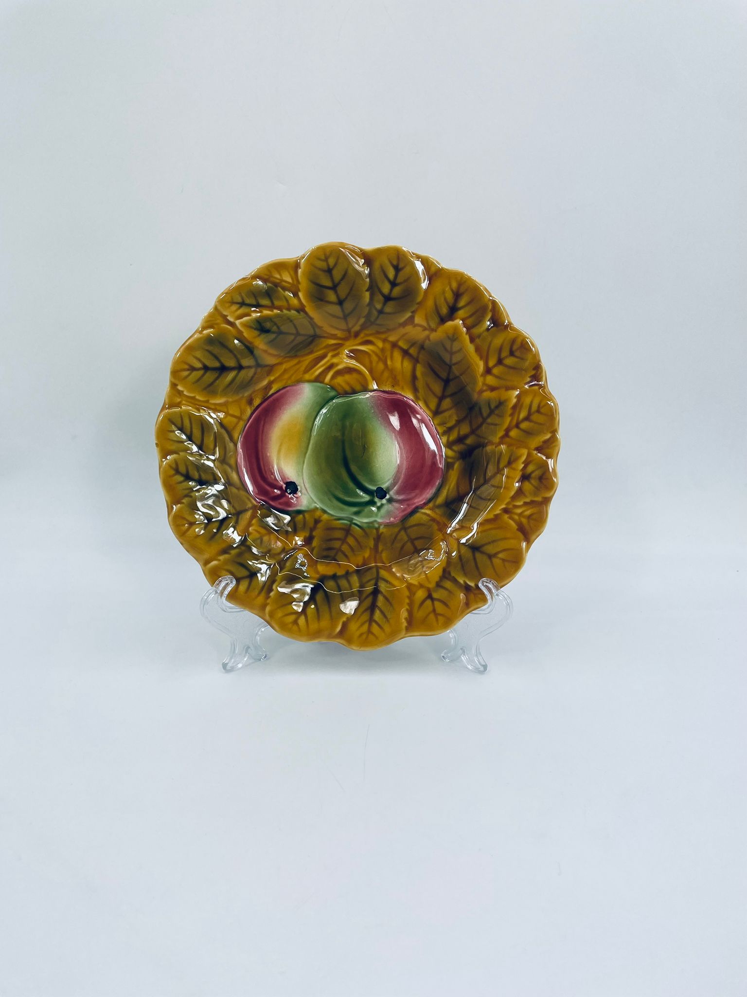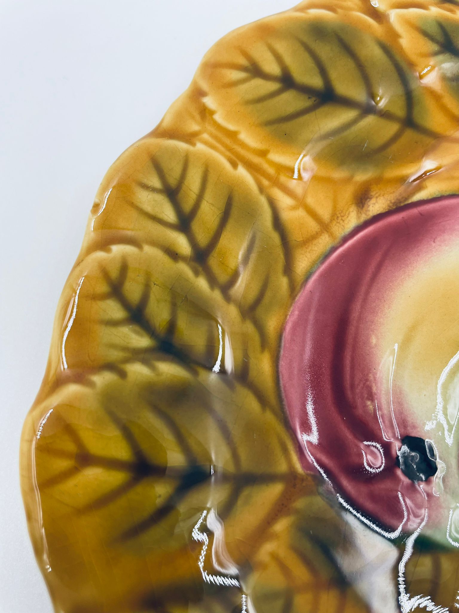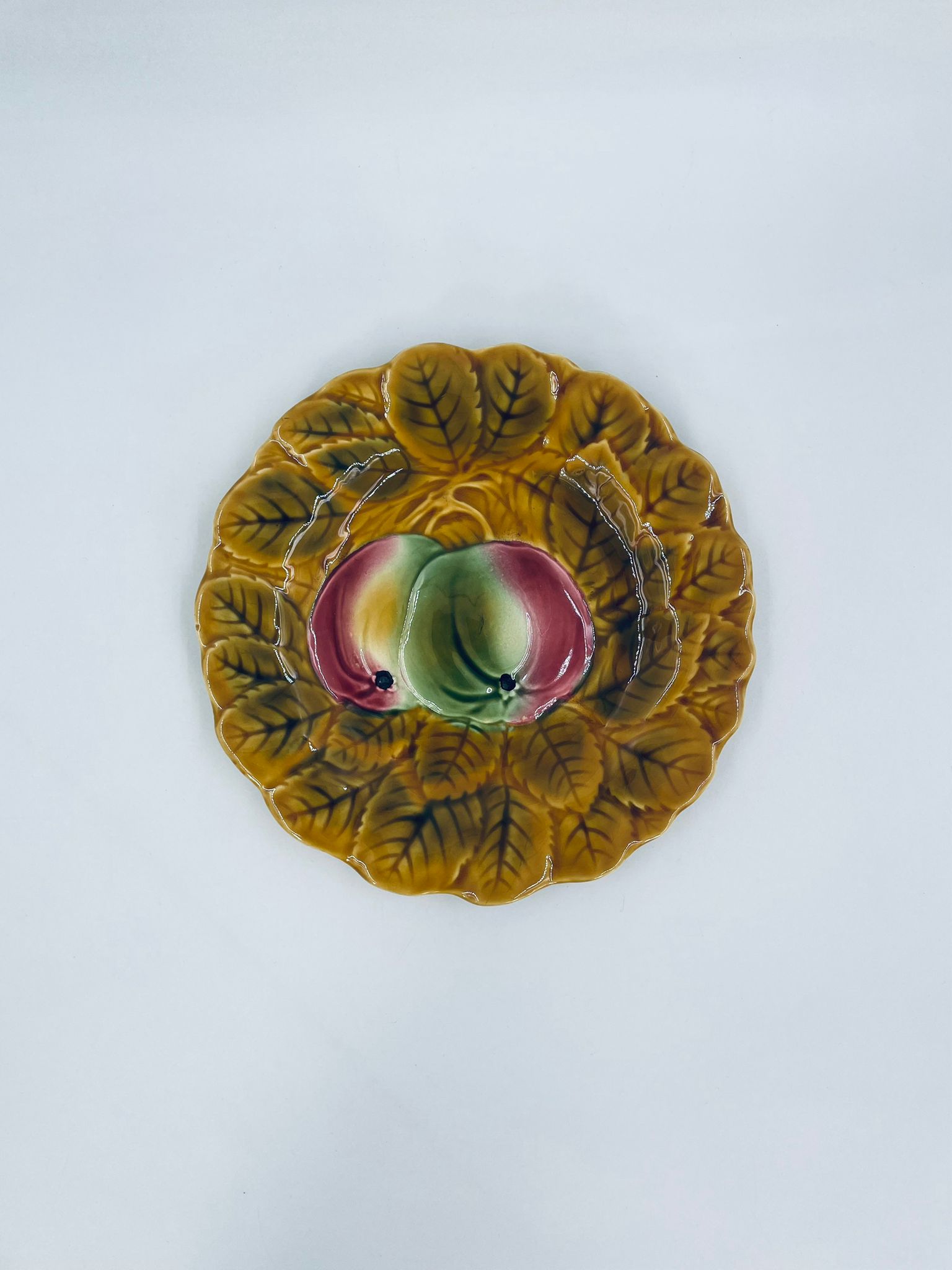 Decorative plate by the French Sarreguemines factory, made of mustard-coloured faience. The plate decorated with a relief pattern of apples surrounded by leaves, finished with a wavy rim. It has a crack in the glaze, an abrasion and a small damage.