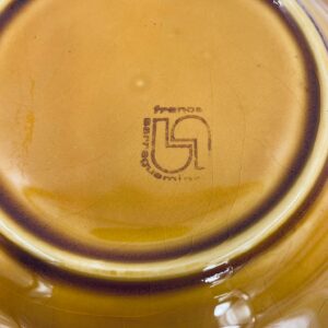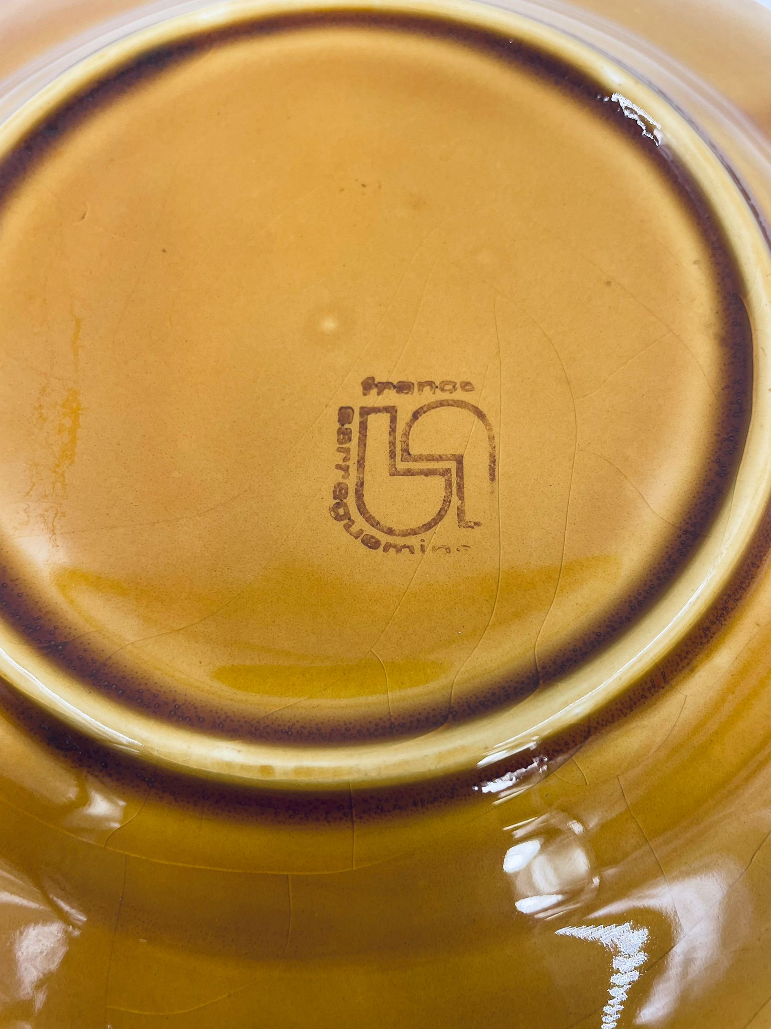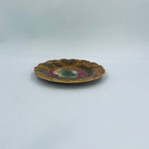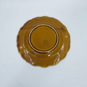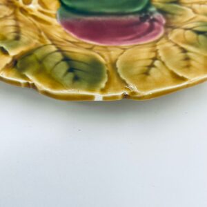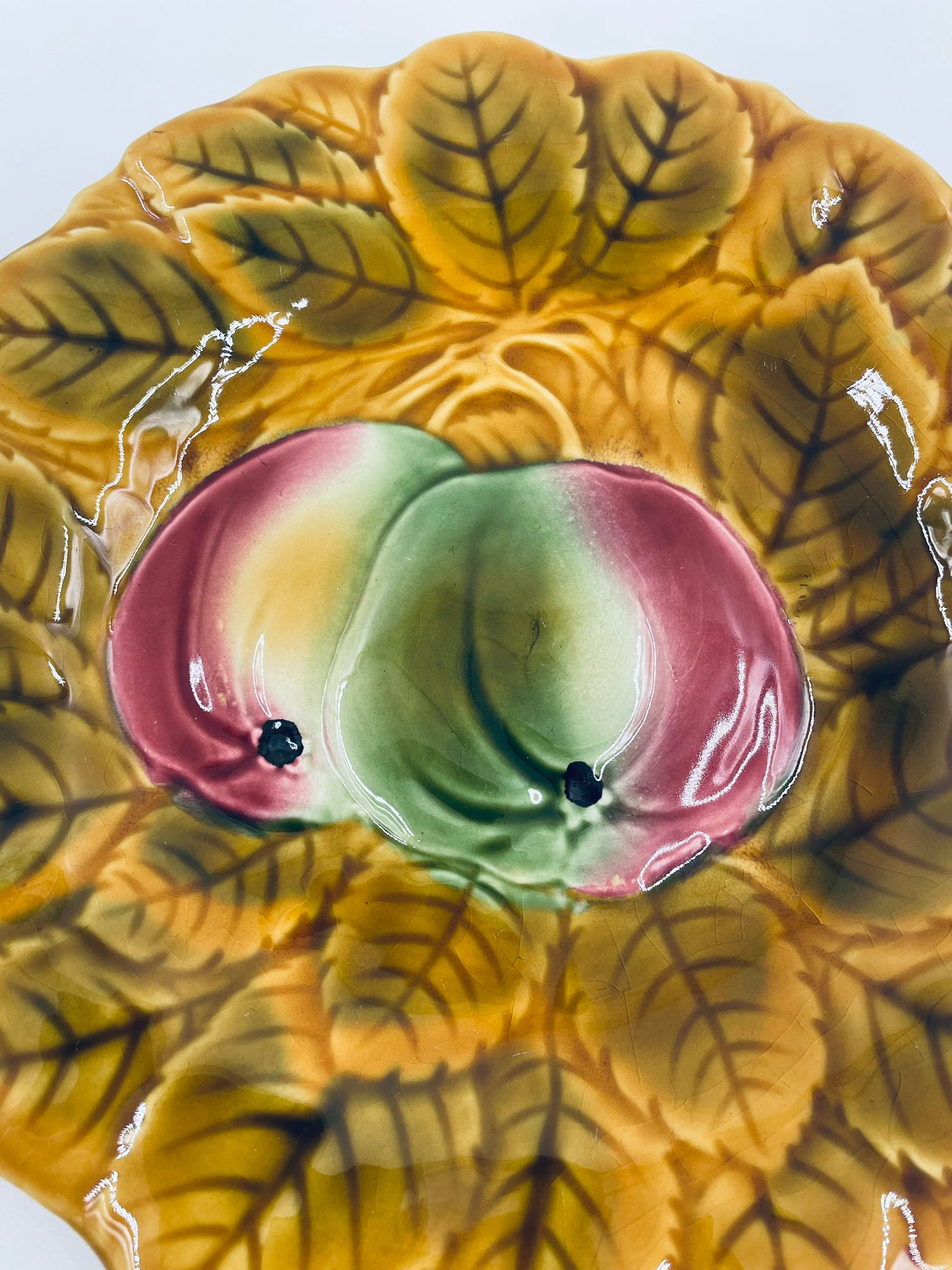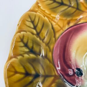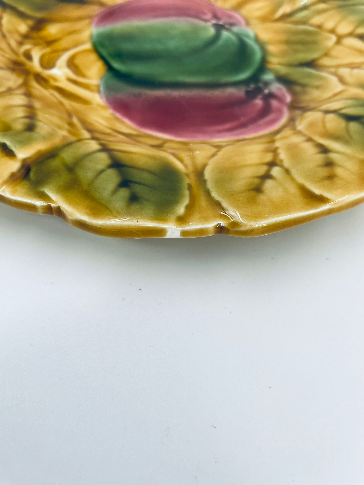Decorative plate by the French Sarreguemines factory, made of mustard-coloured faience. The plate decorated with a relief pattern of apples surrounded by leaves, finished with a wavy rim. It has a crack in the glaze, an abrasion and a small damage.