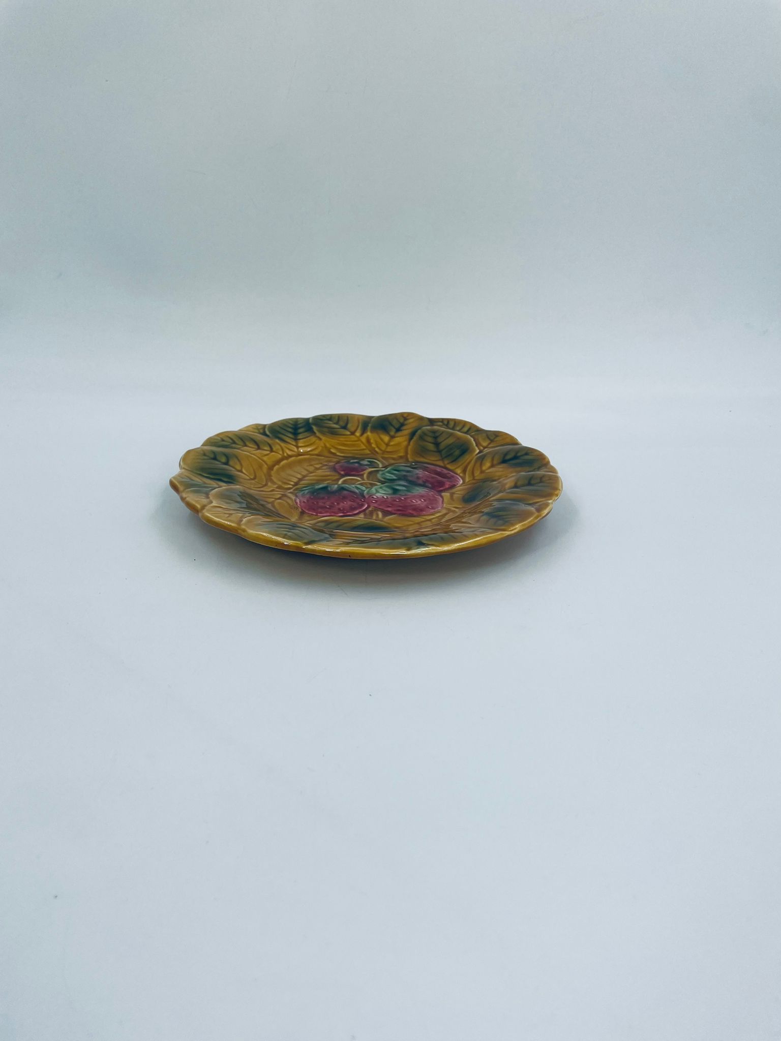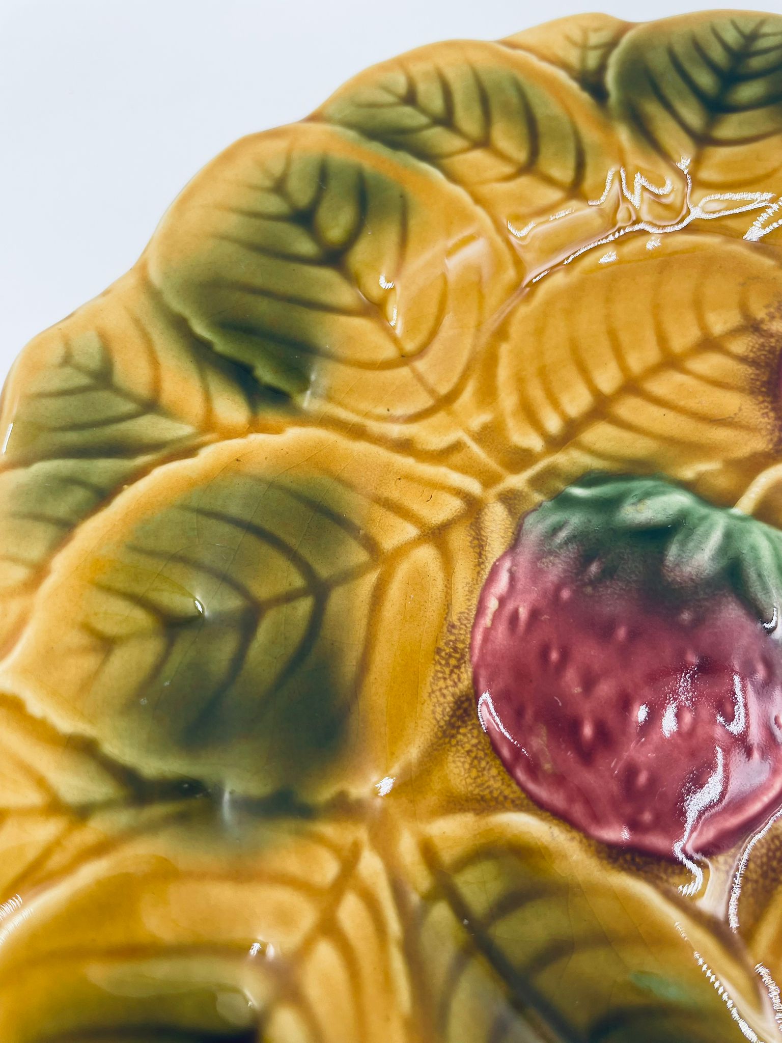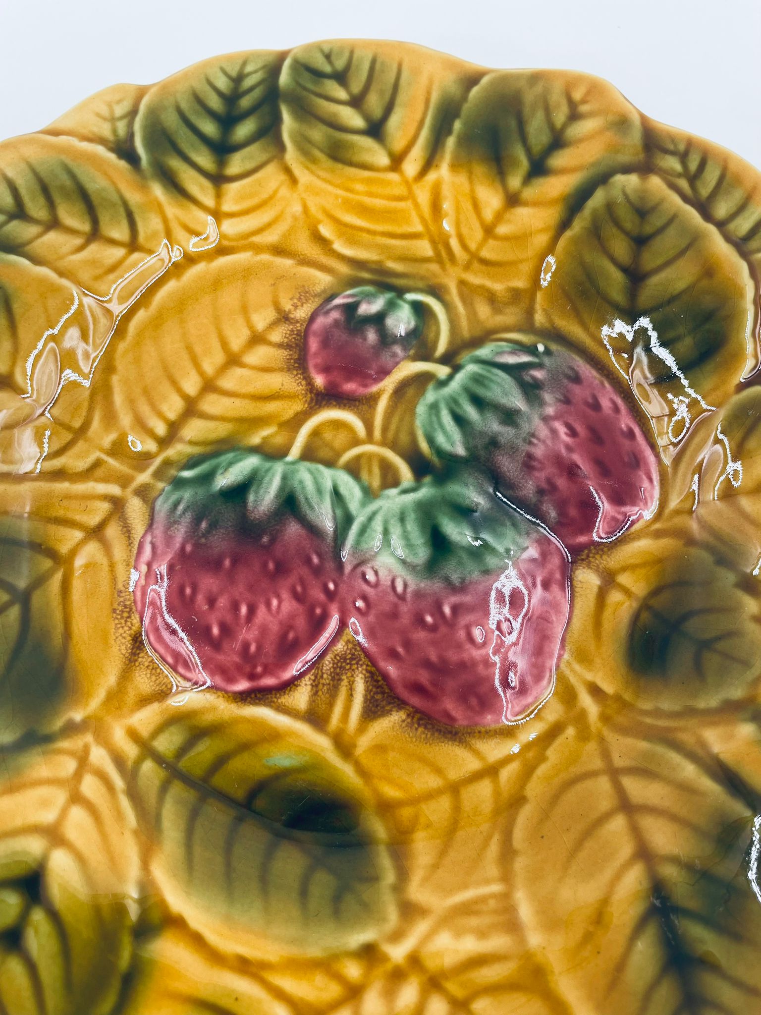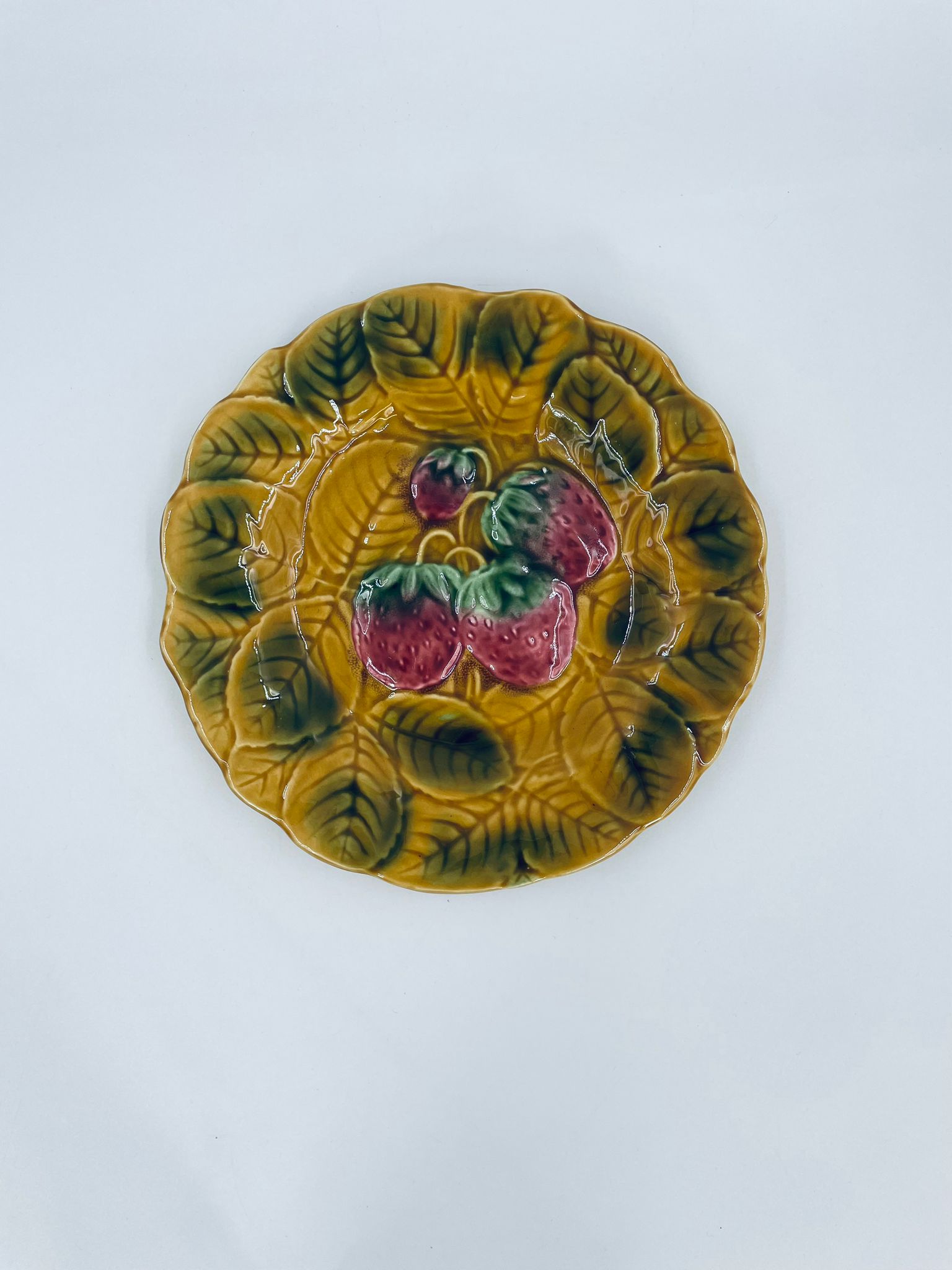 Decorative plate by the French Sarreguemines factory, made of mustard-coloured faience. The plate decorated with a relief pattern of strawberries surrounded by leaves, finished with a wavy rim. It has a crack in the glaze.
