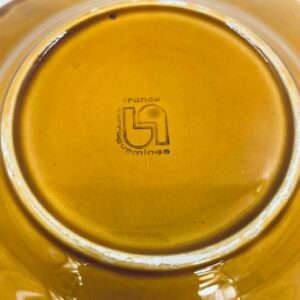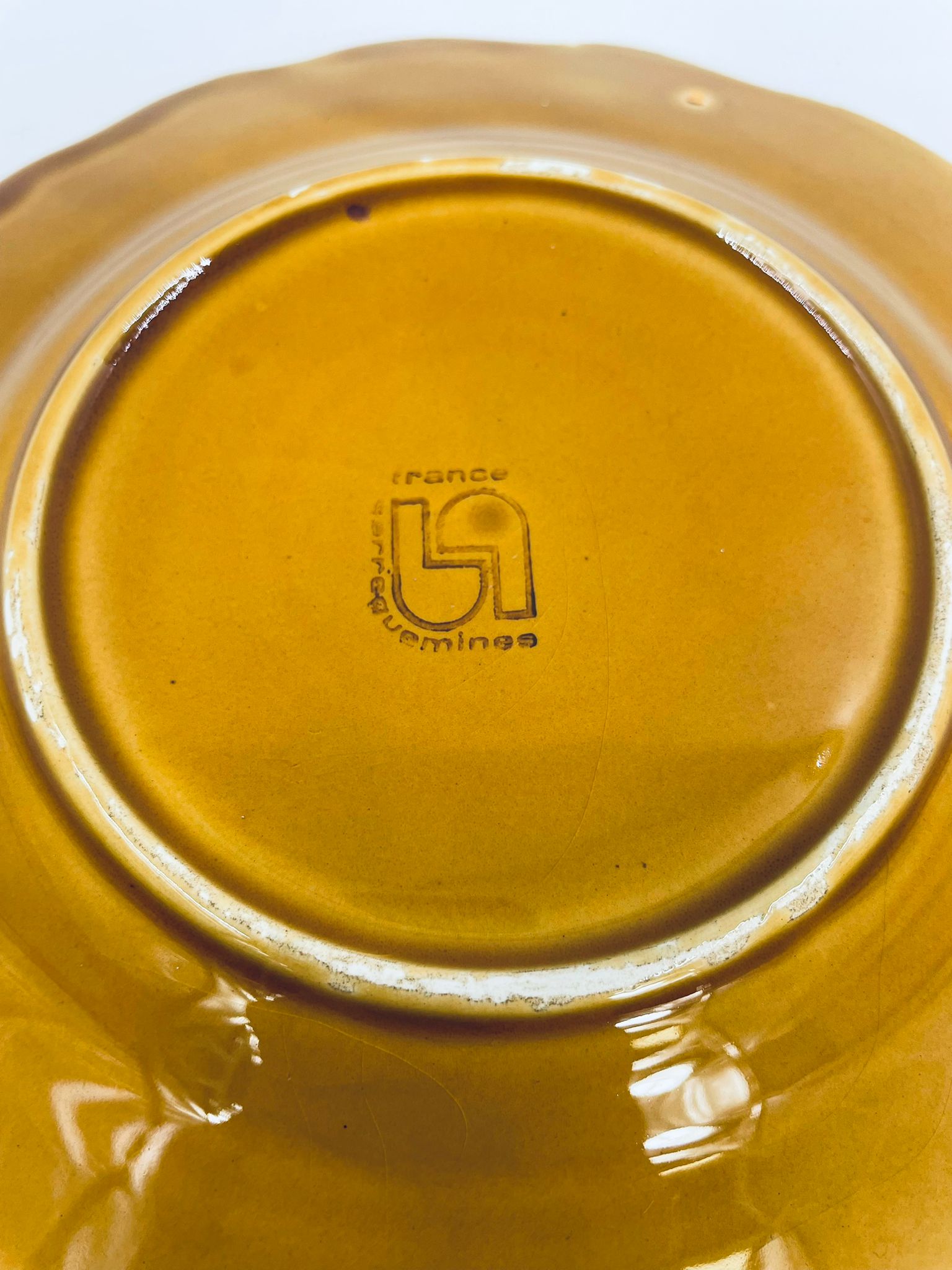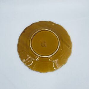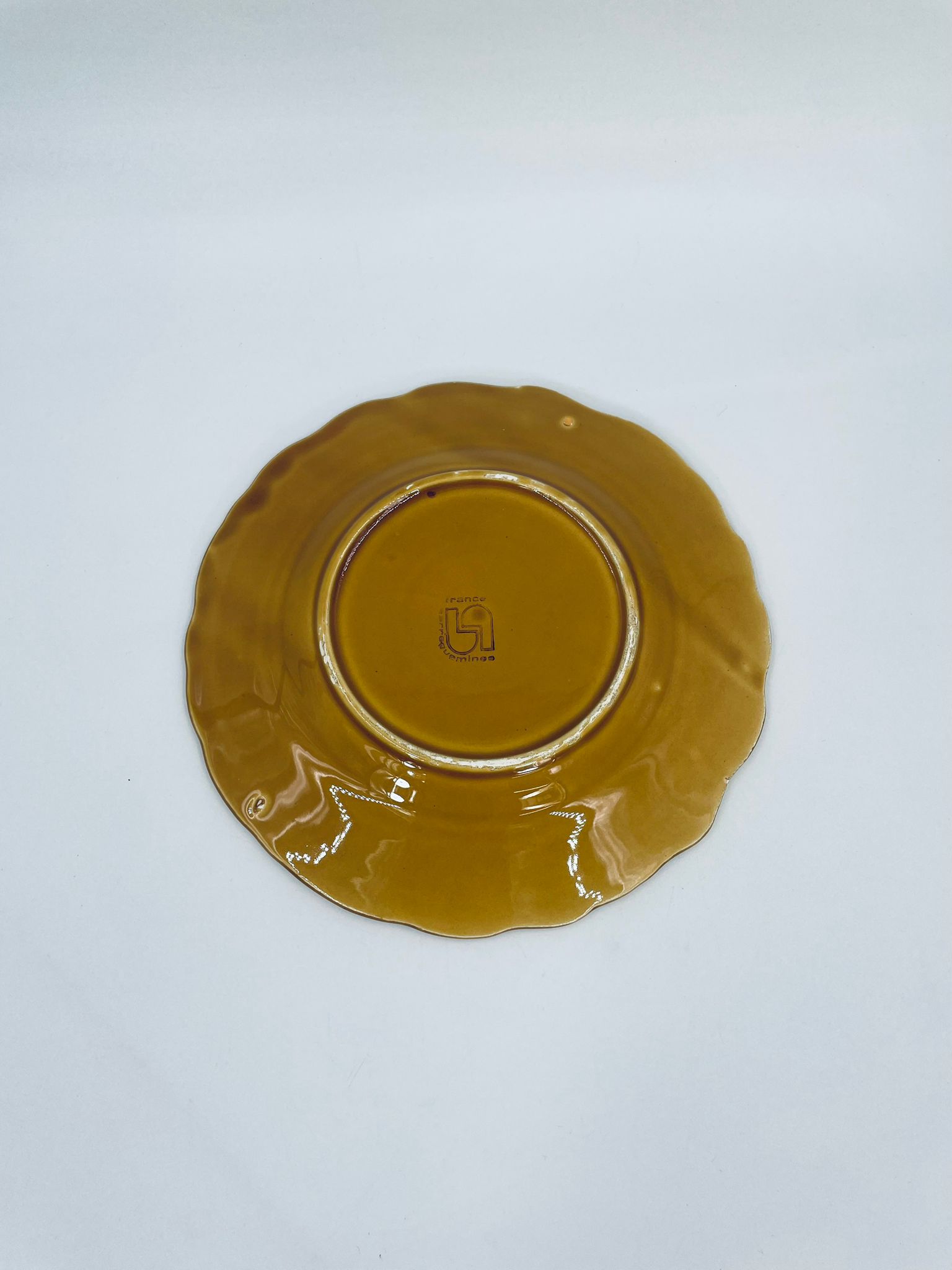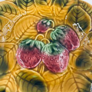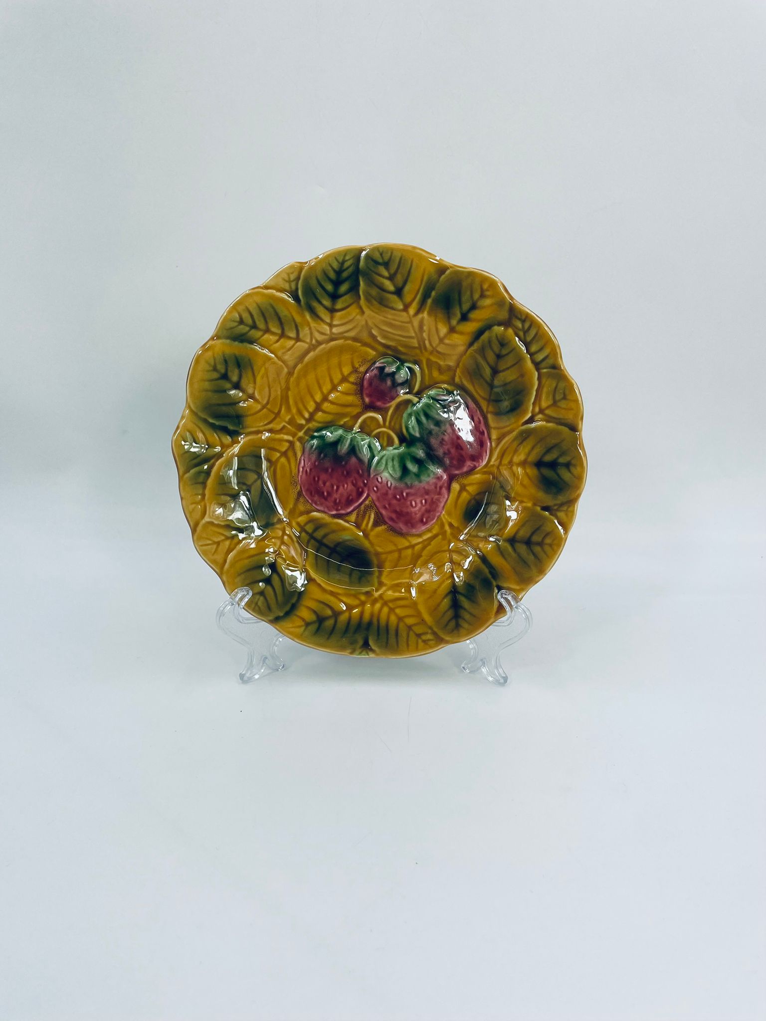 Decorative plate by the French Sarreguemines factory, made of mustard-coloured faience. The plate decorated with a relief pattern of strawberries surrounded by leaves, finished with a wavy rim. It has a crack in the glaze.