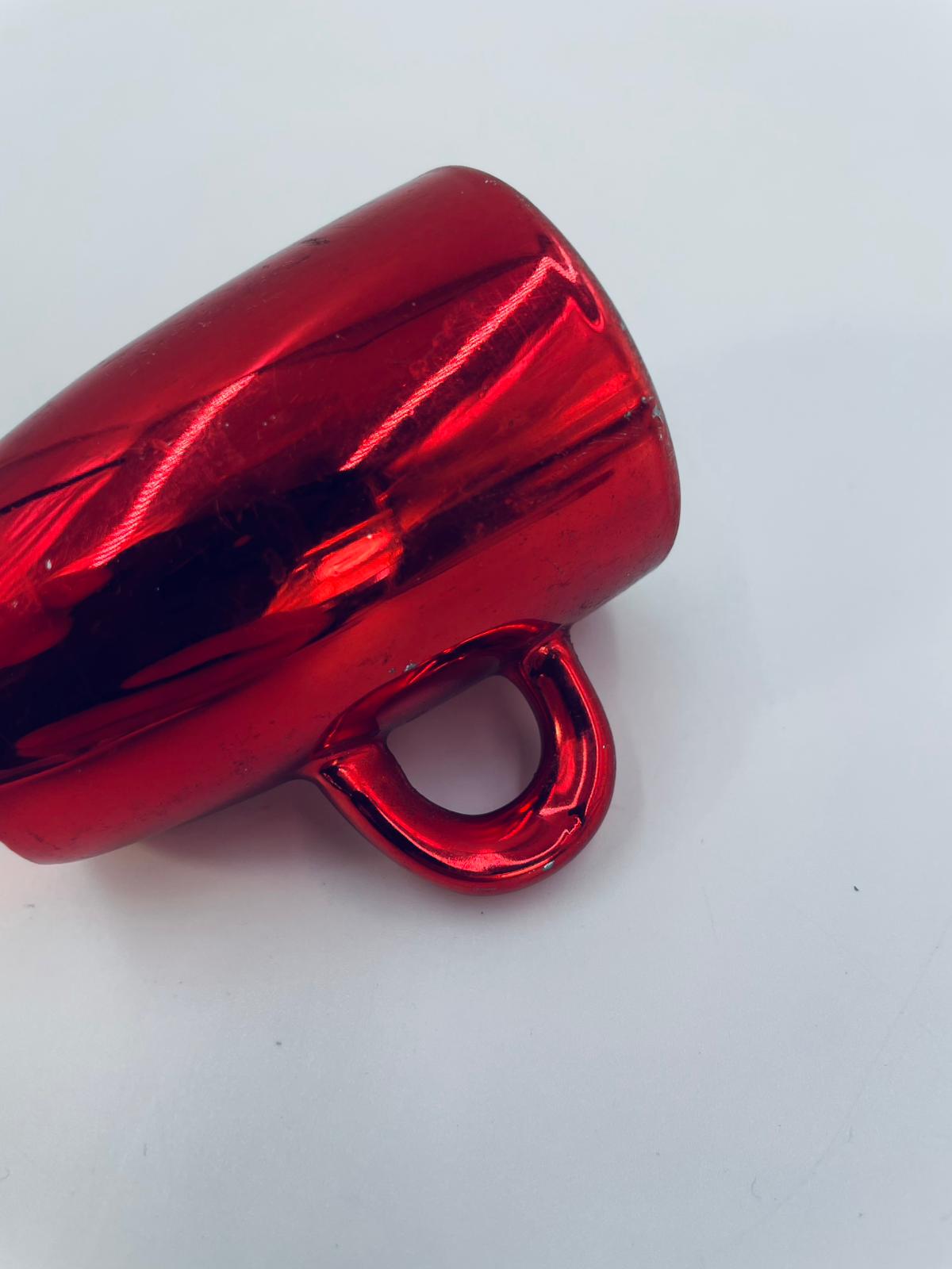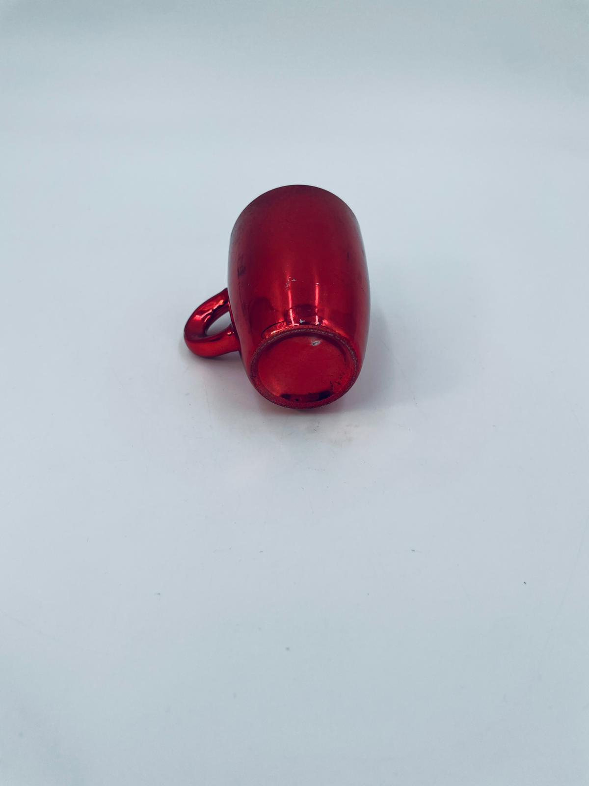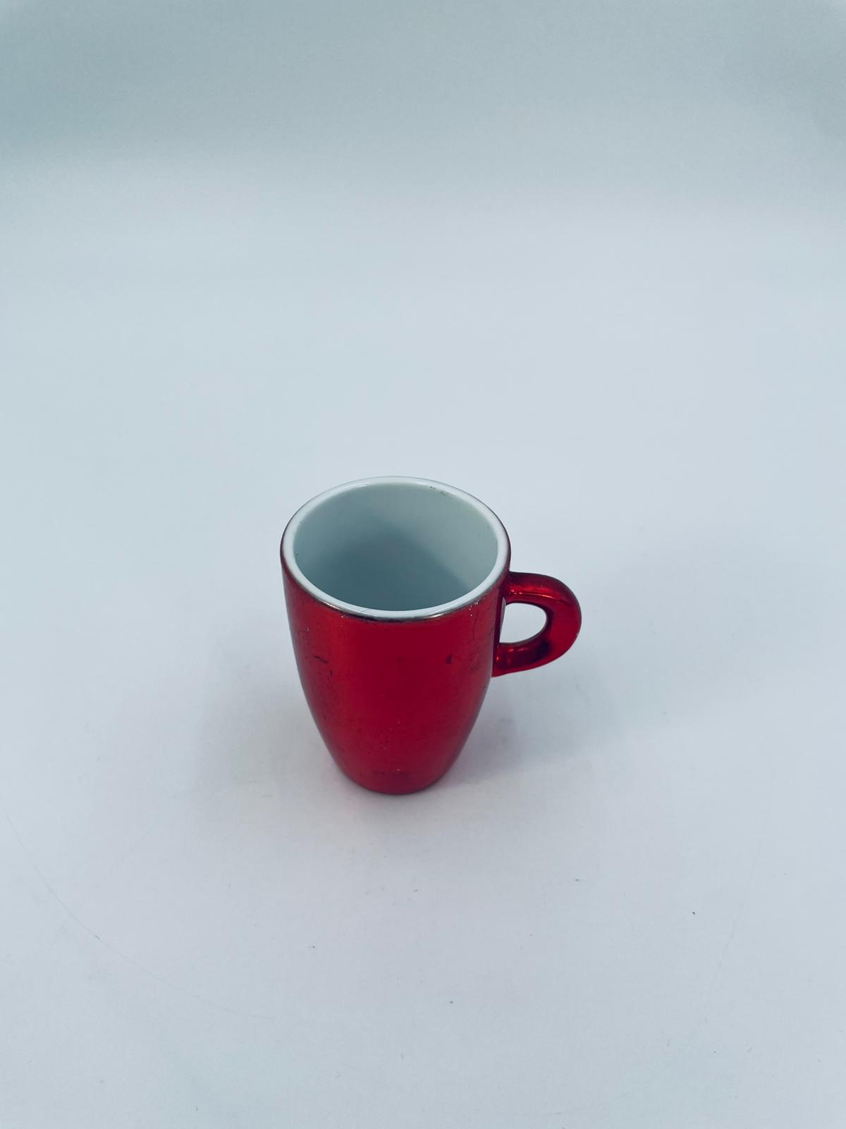 Mały kubeczek w stylu Vintage, wykonany z wysokiej jakości białej porcelany. Kubeczek klasyczny, barwiony z zewnątrz na czerwony kolor. Posiada przetarcie na kolorze.