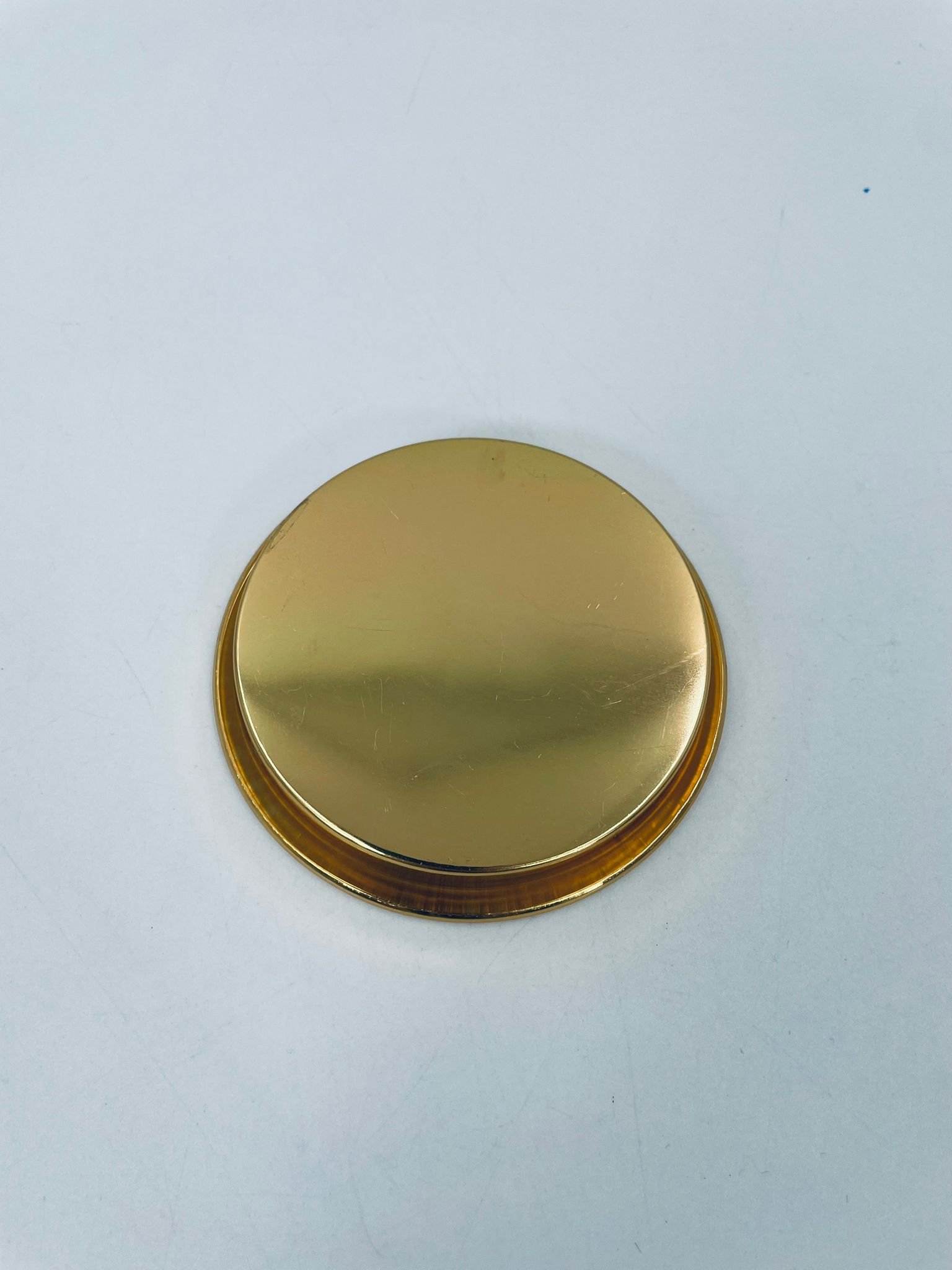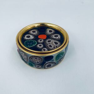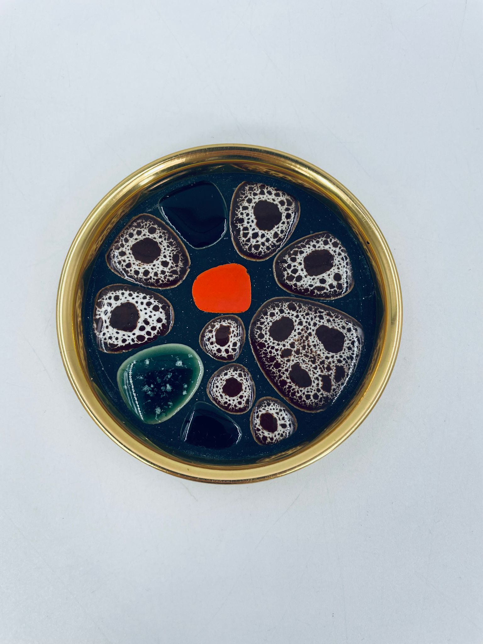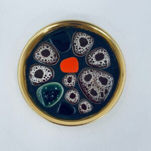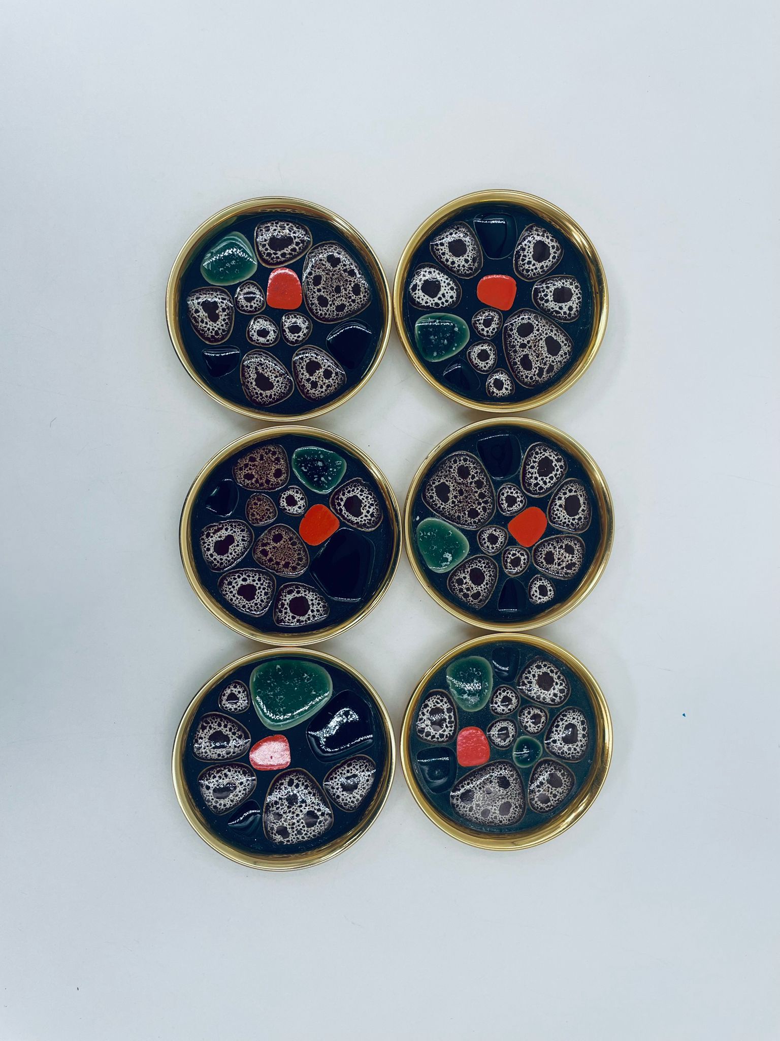 Round coasters with a metal frame in which different coloured elements are placed. The saucer can be used as a decoration or a utilitarian element.