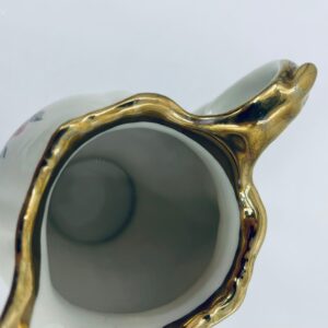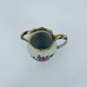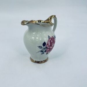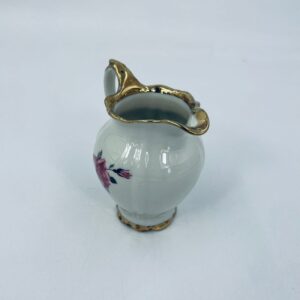 Dandelion by the Bareuther Waldsassen Bavaria factory. High-quality porcelain in ecru with a delicate floral pattern of pink roses on sprigs in black and grey. Pitcher finished with gilding on the rims. Delicate rubbing on the gilding.