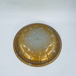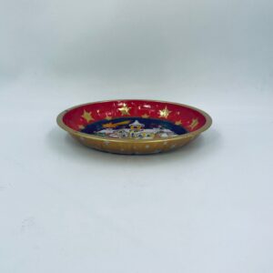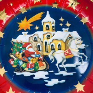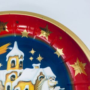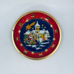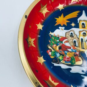 Misa dekoracyjna w stylu Vintage, wykonana ze stali nierdzewnej. Misa w granatowym kolorze i okrągłym kształcie, ozdobiona motywem Świętego Mikołaja jadącego saniami, zaprzężonymi w białego konia, na tle zimowego krajobrazu z domkiem i widoczną spadającą gwiazdą, wykończona złotym obramowaniem. Posiada przetarcie na złoceniu.