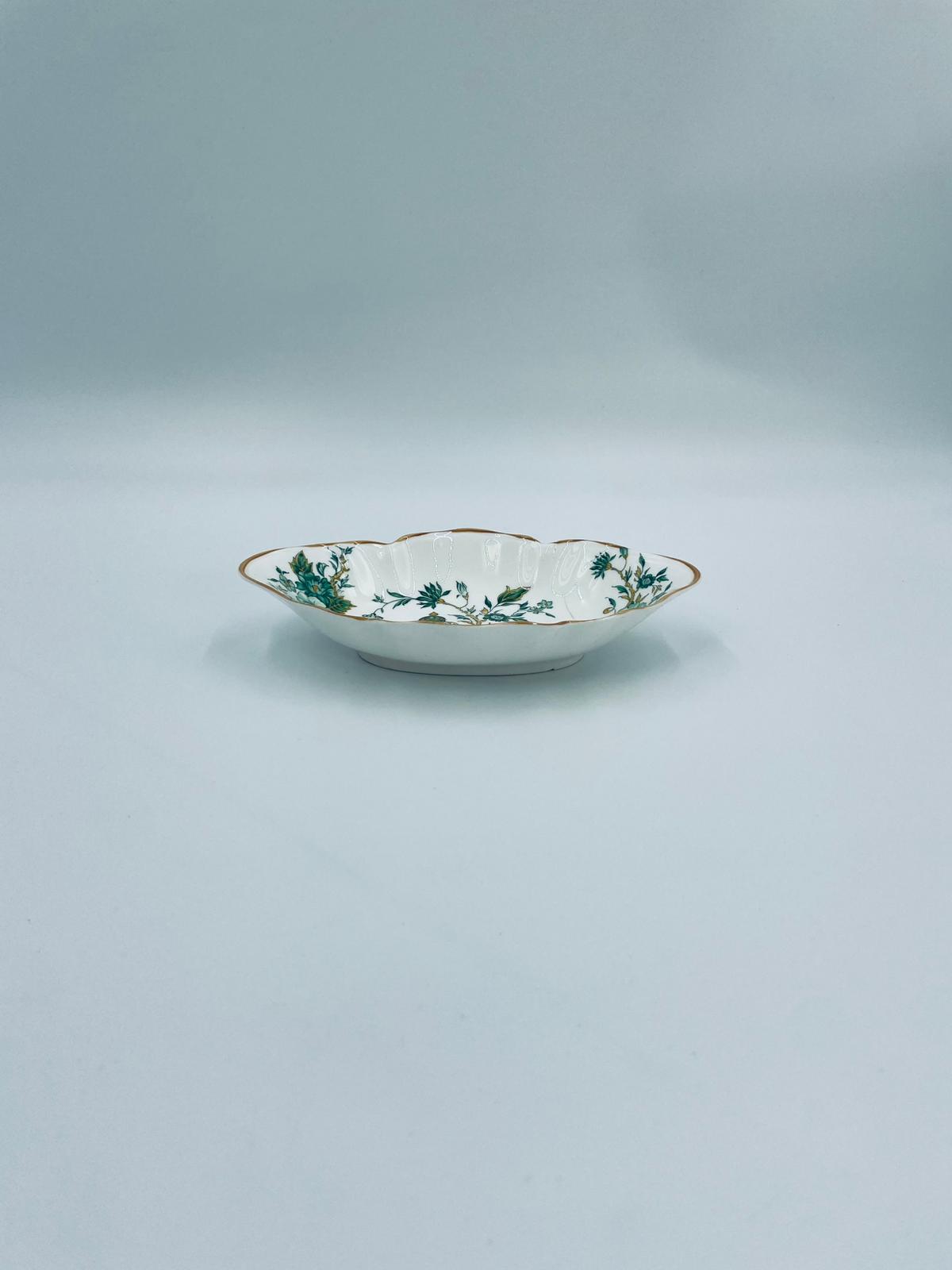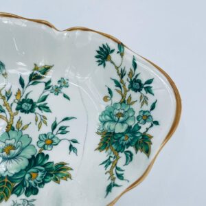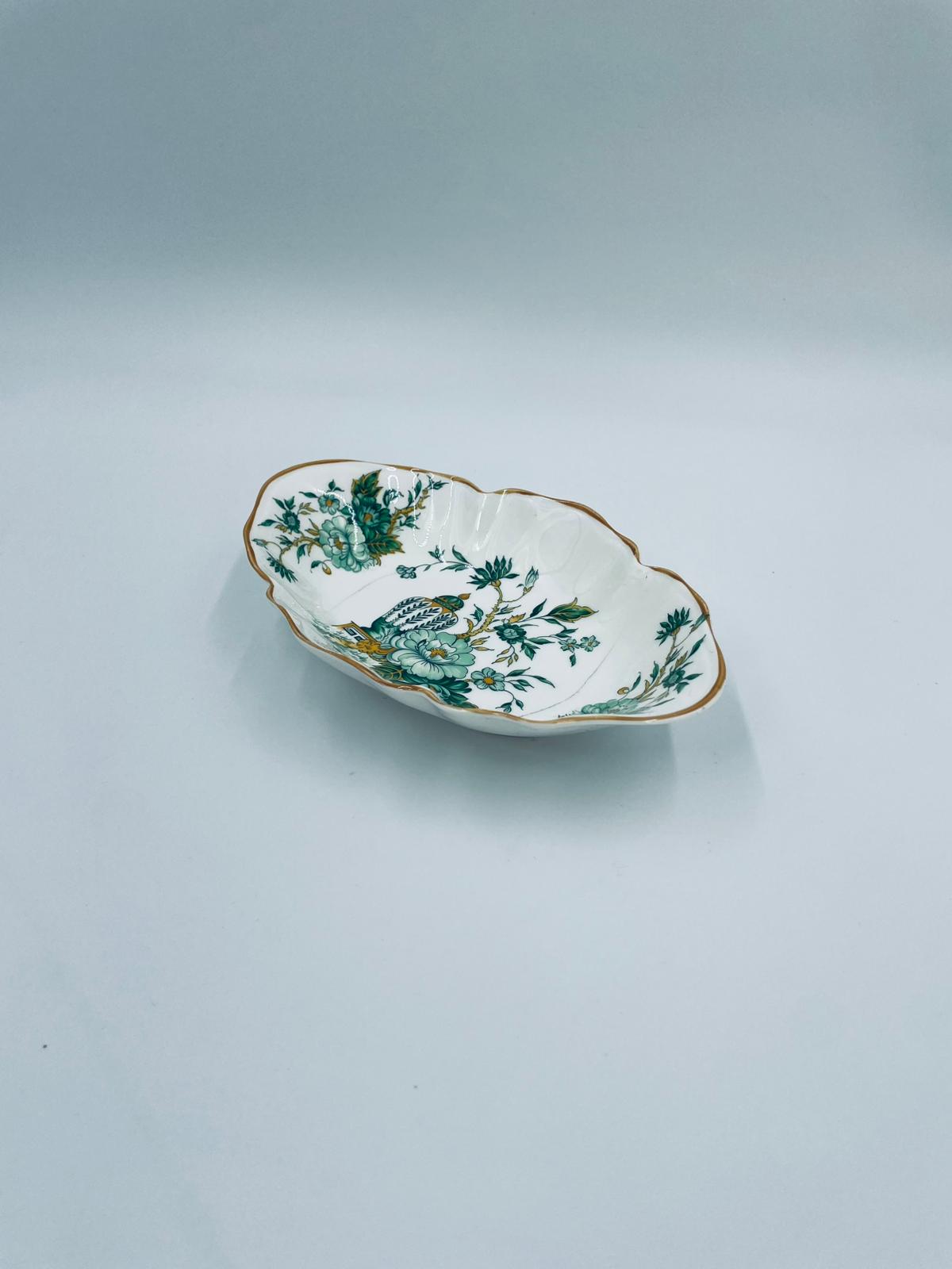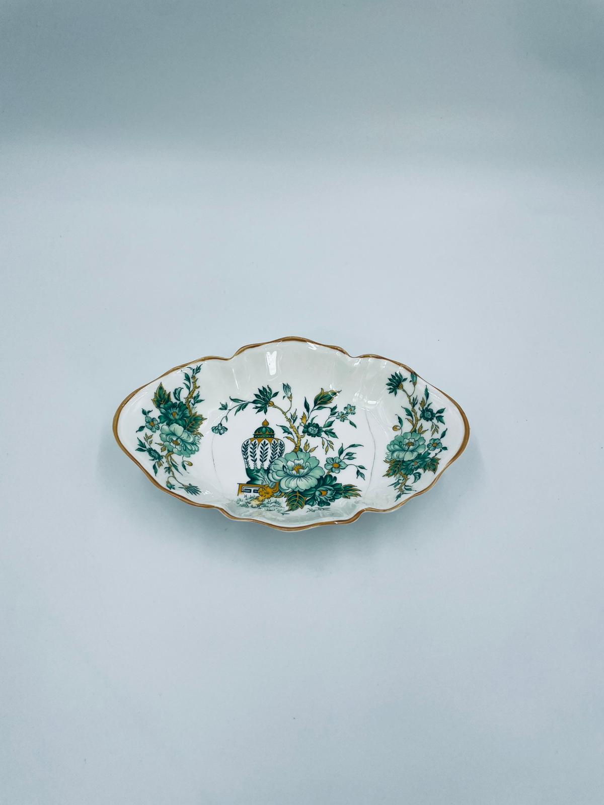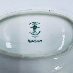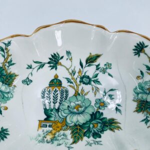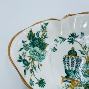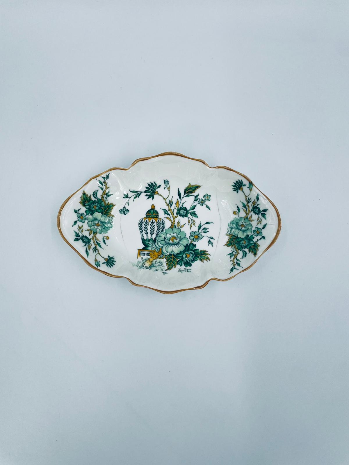 Misa, patera dekoracyjna, kolekcjonerska, wytwórni Crown Staffordshire, wykonana z wysokiej jakości białej porcelany kostnej. Patera ozdobiona wzorem „Kowloon” z motywem kwiatów i amforki, wykończona złotą obwódką na falistym brzegu. Posiada pęknięcie.