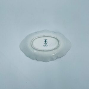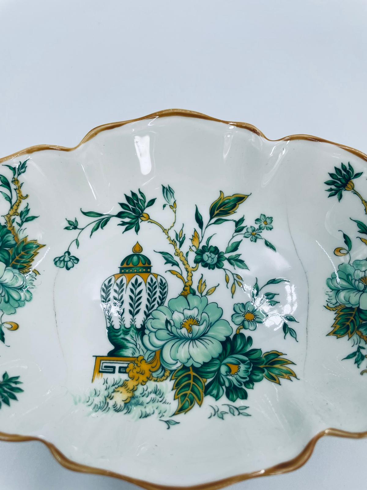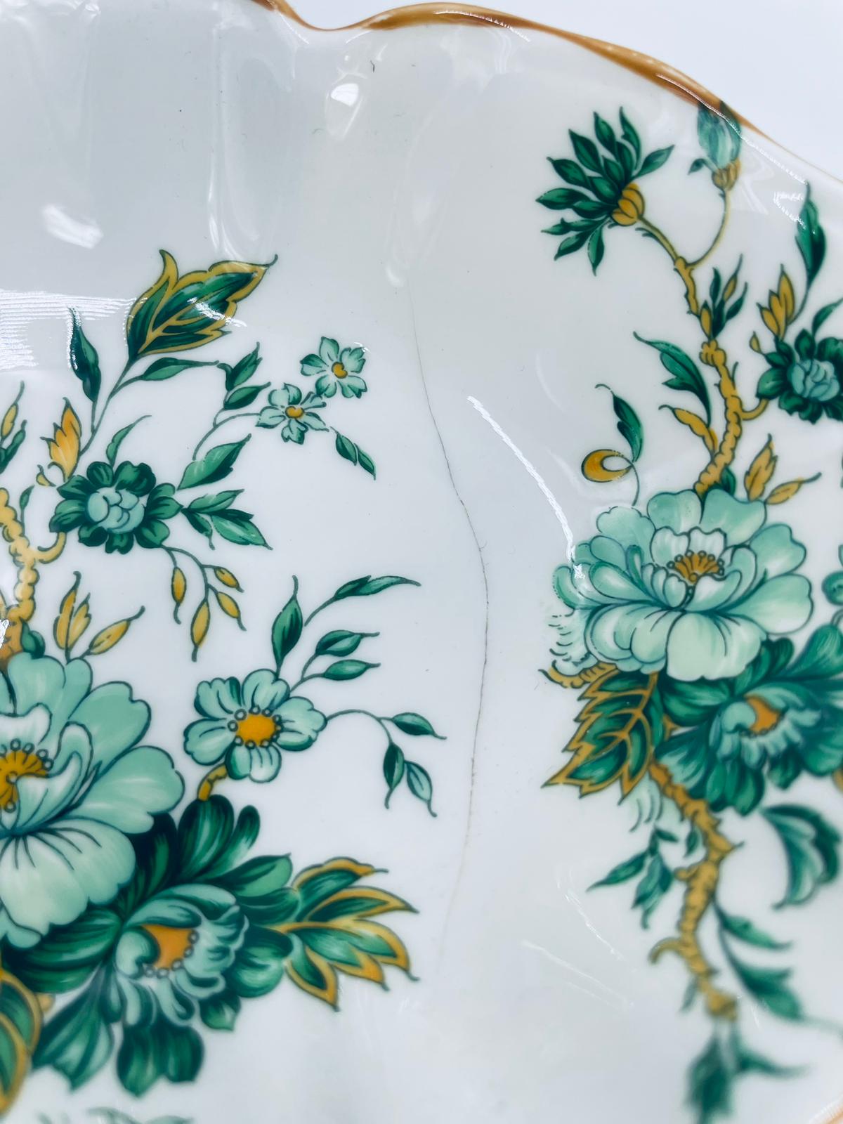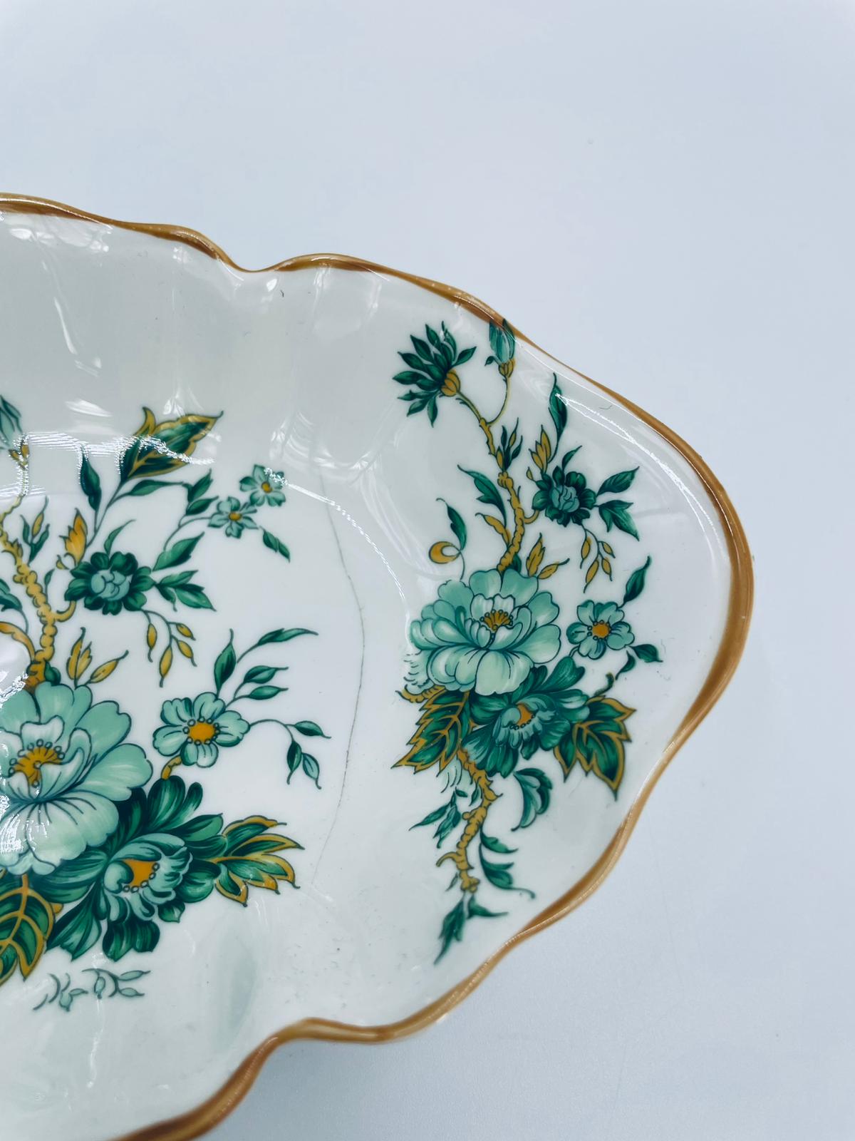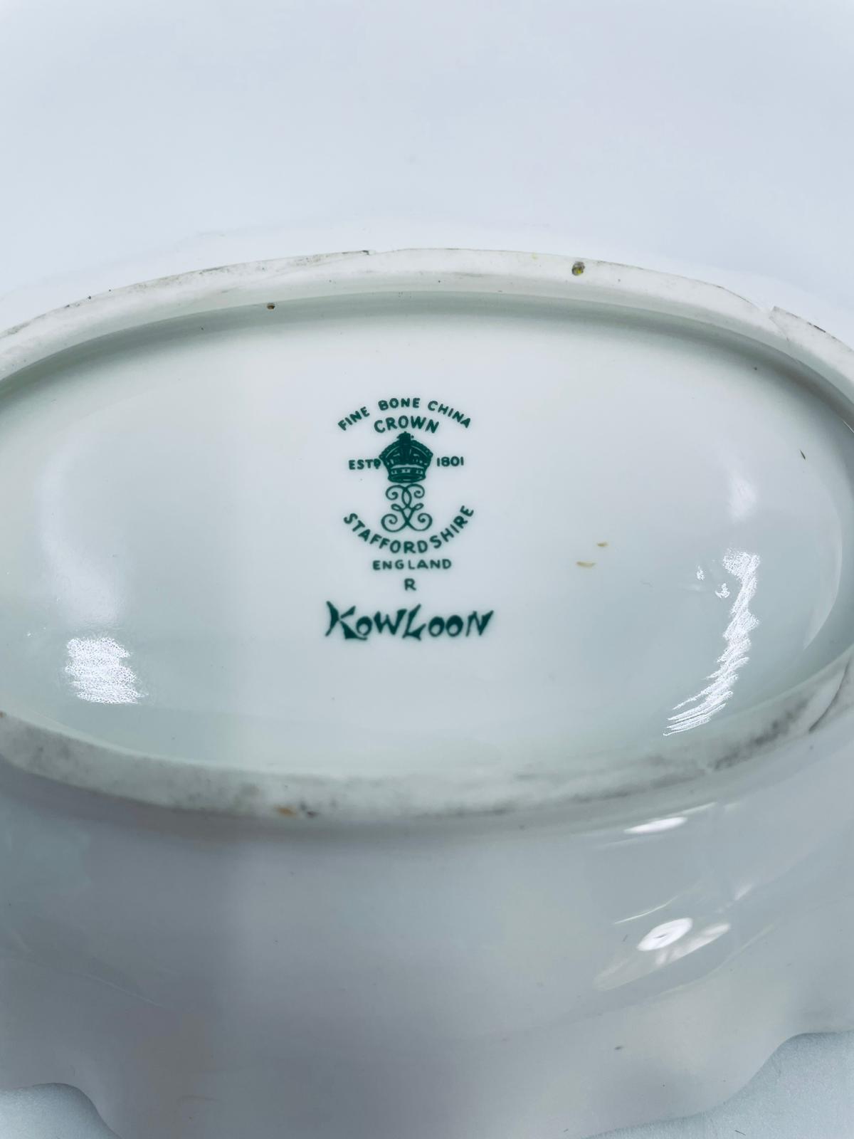 Misa, patera dekoracyjna, kolekcjonerska, wytwórni Crown Staffordshire, wykonana z wysokiej jakości białej porcelany kostnej. Patera ozdobiona wzorem „Kowloon” z motywem kwiatów i amforki, wykończona złotą obwódką na falistym brzegu. Posiada pęknięcie.