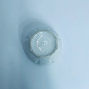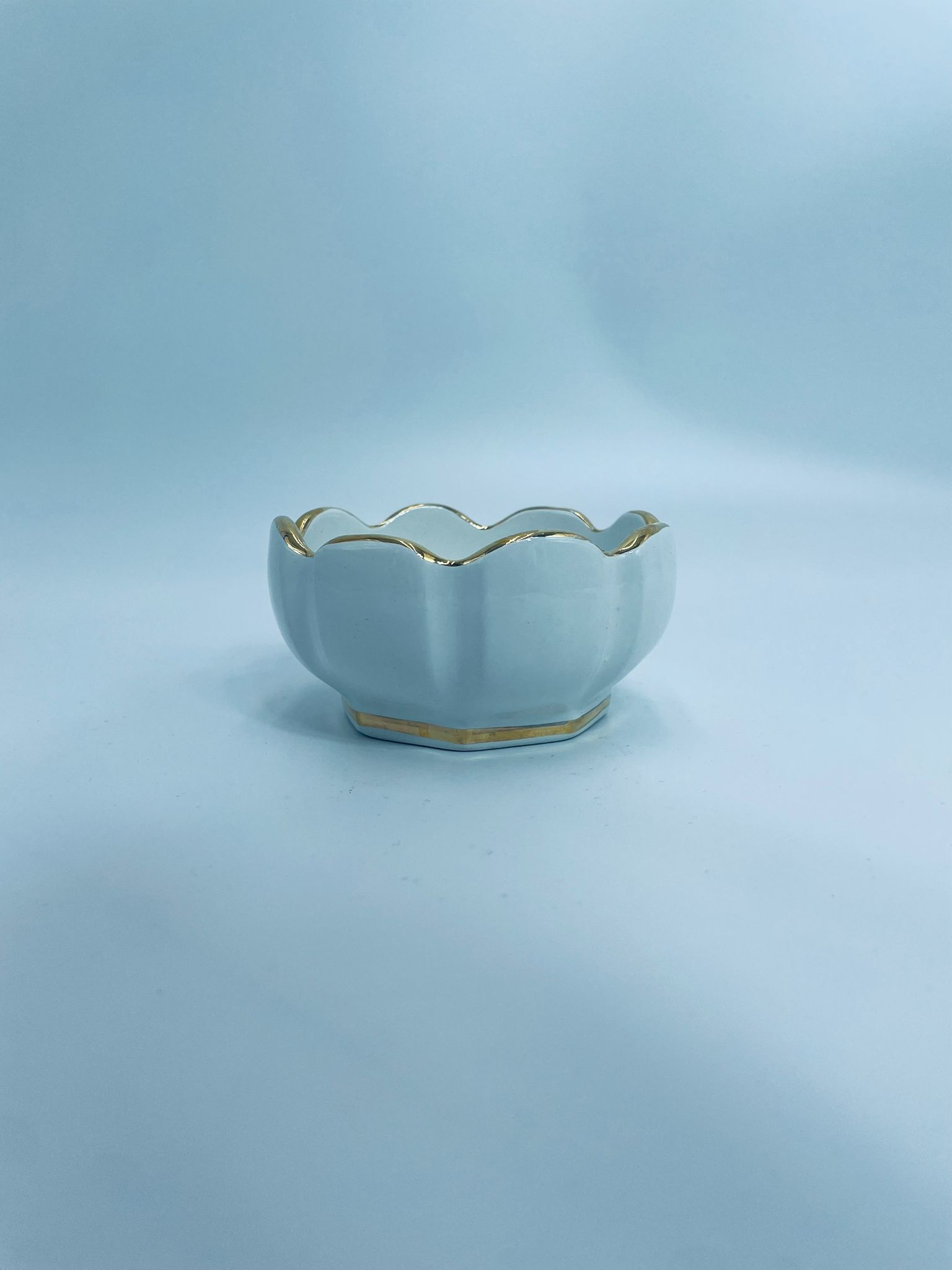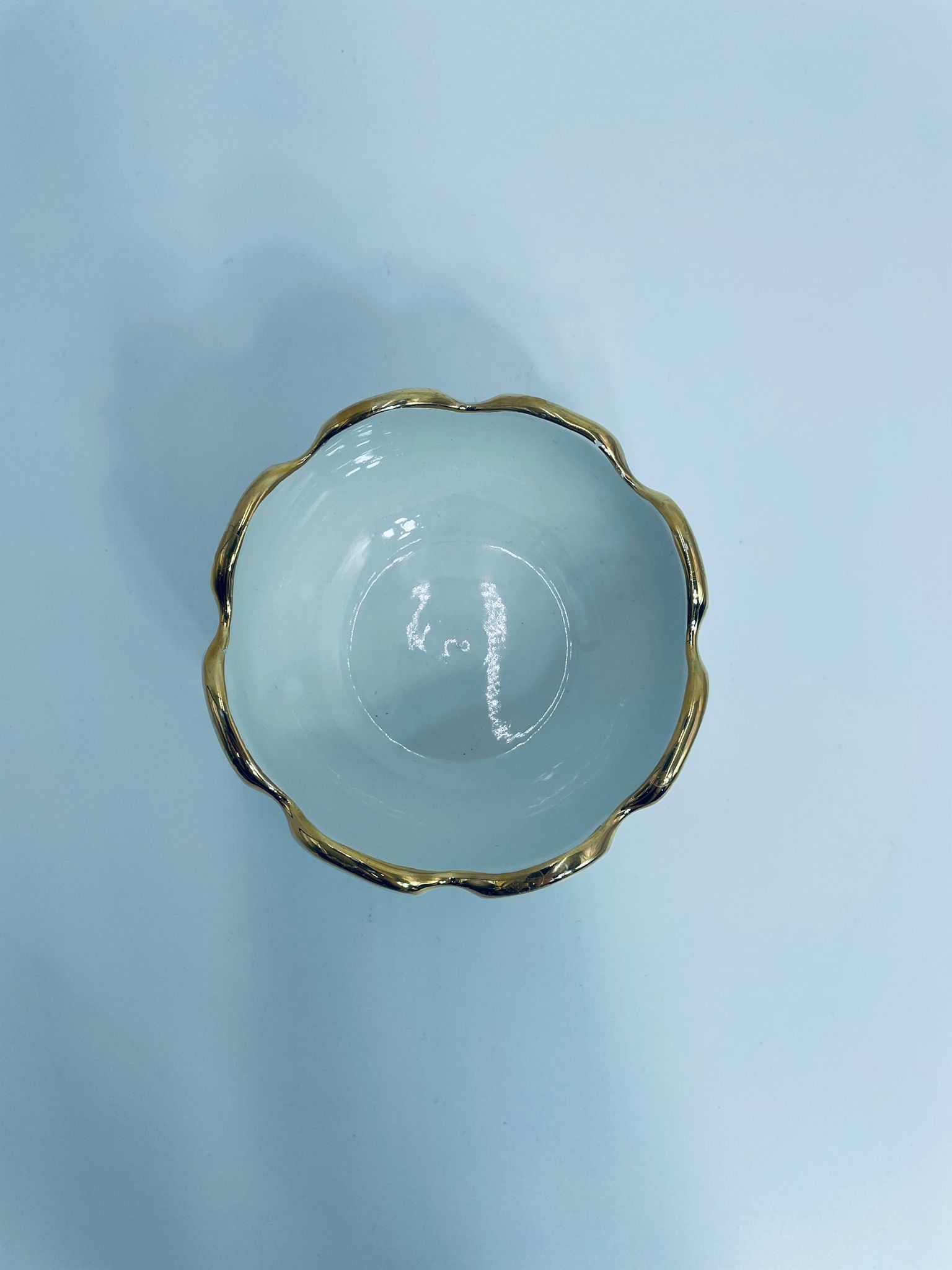 Misa, salaterka, cukiernica Włoska w stylu Vintage, wykonana z wysokiej jakości białej porcelany. Misa charakteryzuje się falistą górną krawędzią, stylizowana na kształt kwiata, wykończona złoceniem. Posiada odpryski na złoceniu.