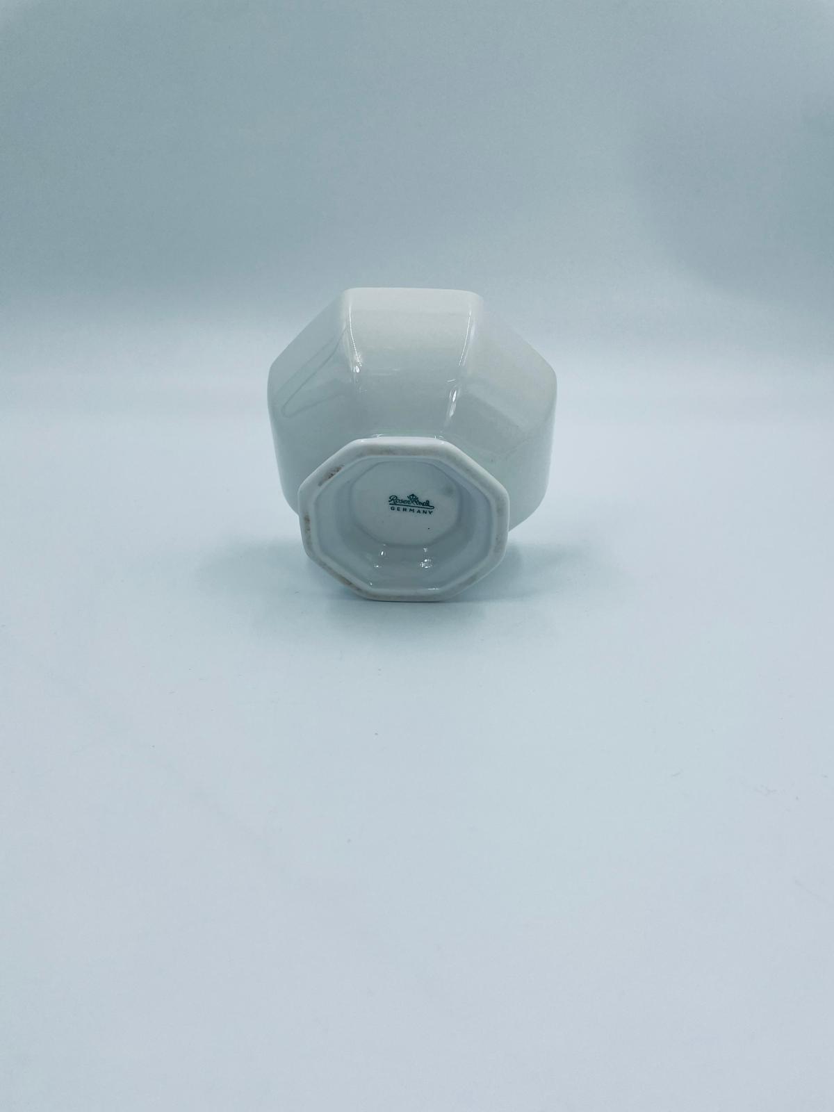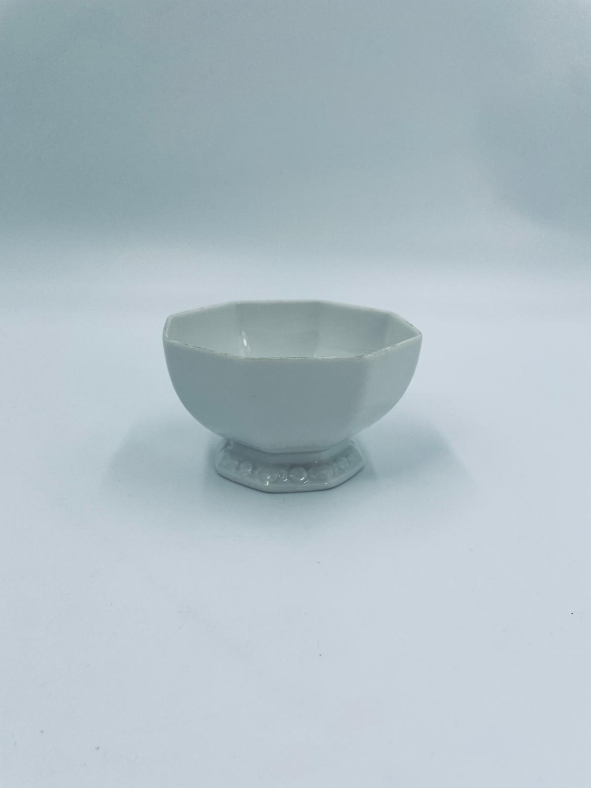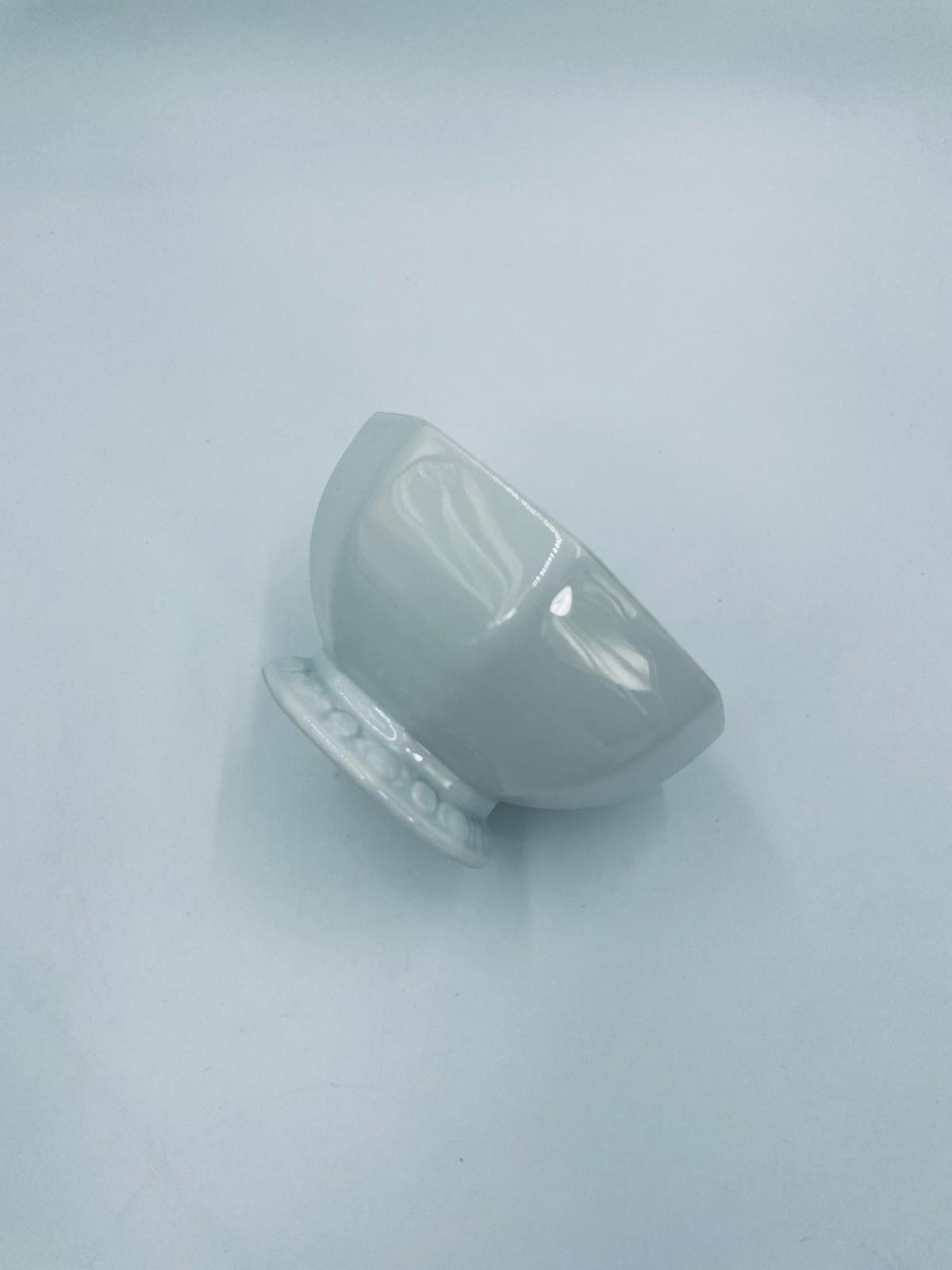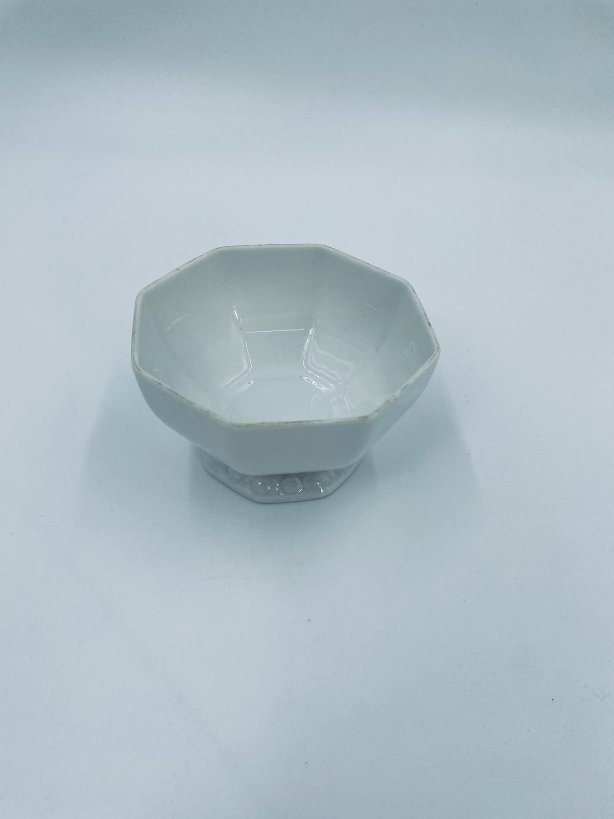 Miseczka na nóżce, cukiernica renomowanej wytwórni Rosenthal, z kolekcji Biała Maria zaprojektowana przez Philipa Rosenthala w 1916r, wykonana z najwyższej jakości białej porcelany. Miseczka charakteryzująca się eleganckim, ośmiokątnym kształtem, klasyczna, zdobiona subtelnym kwiatowym reliefem na krawędzi. Posiada przetarcie na rancie.