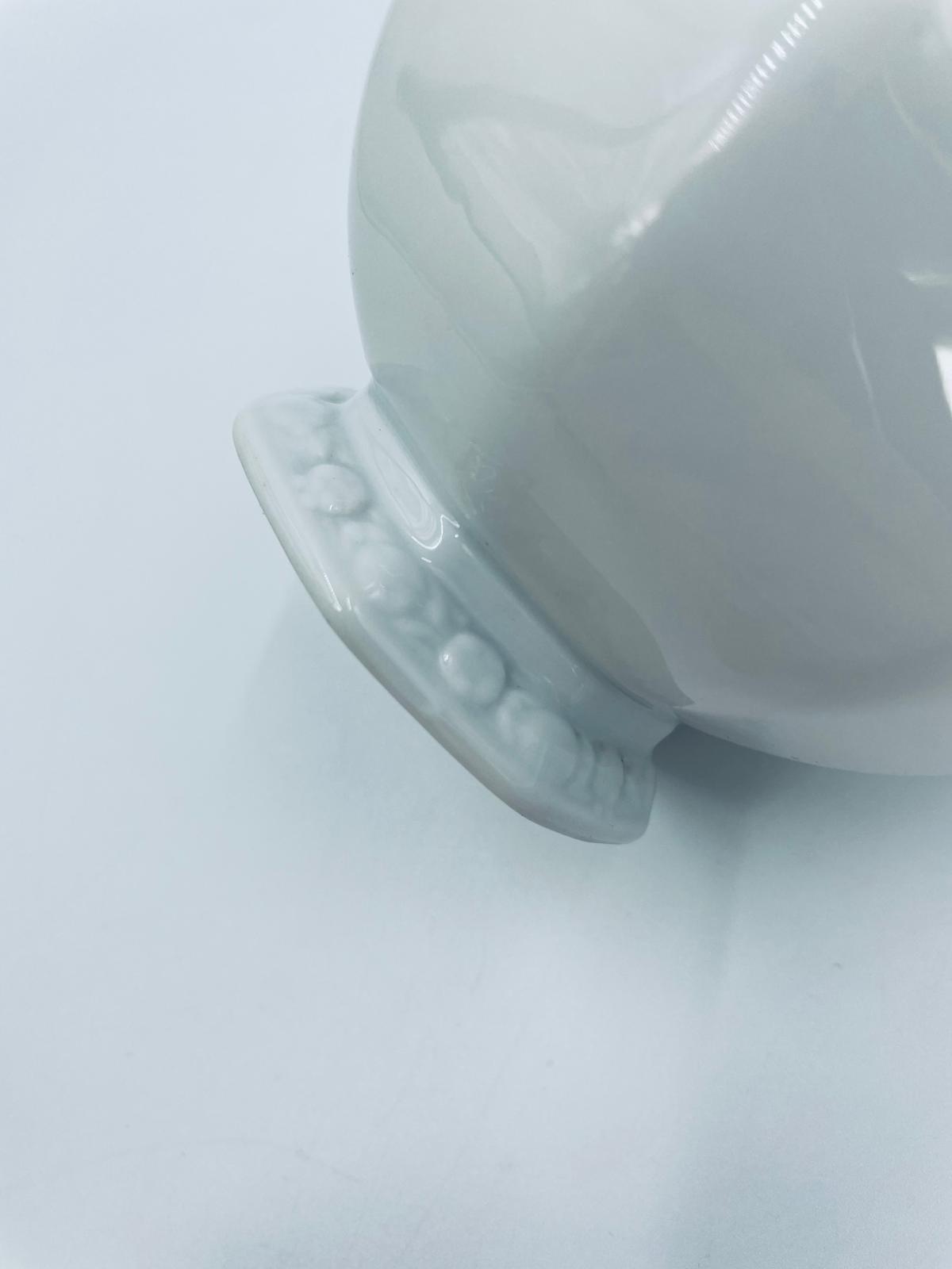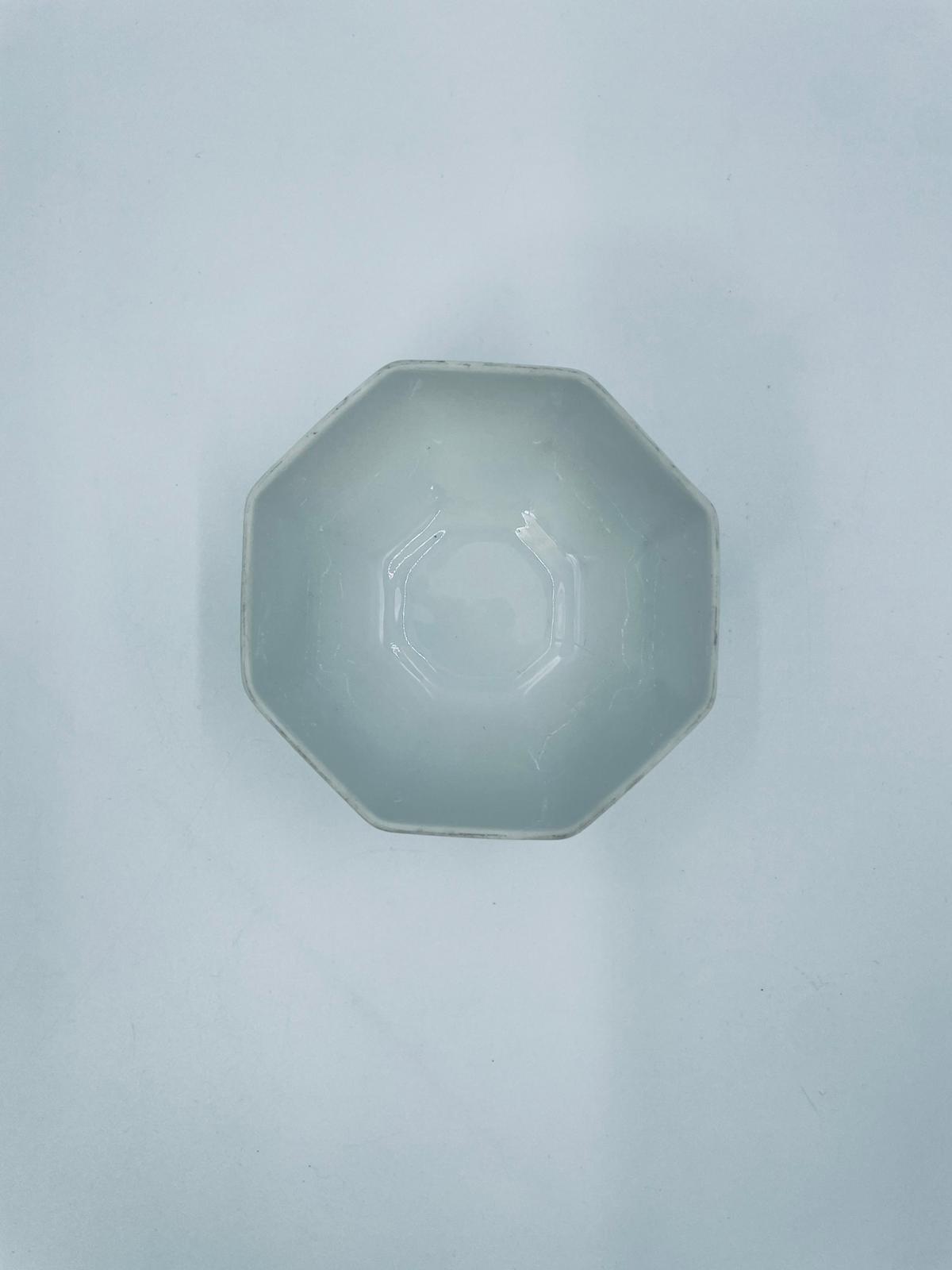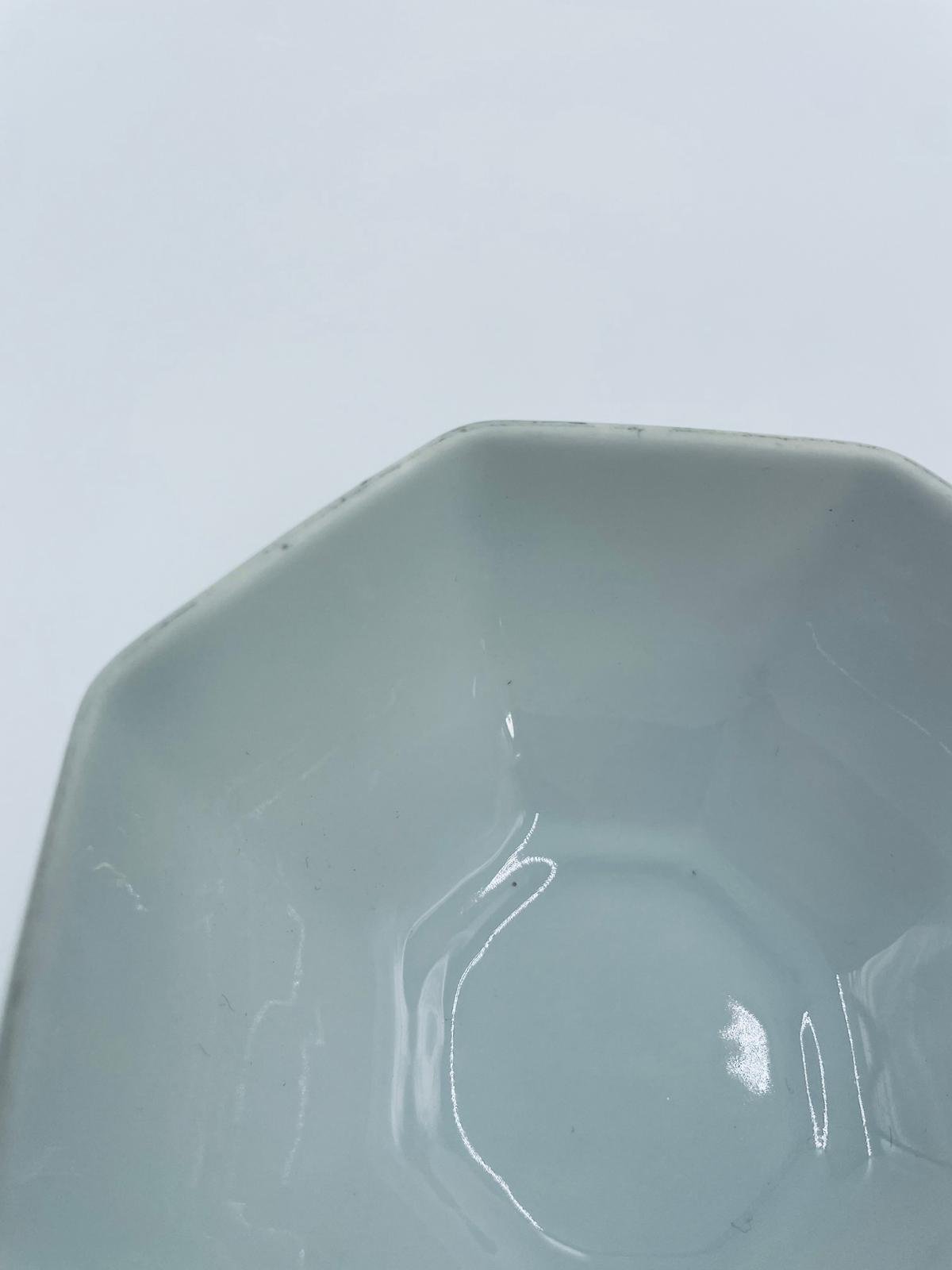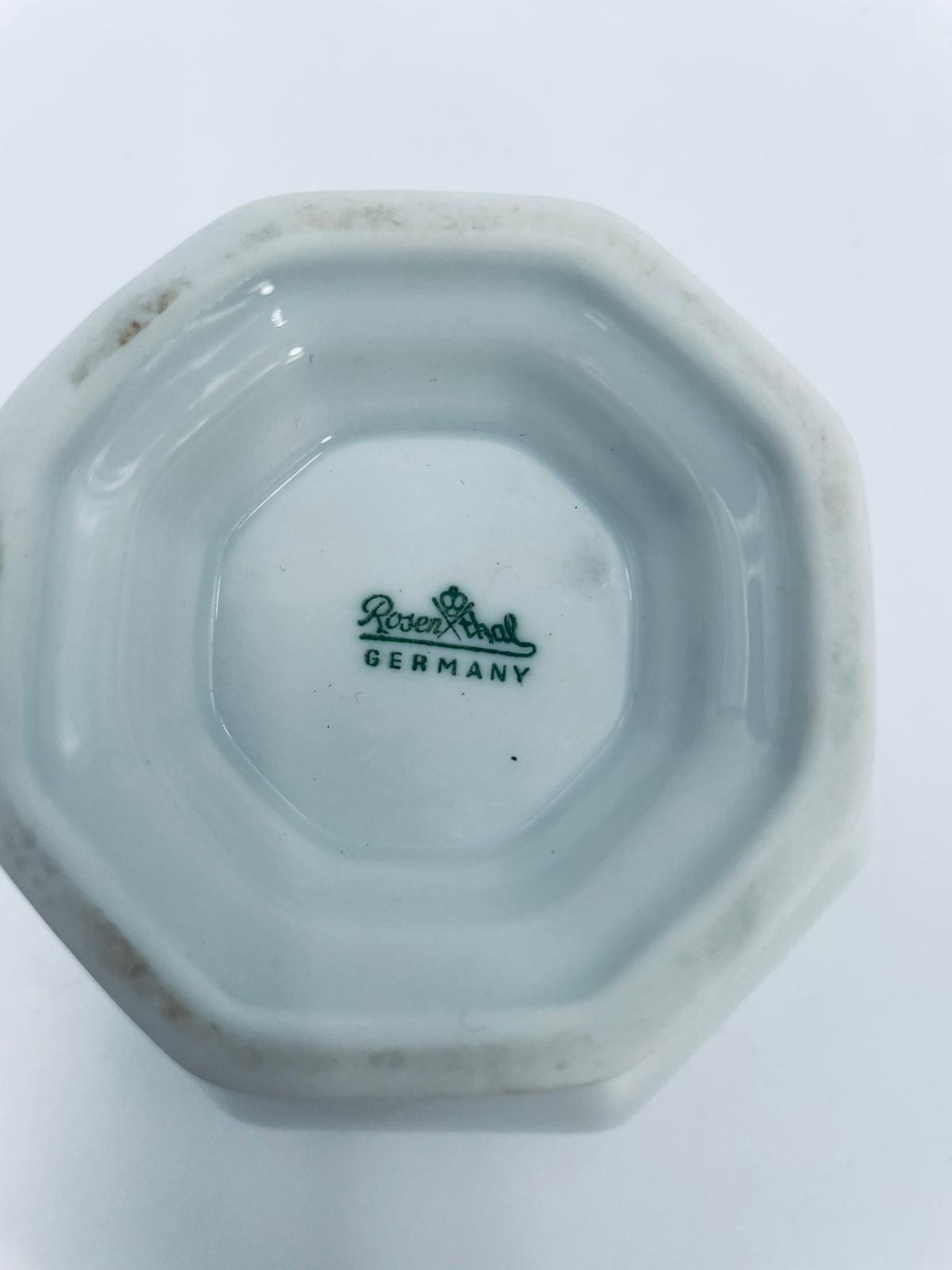 Miseczka na nóżce, cukiernica renomowanej wytwórni Rosenthal, z kolekcji Biała Maria zaprojektowana przez Philipa Rosenthala w 1916r, wykonana z najwyższej jakości białej porcelany. Miseczka charakteryzująca się eleganckim, ośmiokątnym kształtem, klasyczna, zdobiona subtelnym kwiatowym reliefem na krawędzi. Posiada przetarcie na rancie.