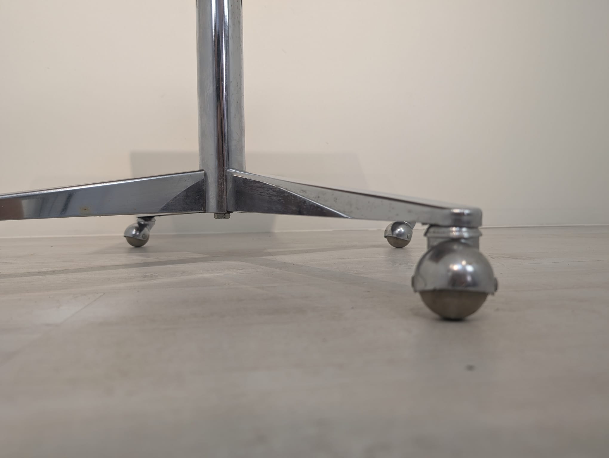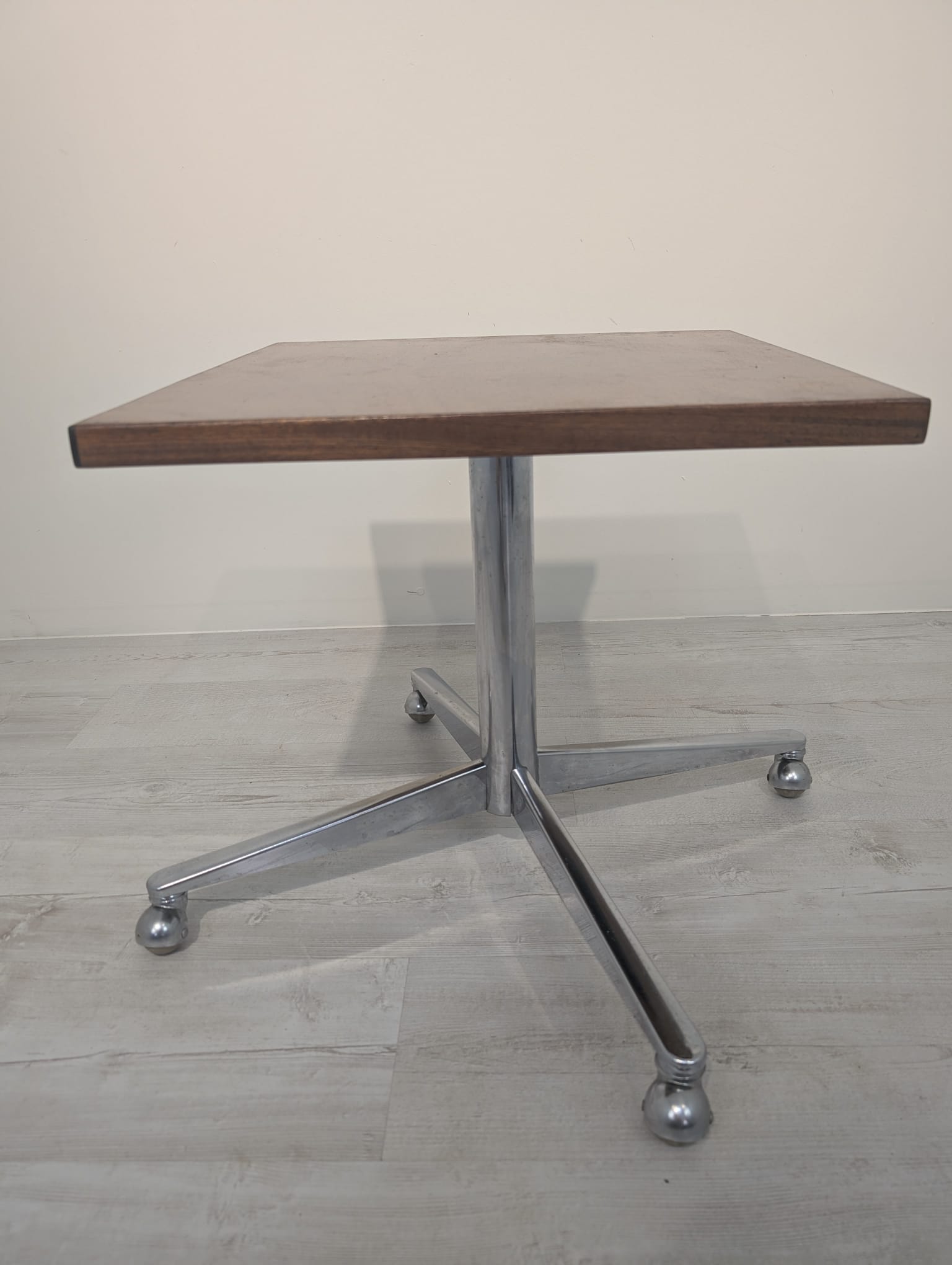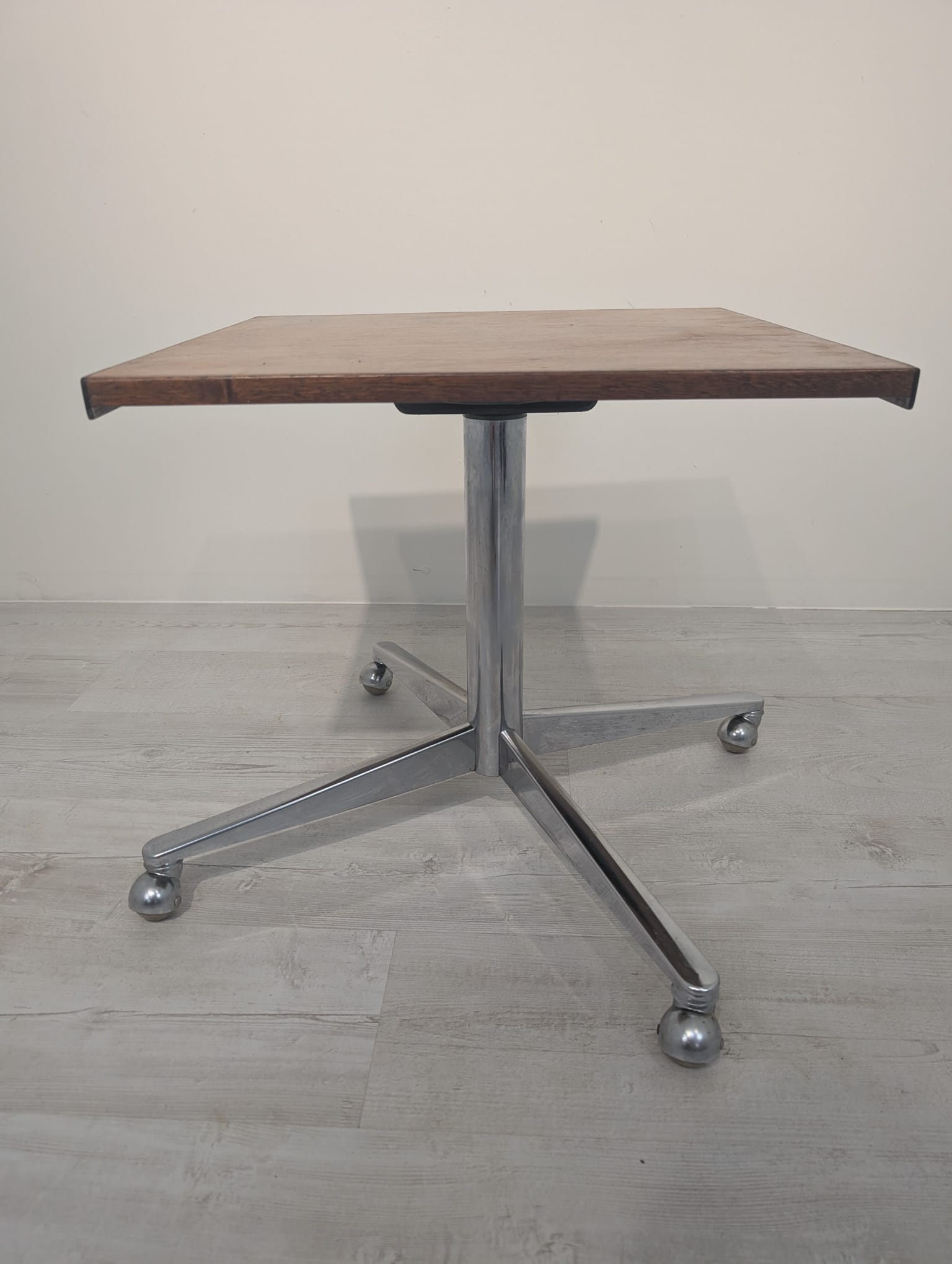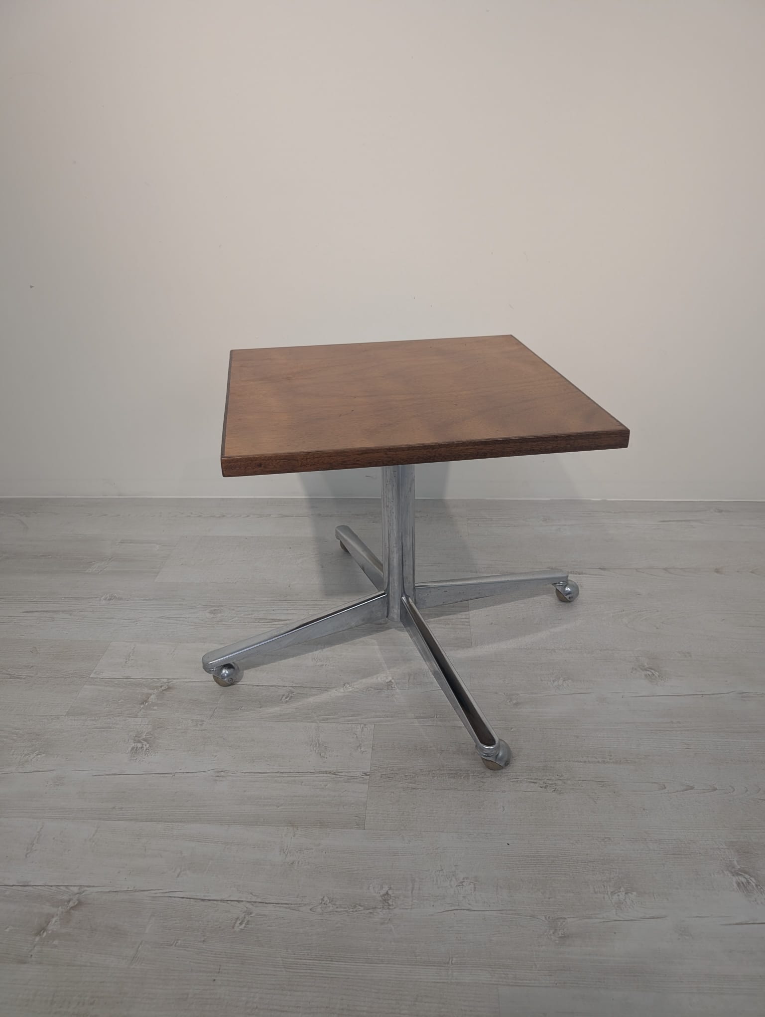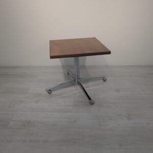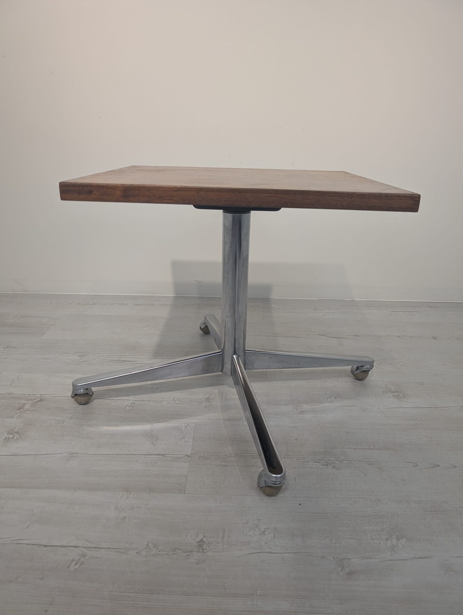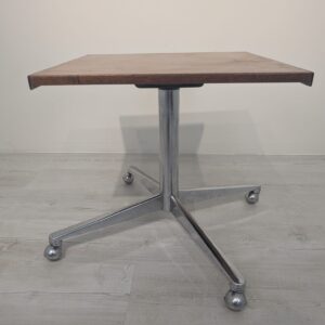 A wooden auxiliary table with chrome legs, dating from the mid-20th century. Its solid construction and practical design make it a functional piece of furniture that can be used in various rooms.