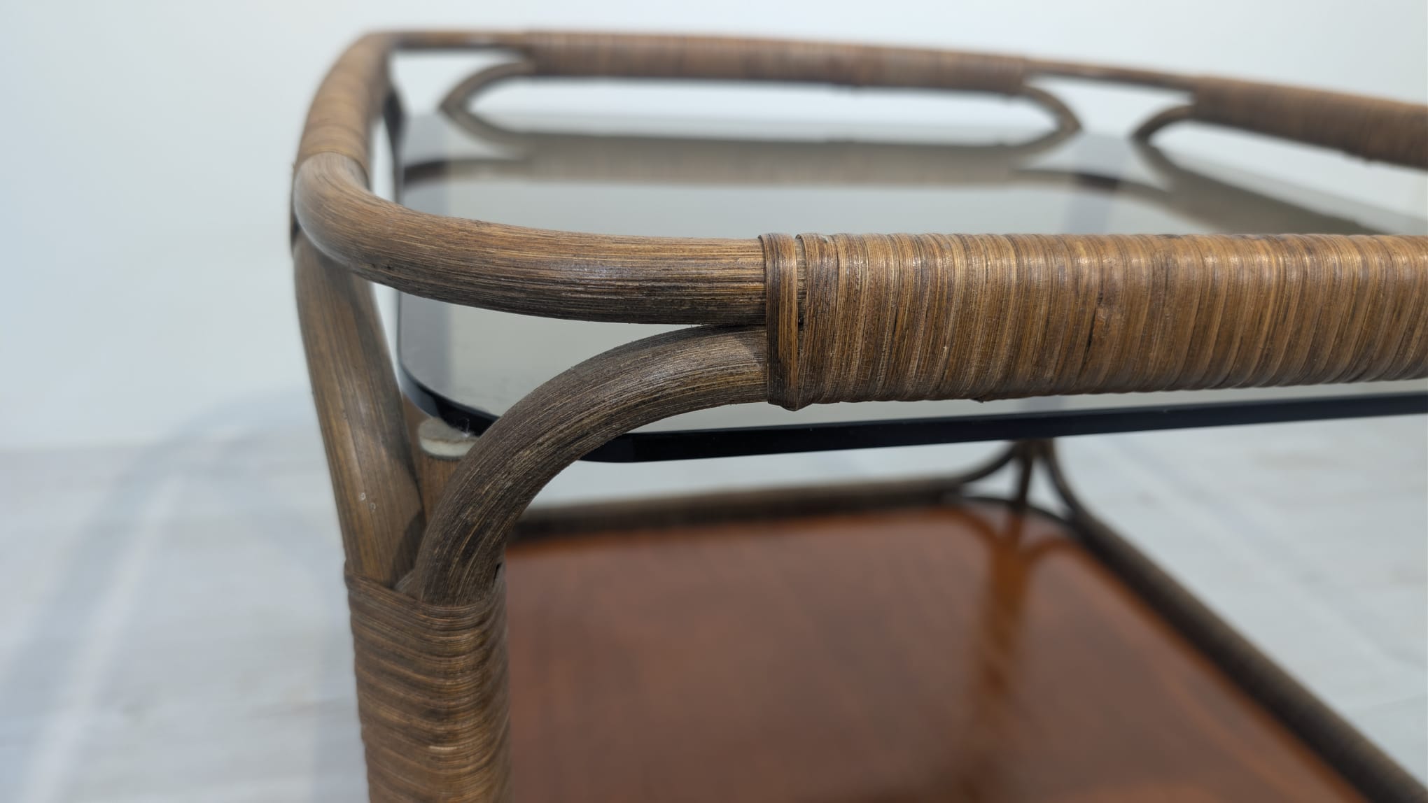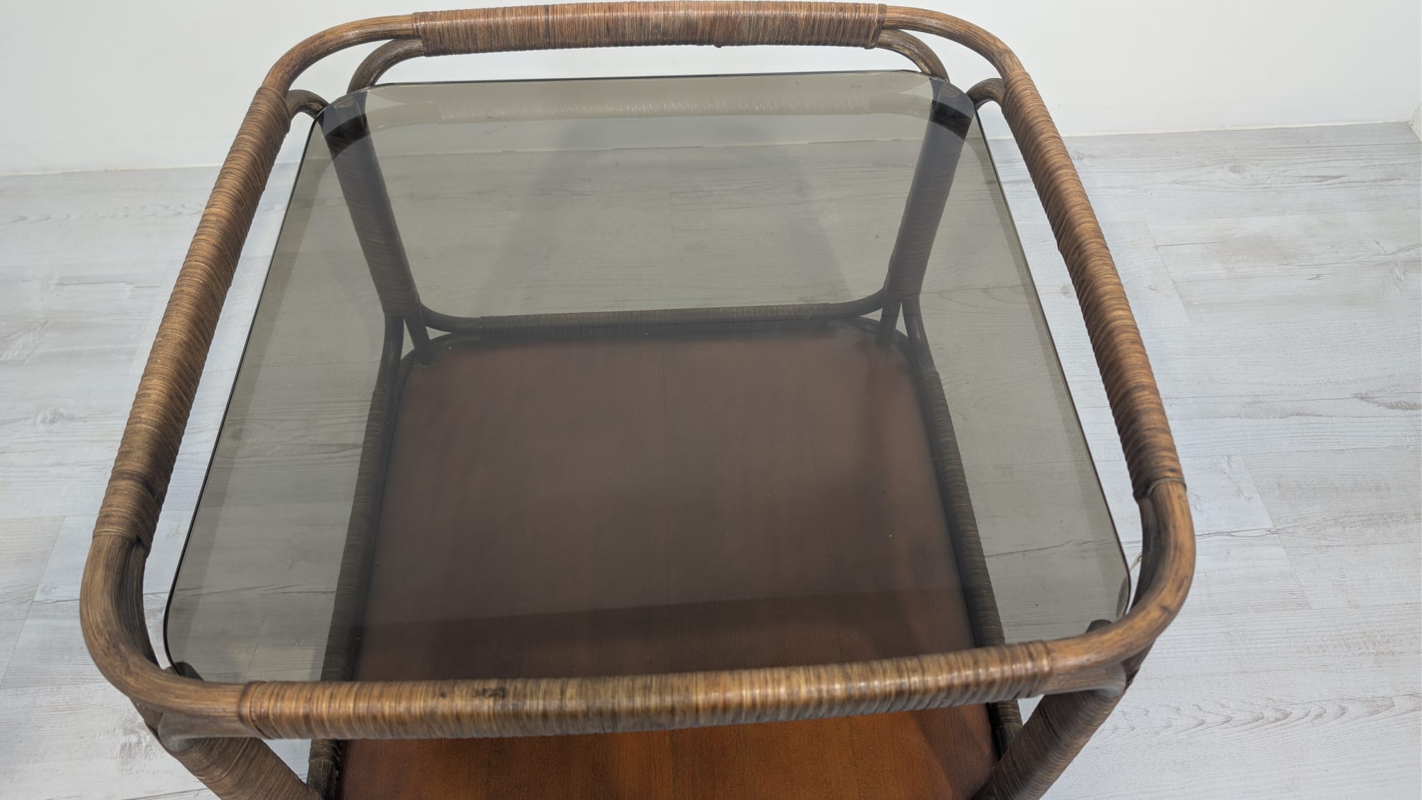 A stylish rattan coffee table from the 1970s in Italy. The piece has two shelves, one thick smoked glass, allowing for convenient storage of items. The rattan construction gives it a natural and elegant look, suitable for various interior designs.
